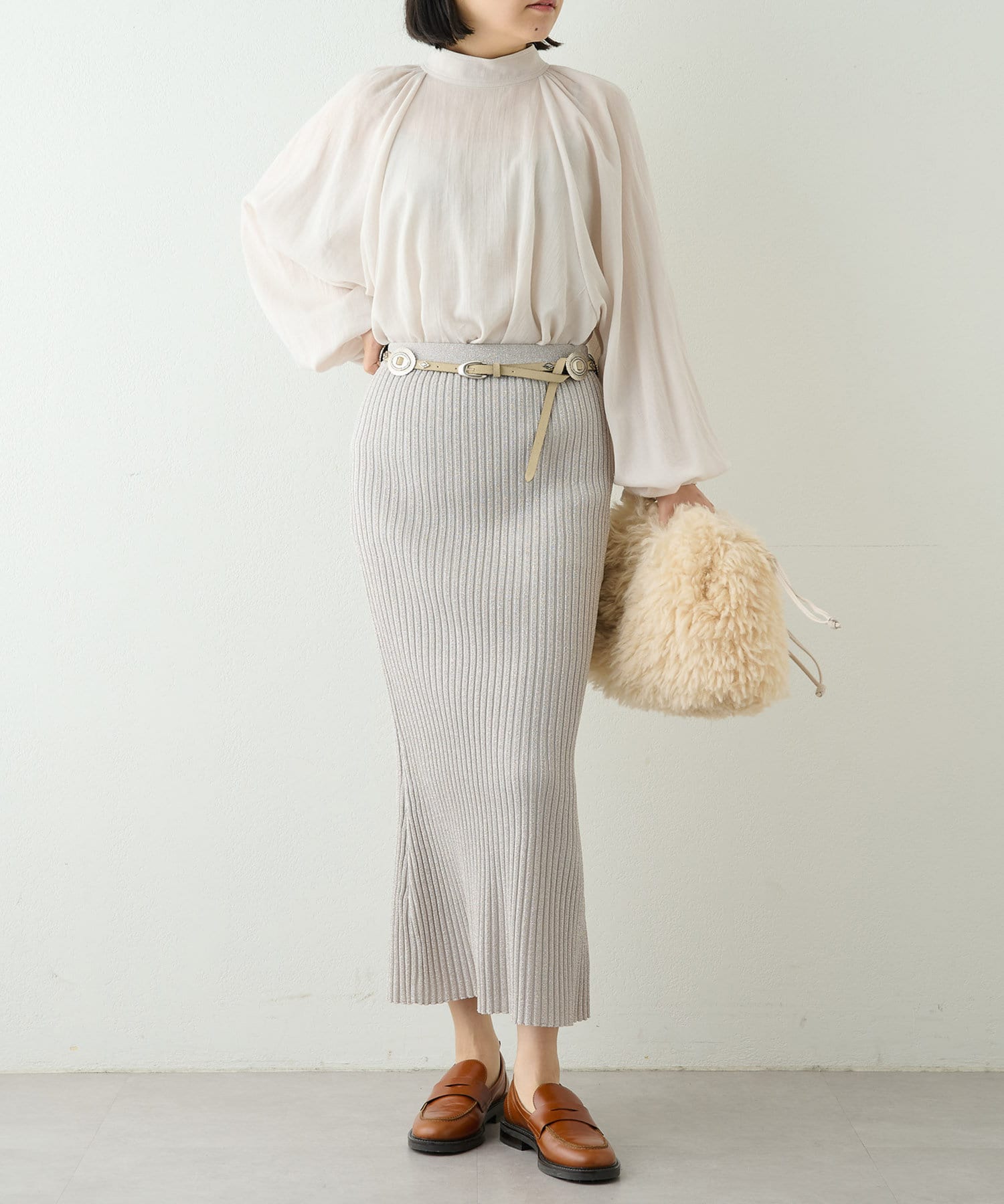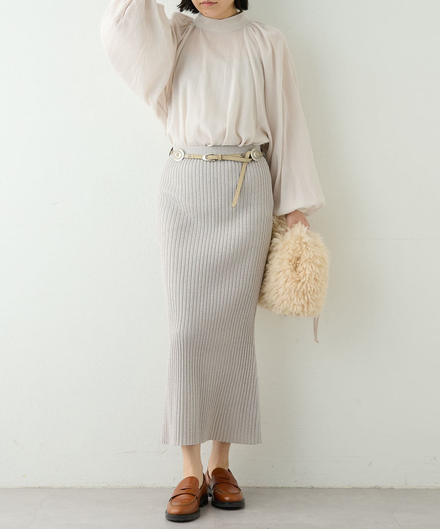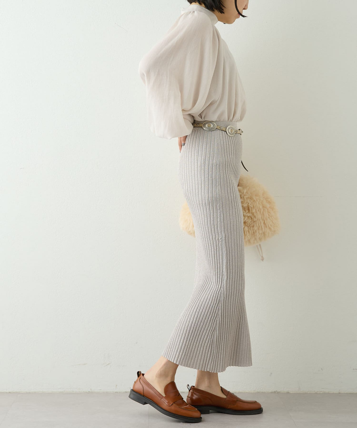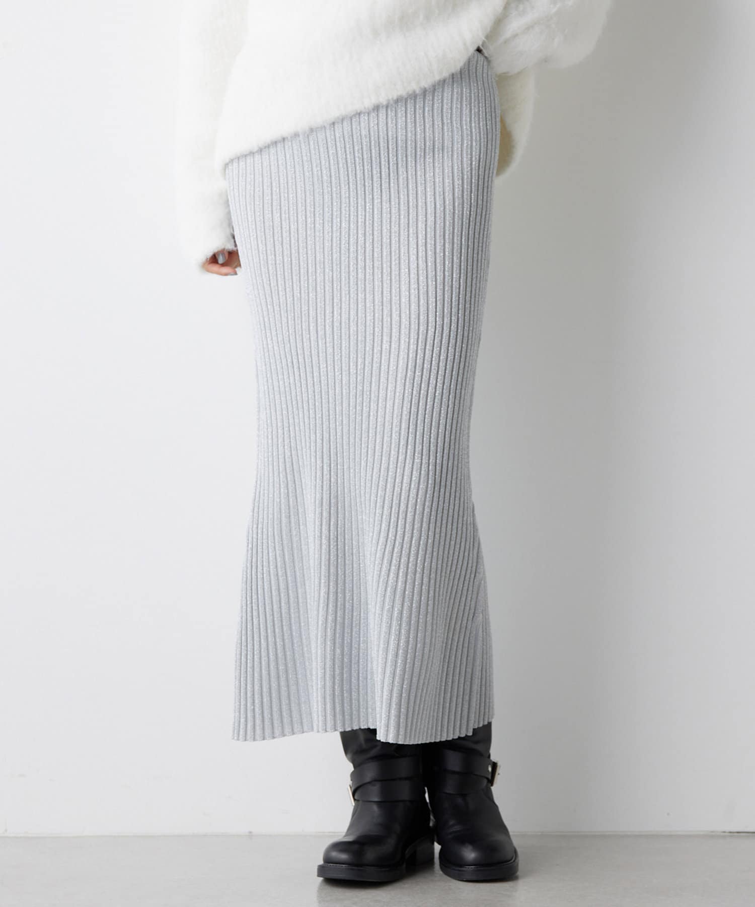 ウィムガゼットの名品、ニットフィットスカートから、ラメバージョンが登場。体のラインを拾いますので、ラインが気になる方は長めの丈のトップス合わせがおすすめ。インナーがついておりますので、心地よくお使いいただけます。