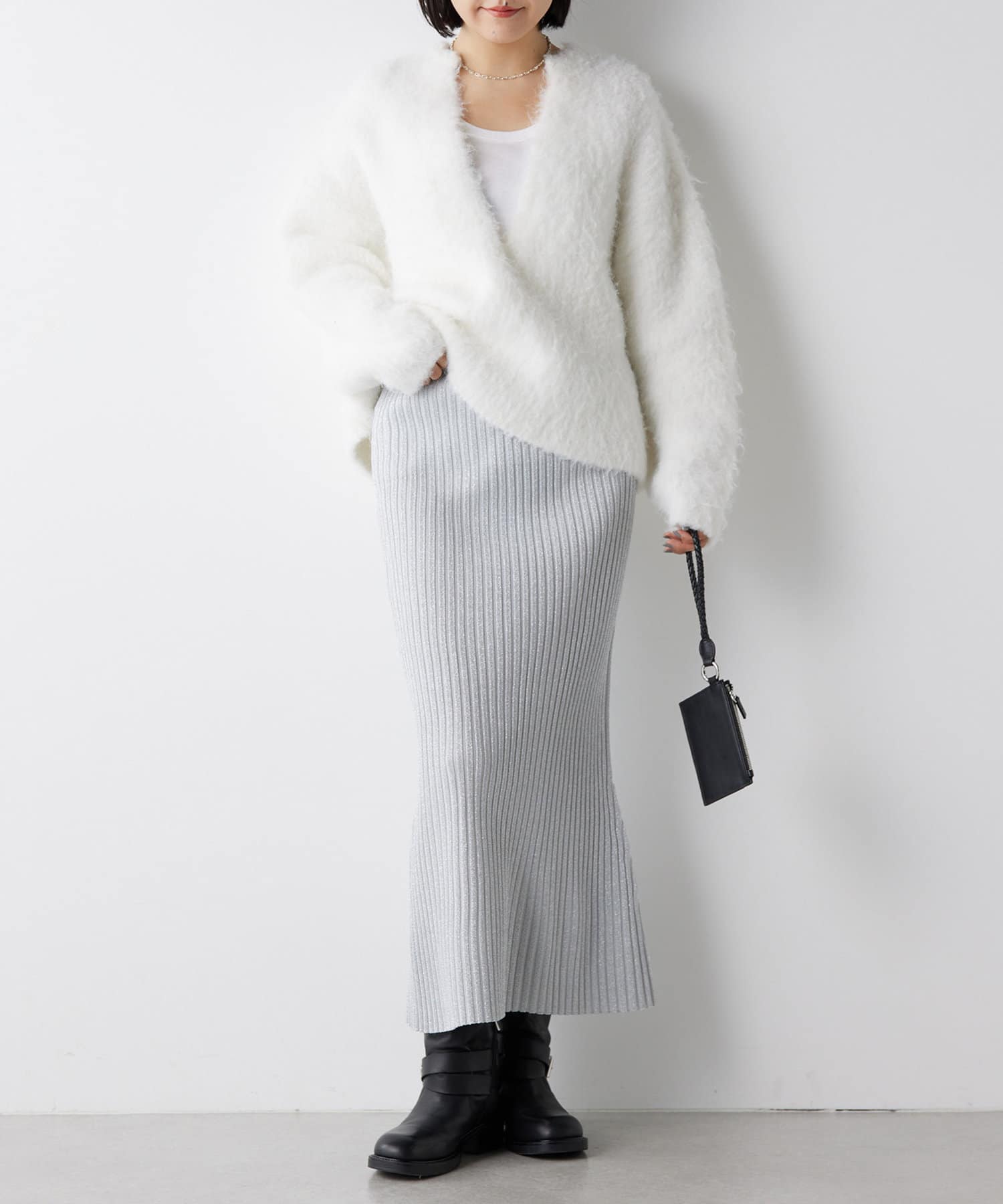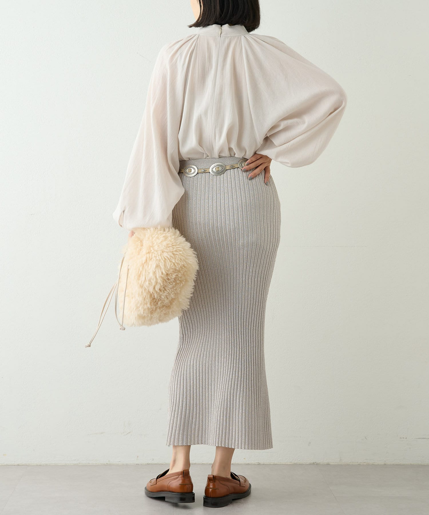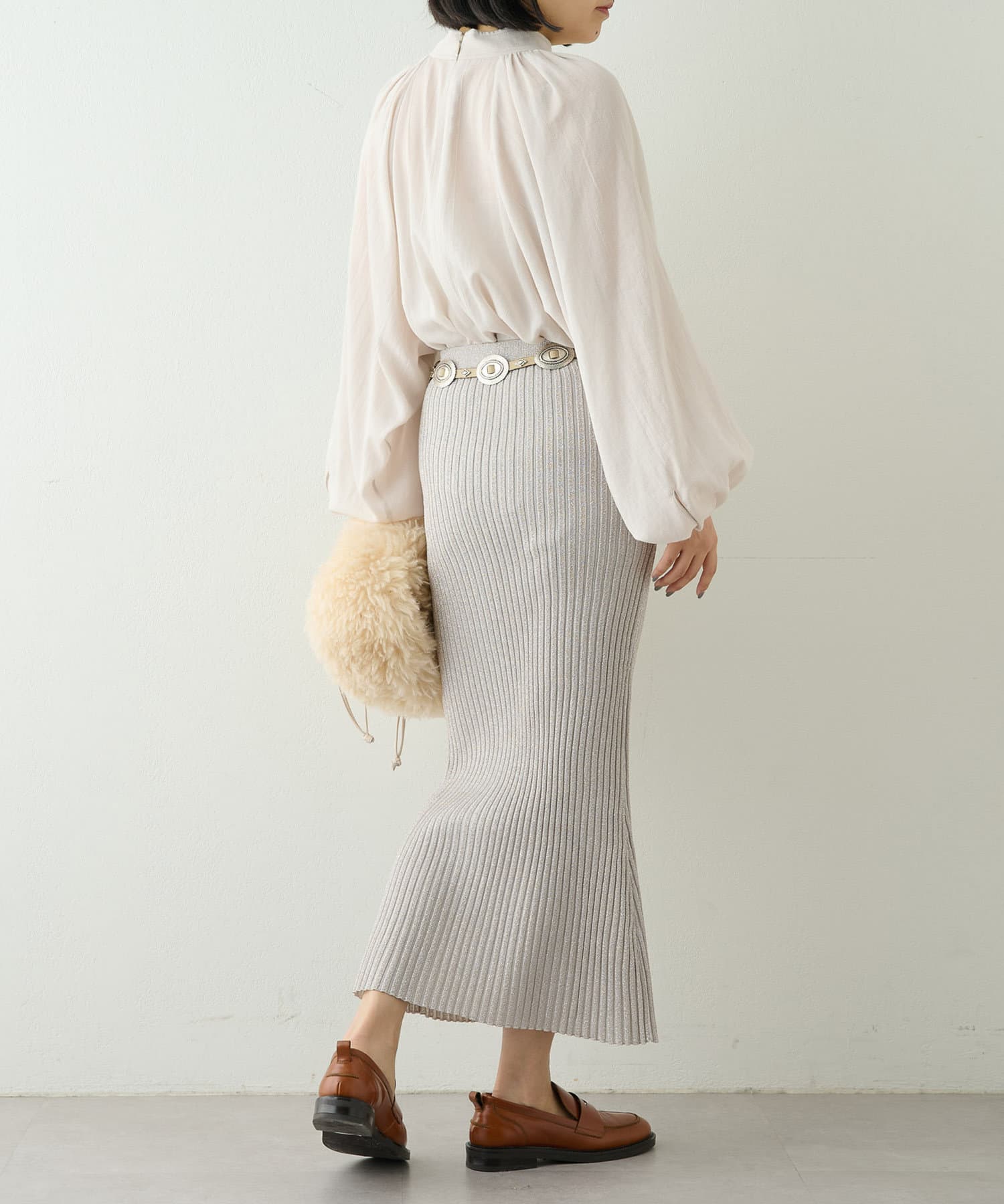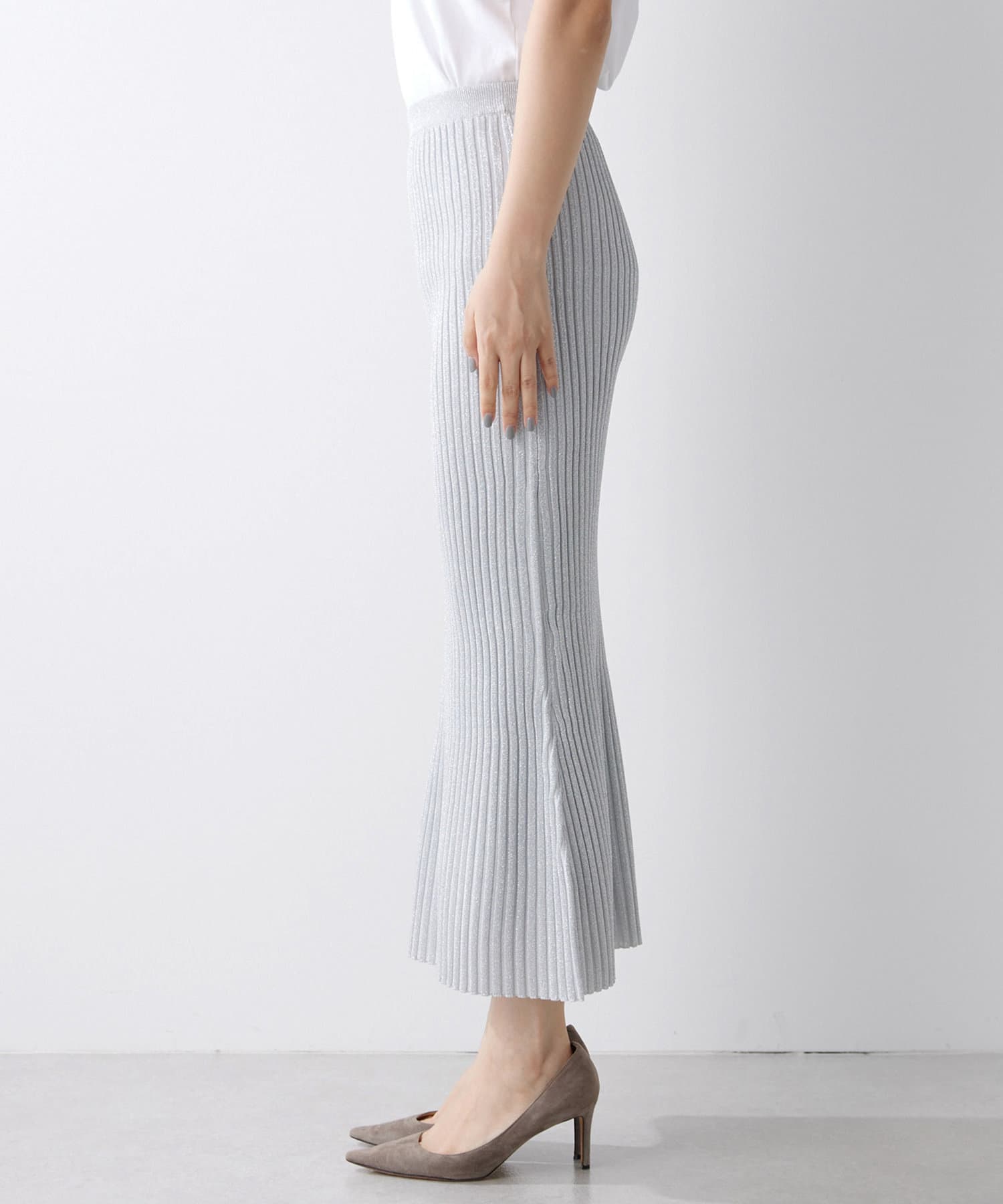 ウィムガゼットの名品、ニットフィットスカートから、ラメバージョンが登場。体のラインを拾いますので、ラインが気になる方は長めの丈のトップス合わせがおすすめ。インナーがついておりますので、心地よくお使いいただけます。