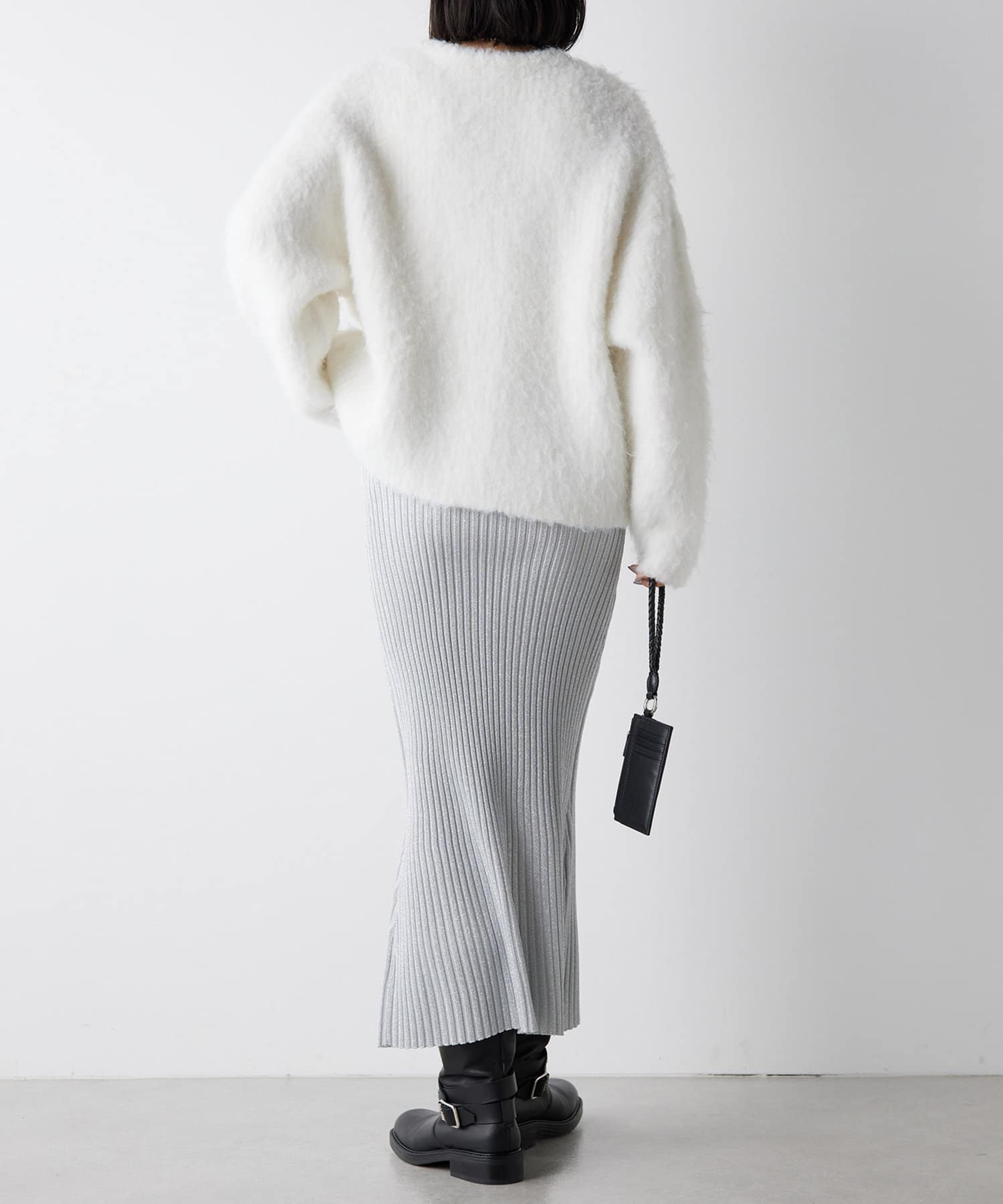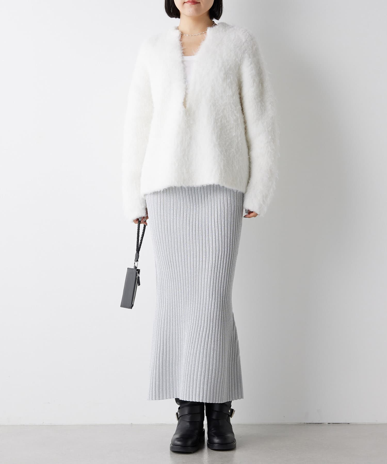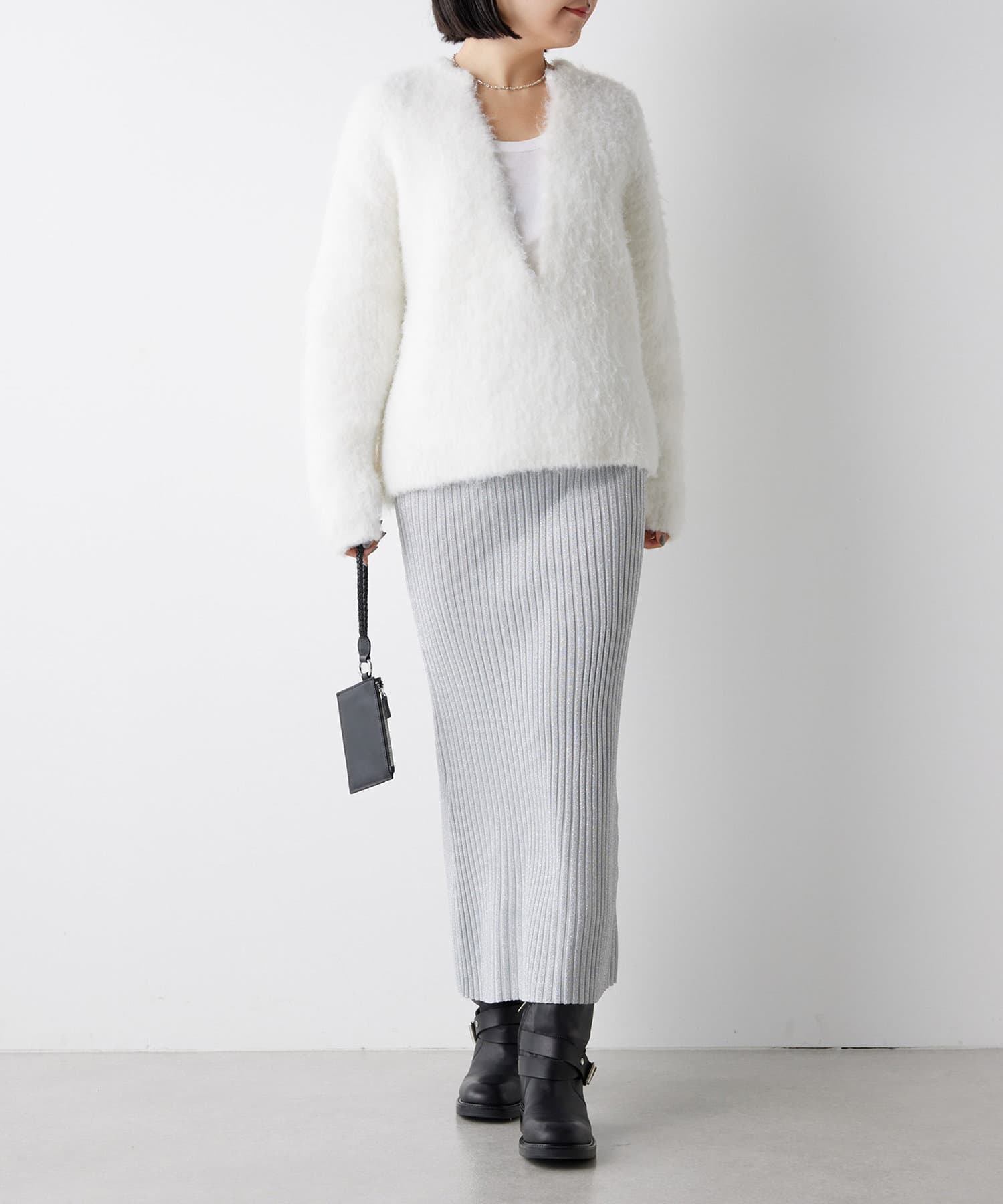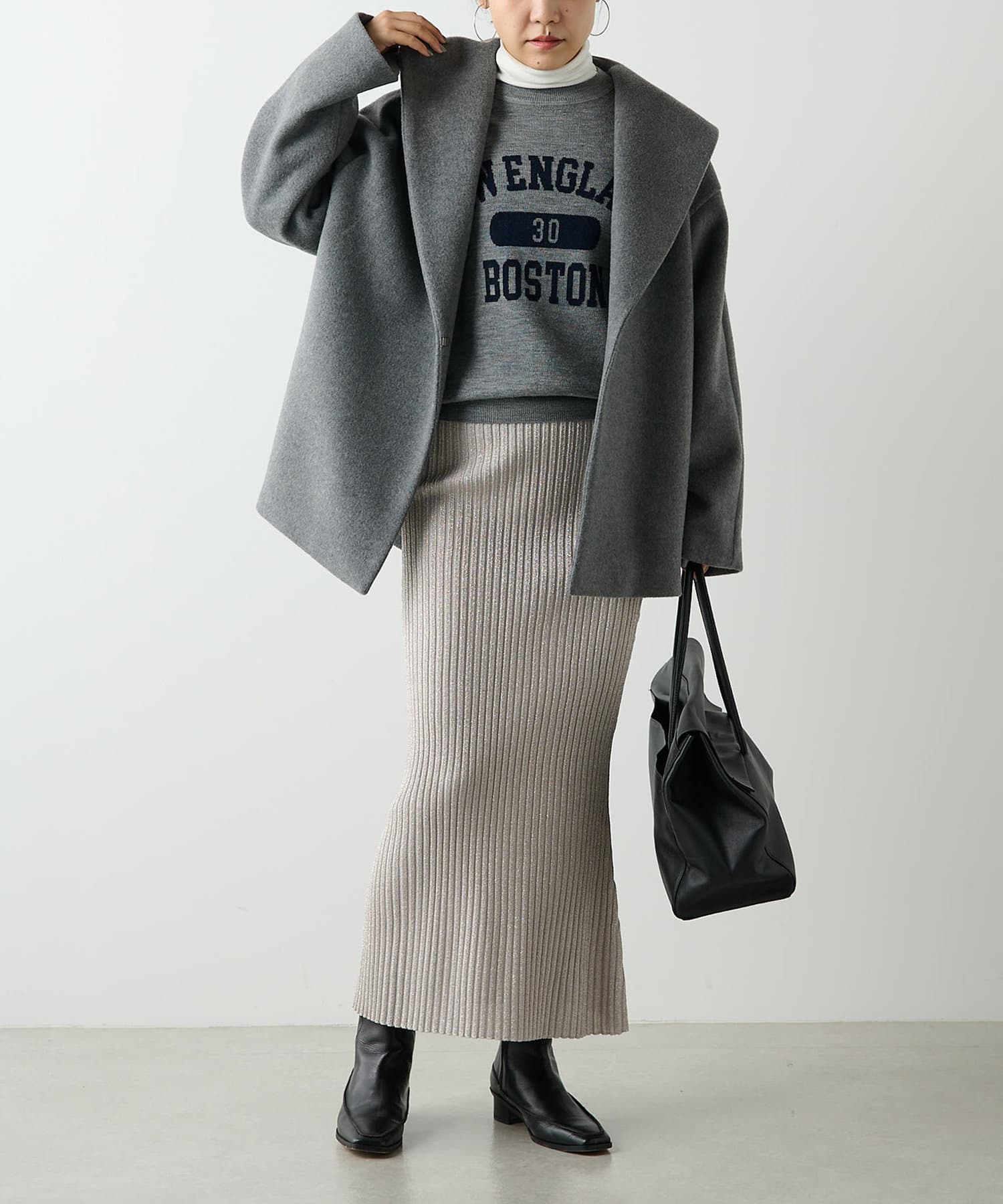 ウィムガゼットの名品、ニットフィットスカートから、ラメバージョンが登場。体のラインを拾いますので、ラインが気になる方は長めの丈のトップス合わせがおすすめ。インナーがついておりますので、心地よくお使いいただけます。