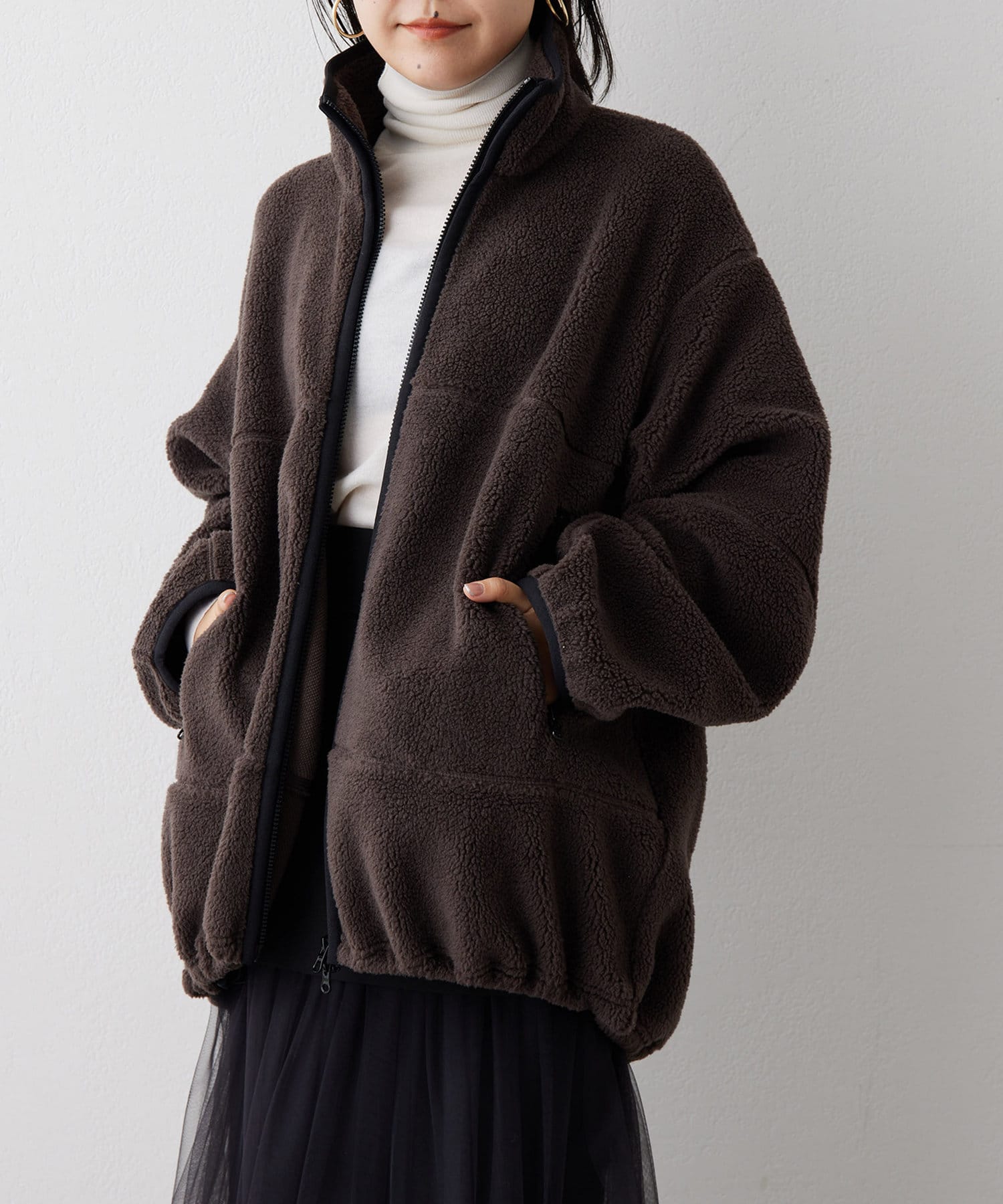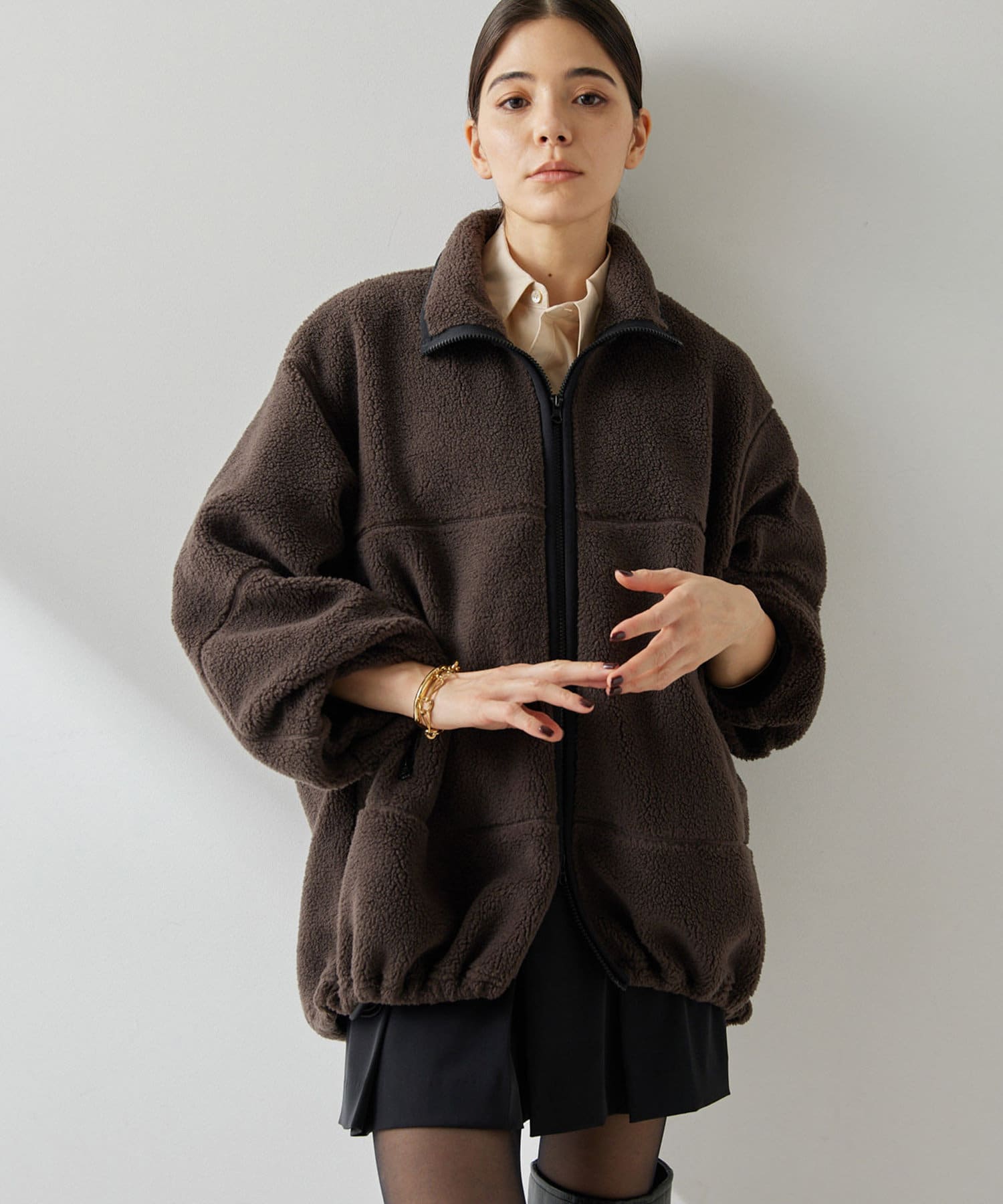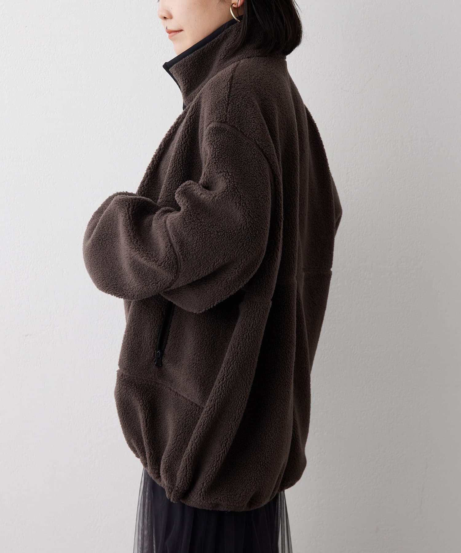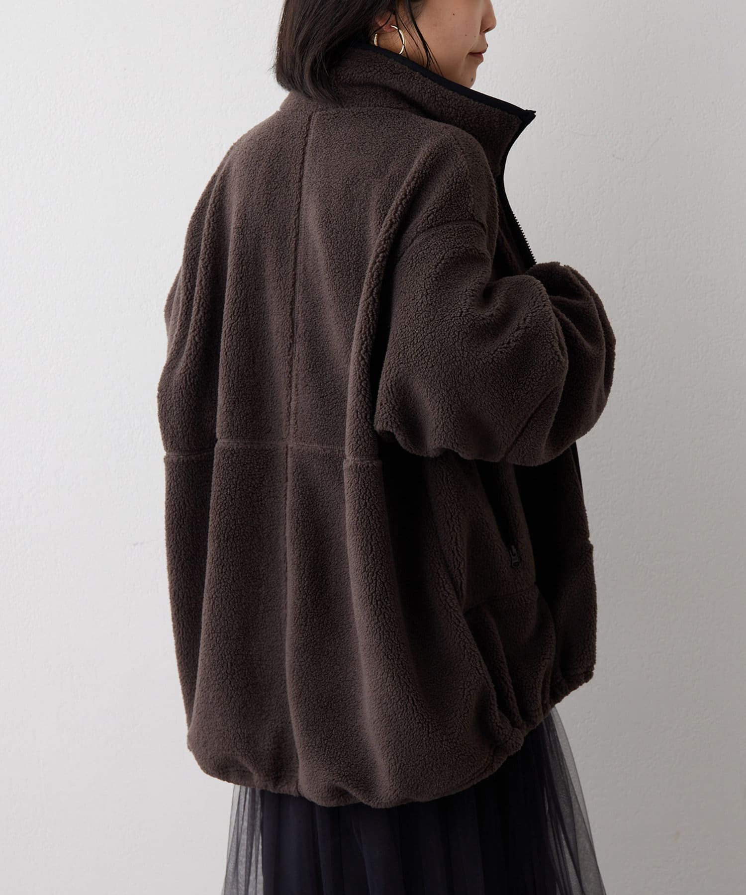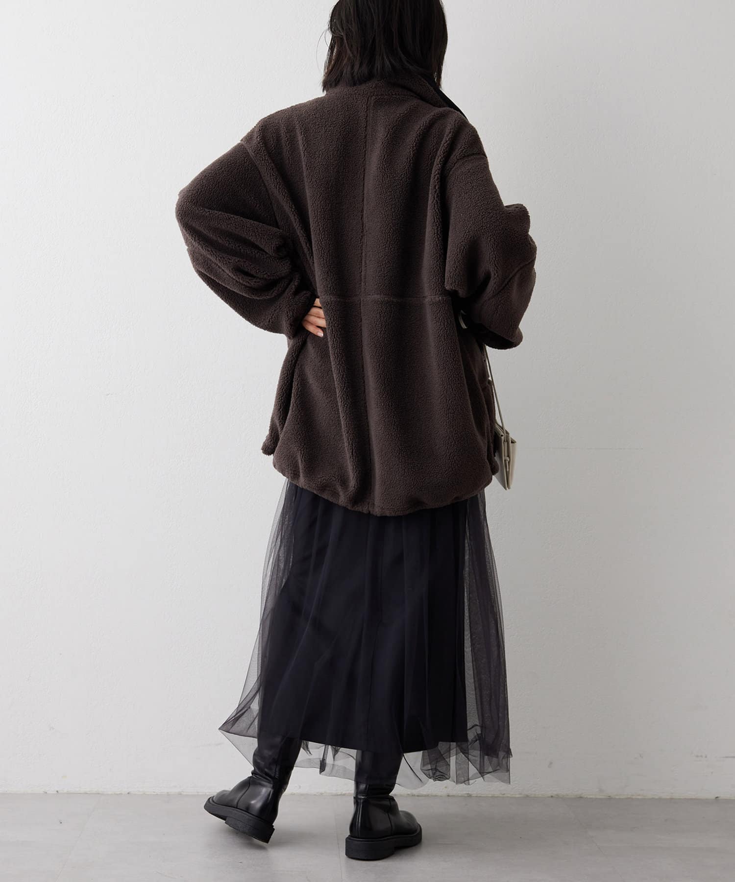 ■程よい肉感のボア素材とメンズライクなオーバーなサイズ感が、着こなしにラフな抜け感を演出。