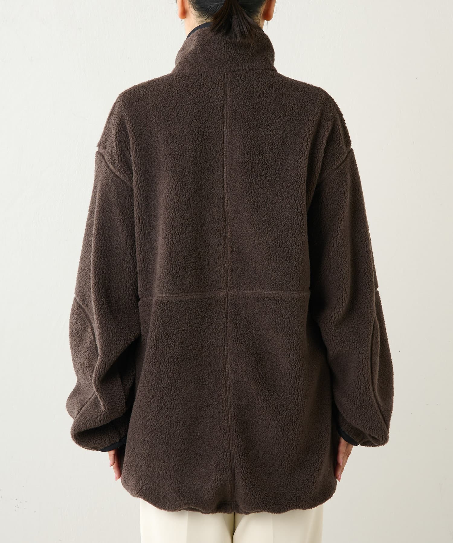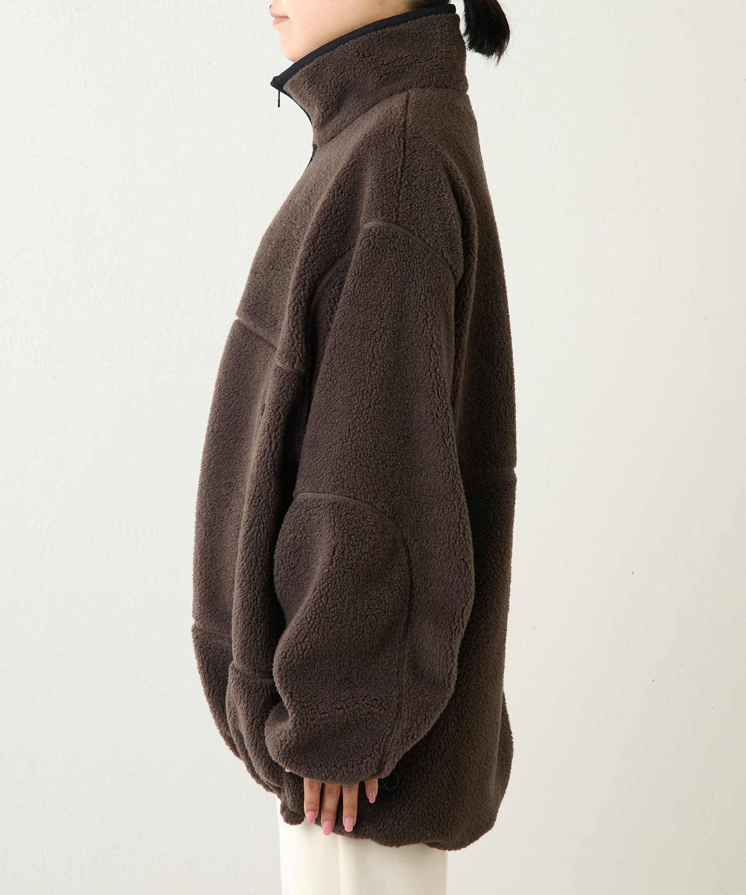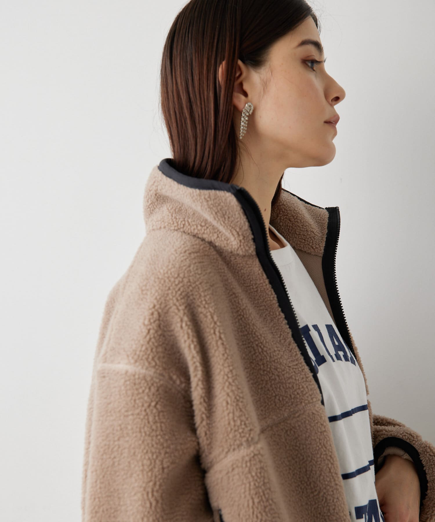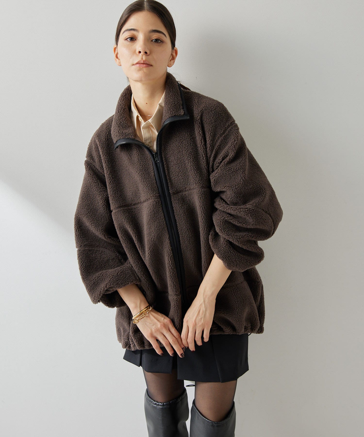 ■程よい肉感のボア素材とメンズライクなオーバーなサイズ感が、着こなしにラフな抜け感を演出。