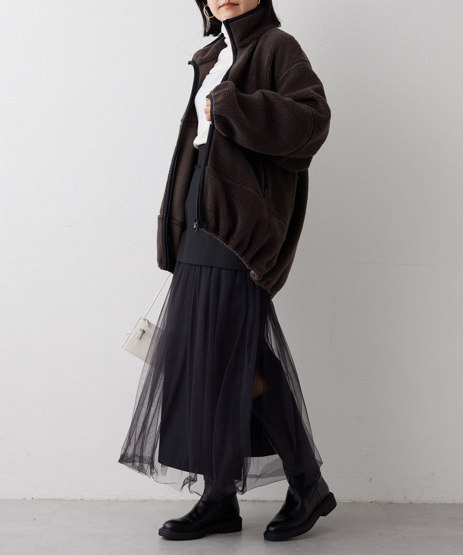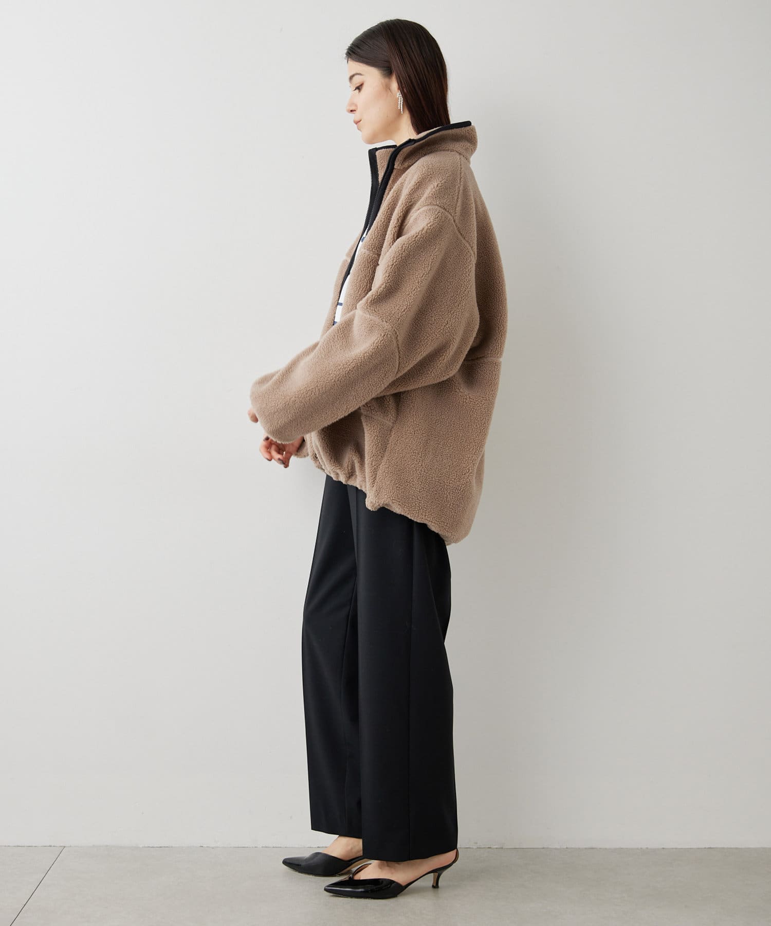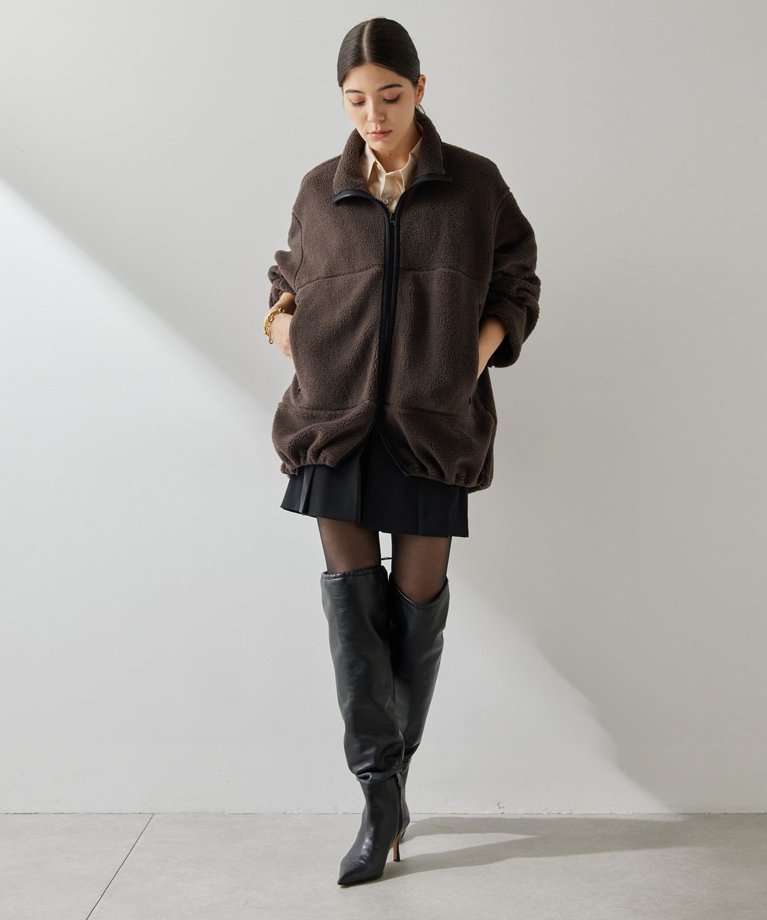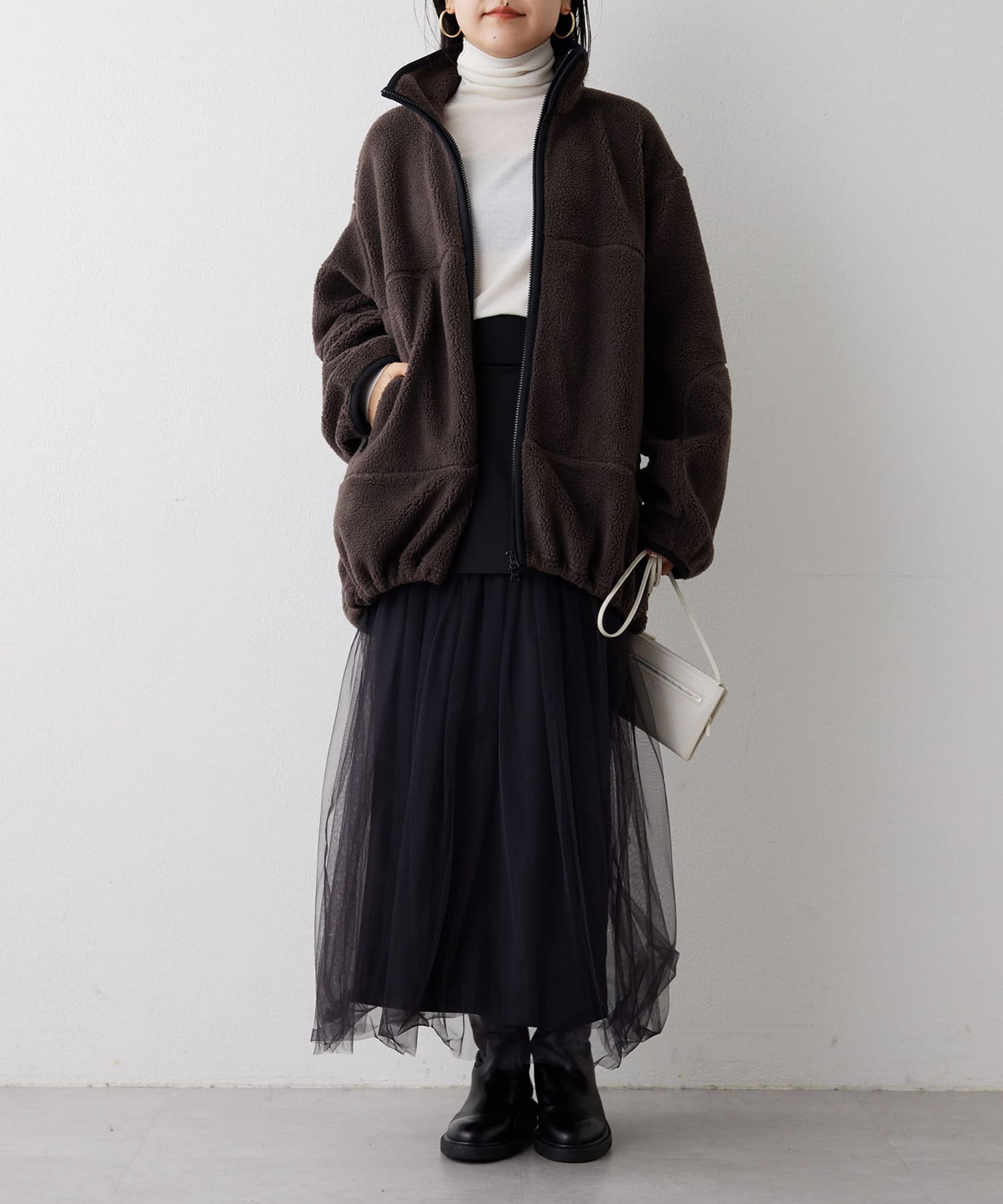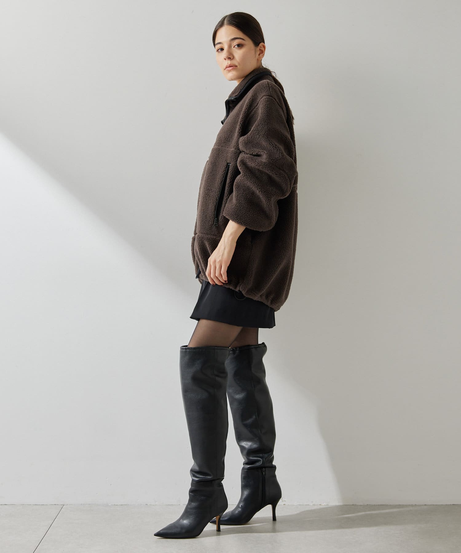 ■程よい肉感のボア素材とメンズライクなオーバーなサイズ感が、着こなしにラフな抜け感を演出。