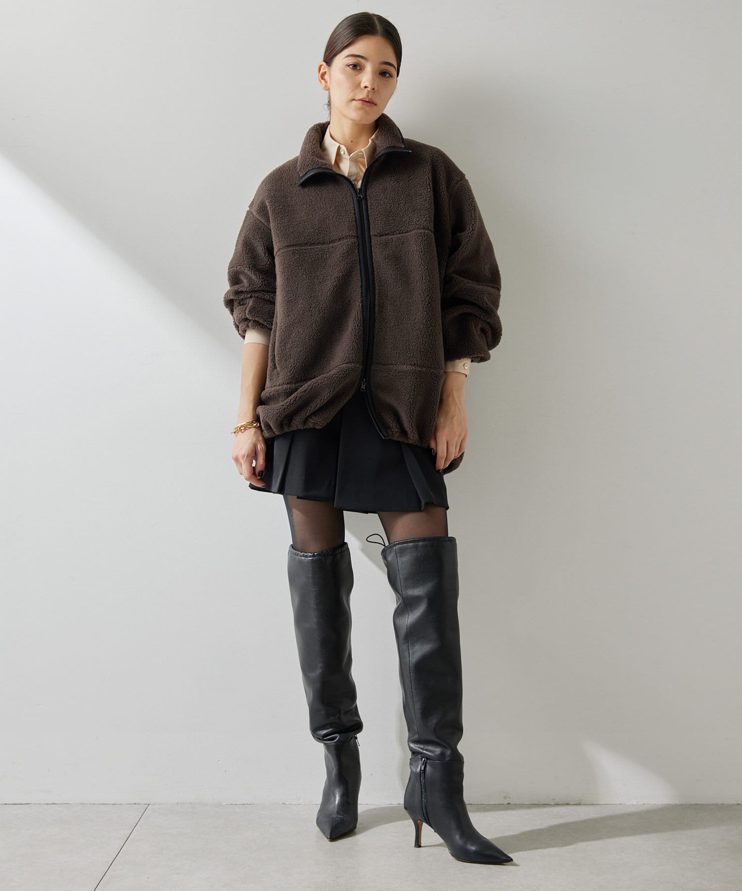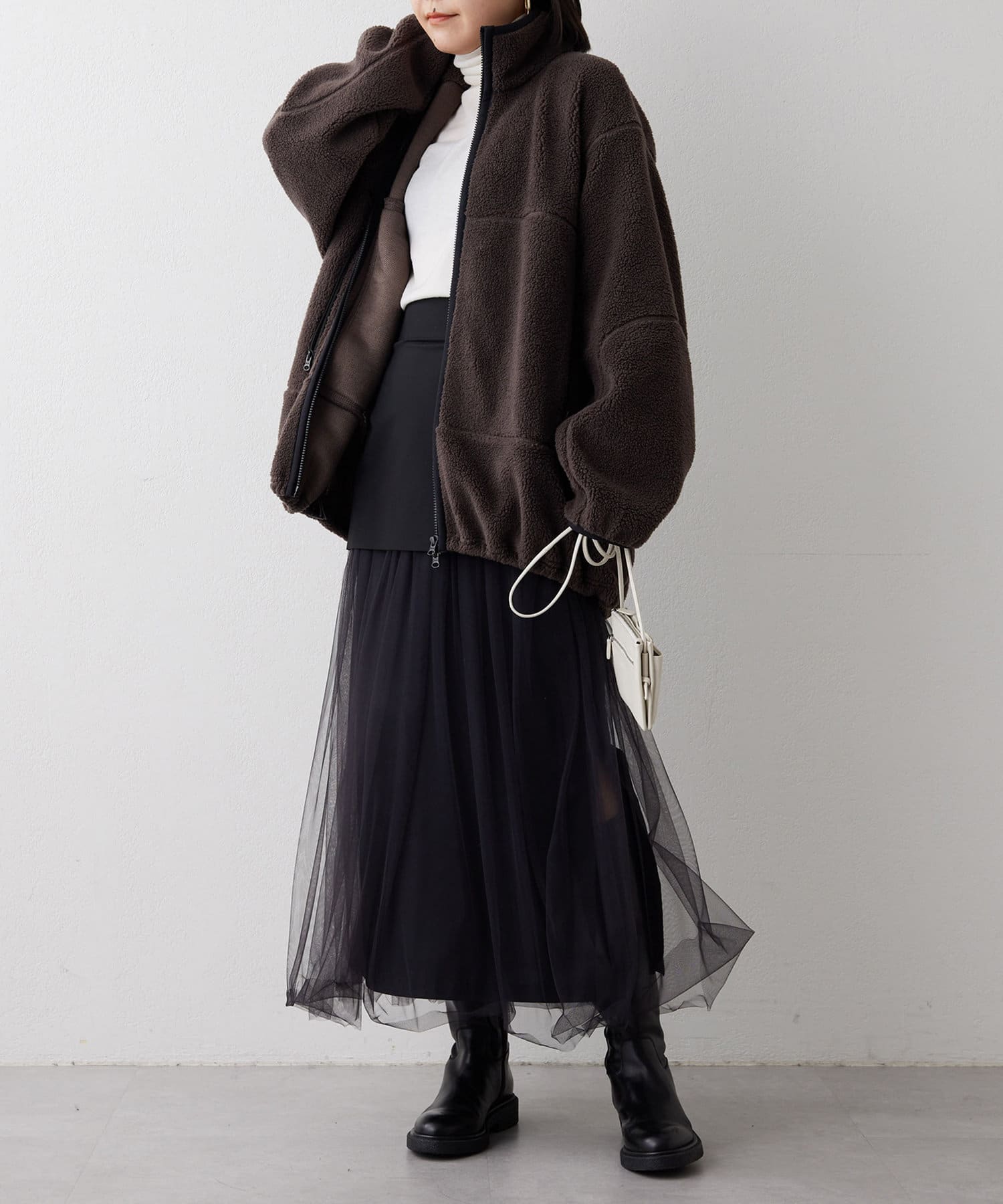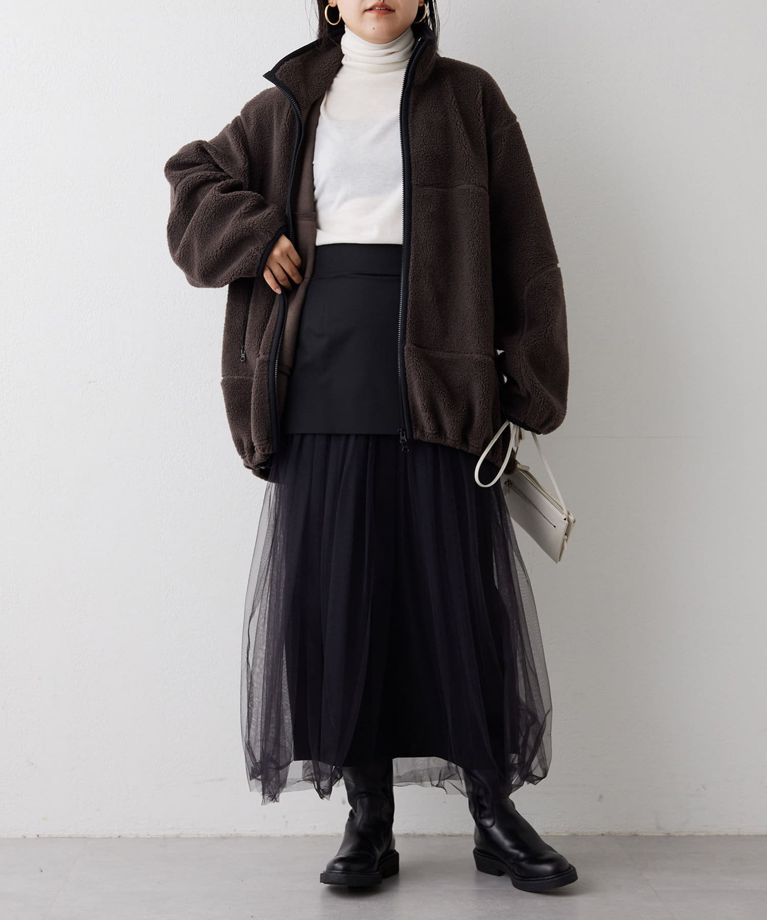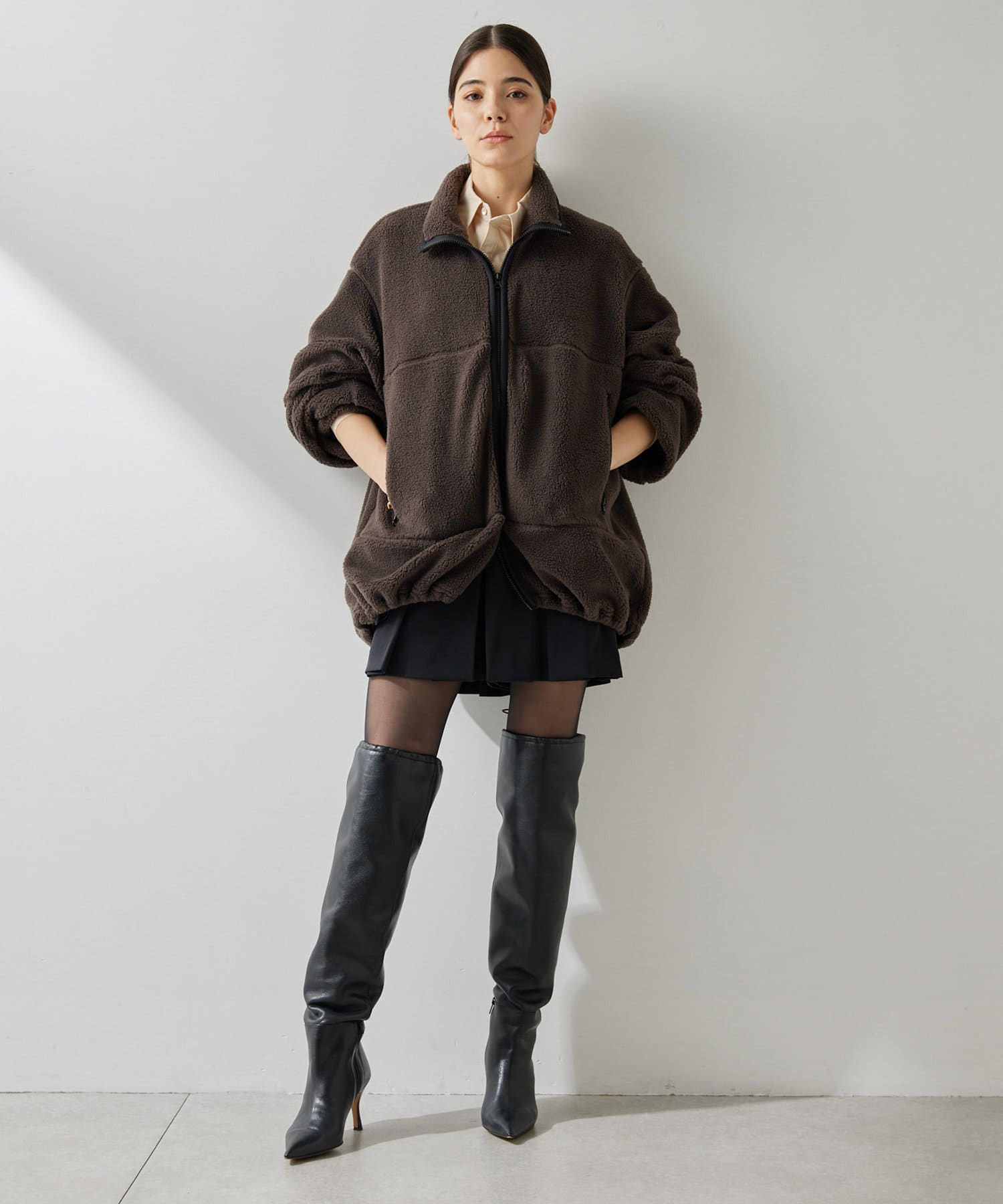 ■程よい肉感のボア素材とメンズライクなオーバーなサイズ感が、着こなしにラフな抜け感を演出。