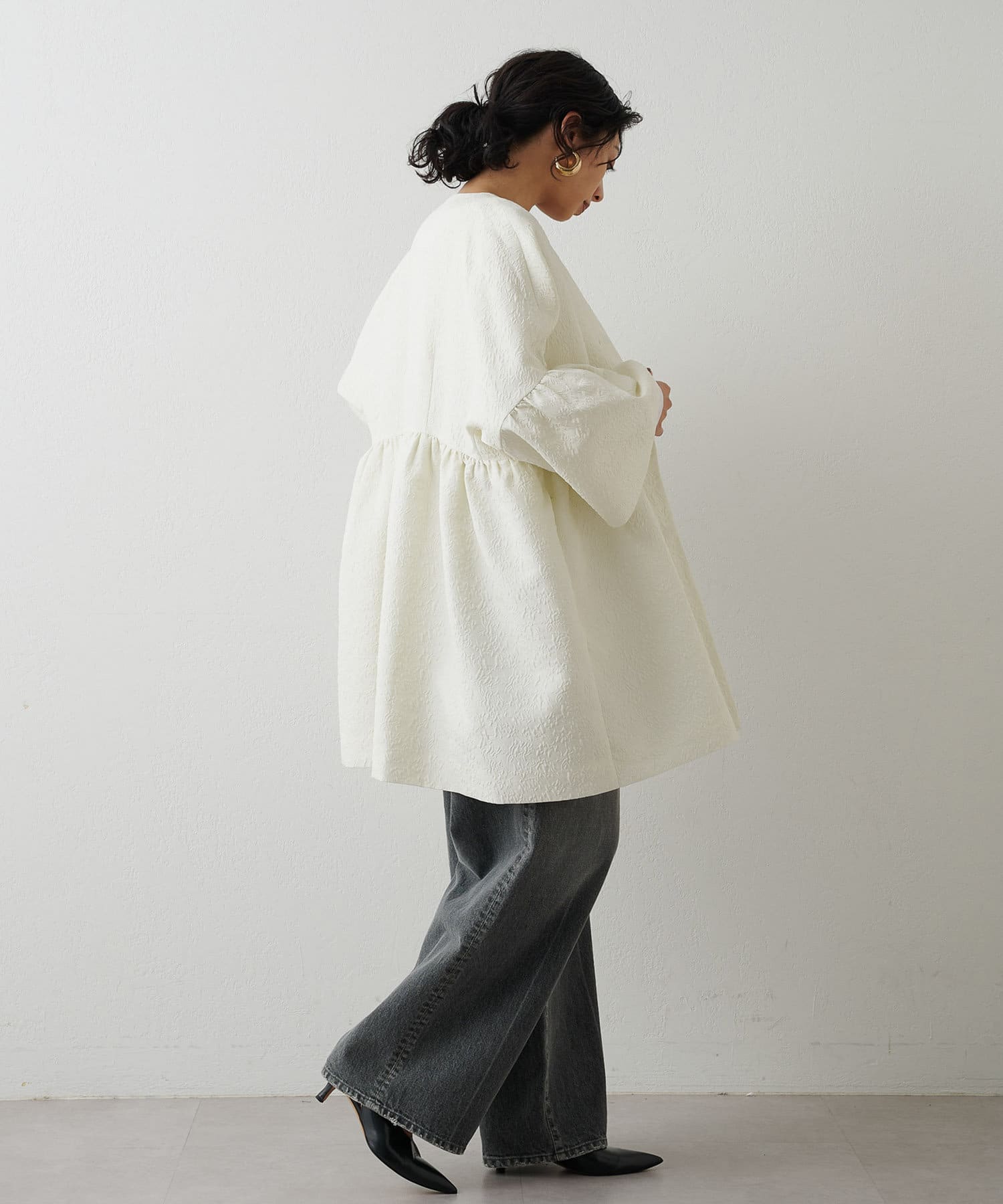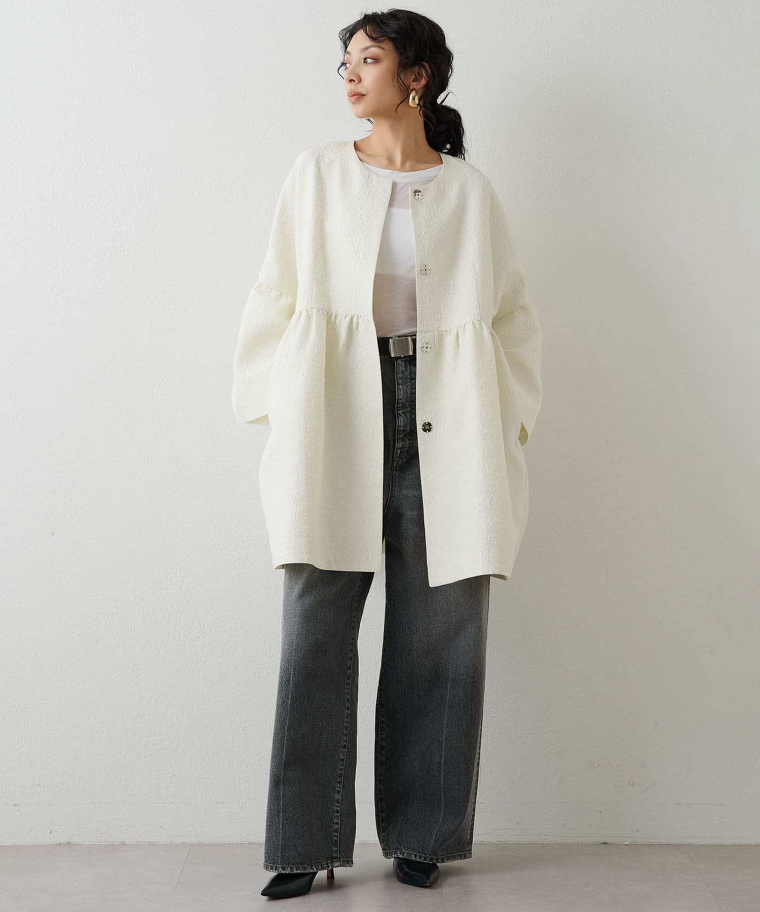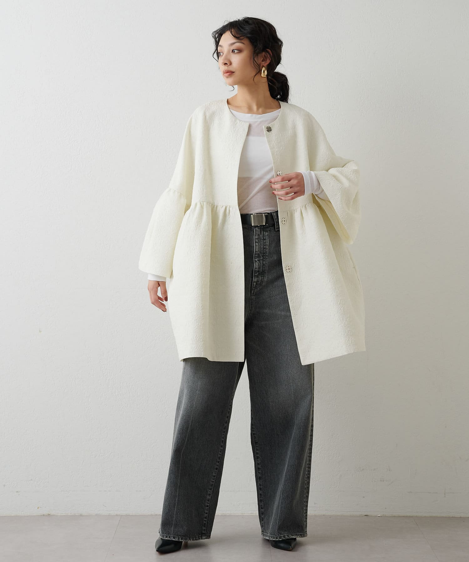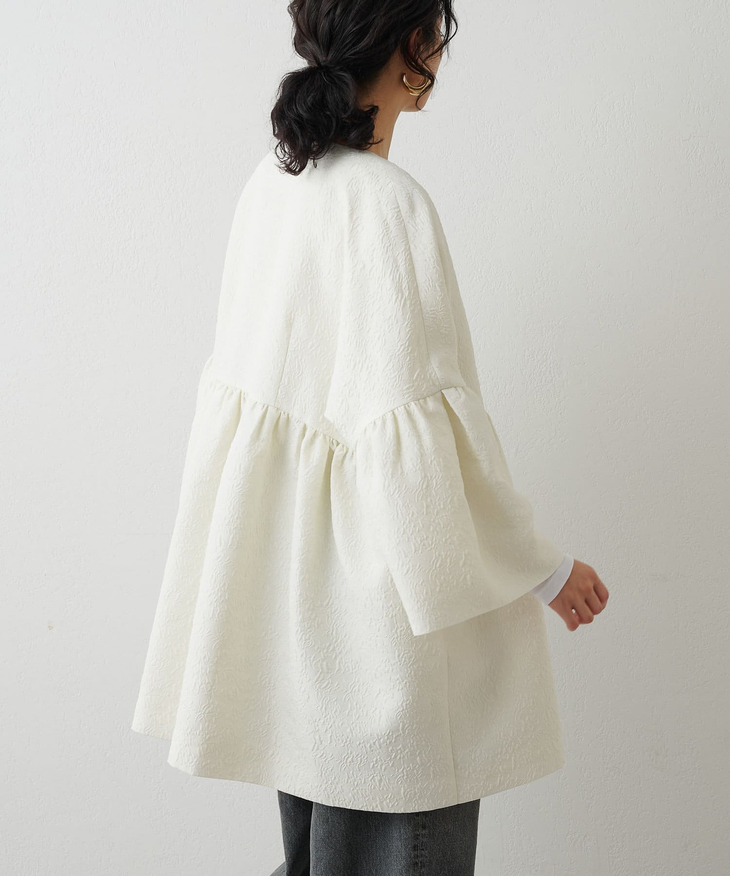 シルエットを楽しめるアウター。軽くて肩が楽です。ジャガードならではのシボ感がさり気なく華やかで上品な印象にしてくれます。ハイウェストなのでスタイルアップ効果も期待できます。