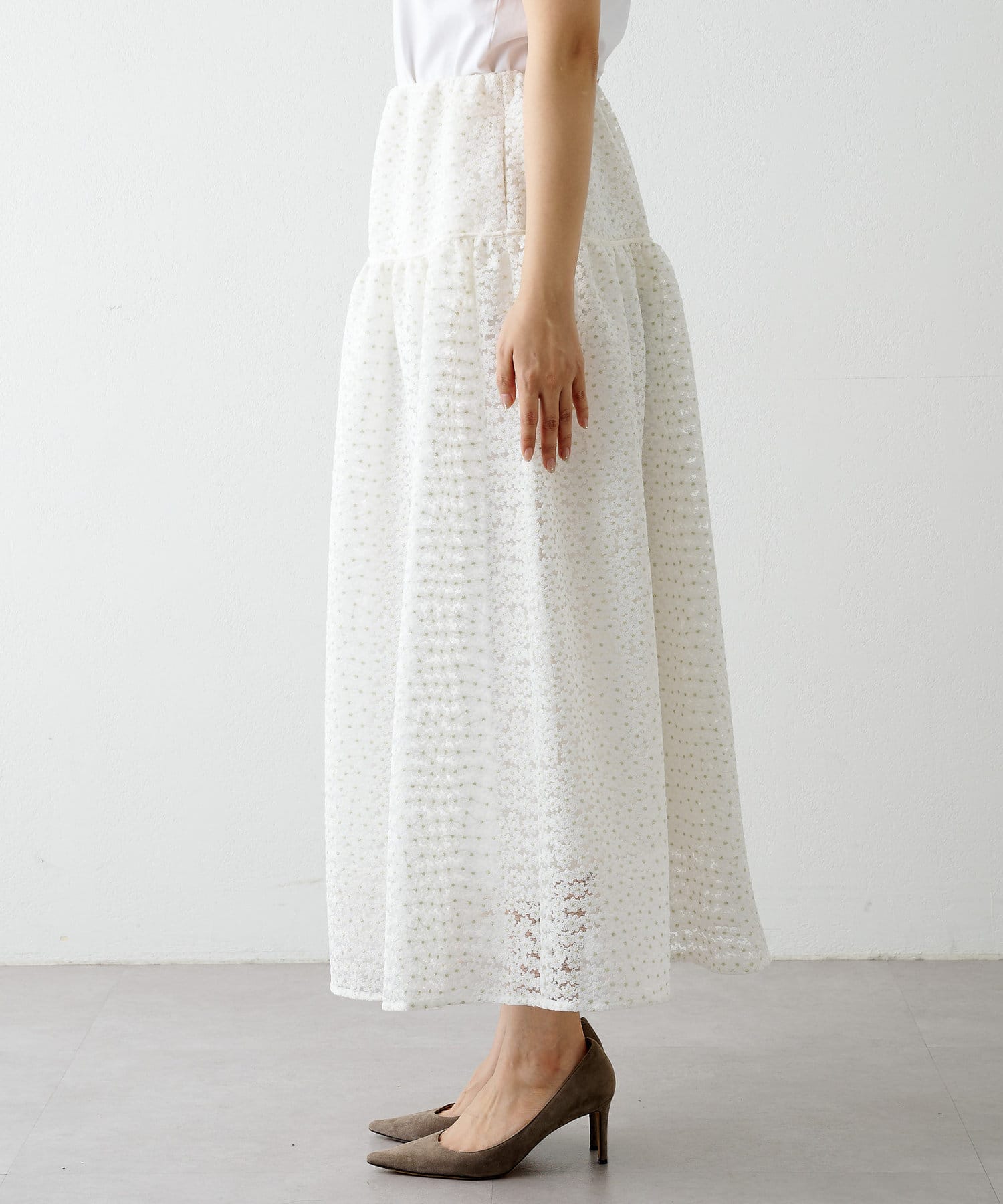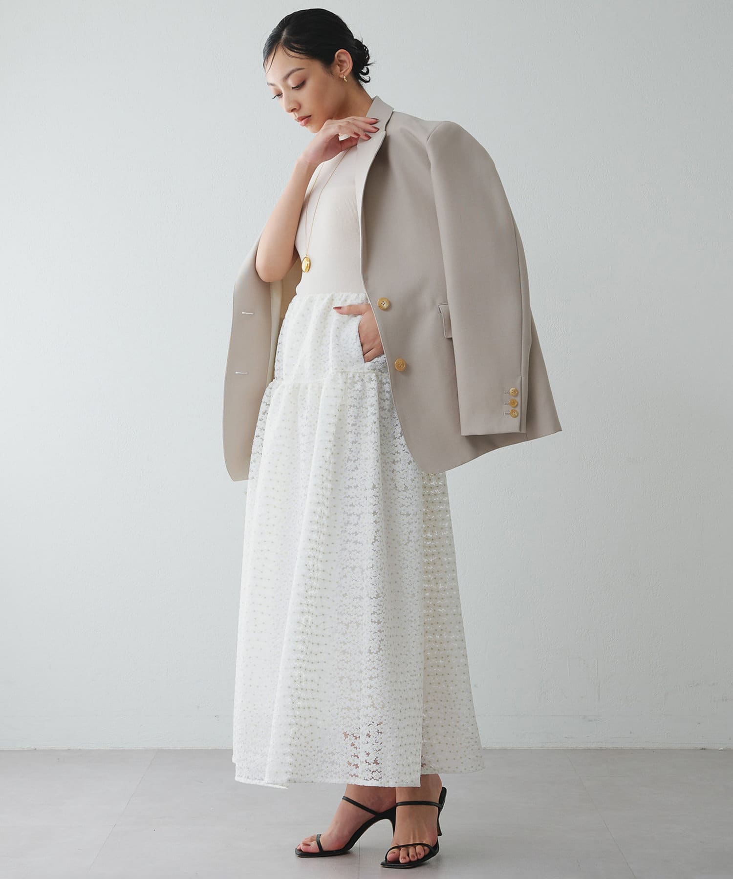 ■透け感のある繊細な表情をもつポリエステル素材に小花を総刺繍した生地を使用。