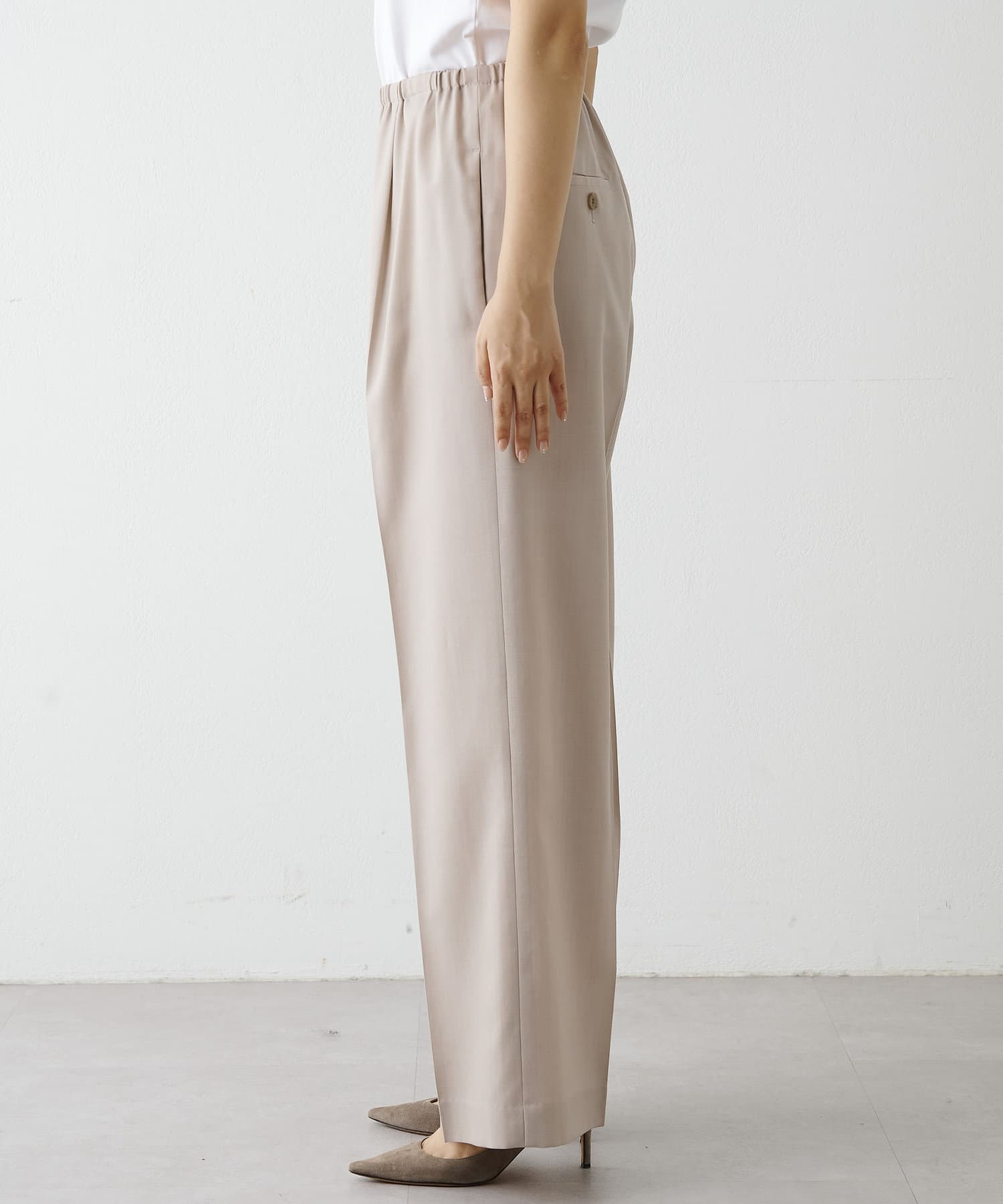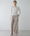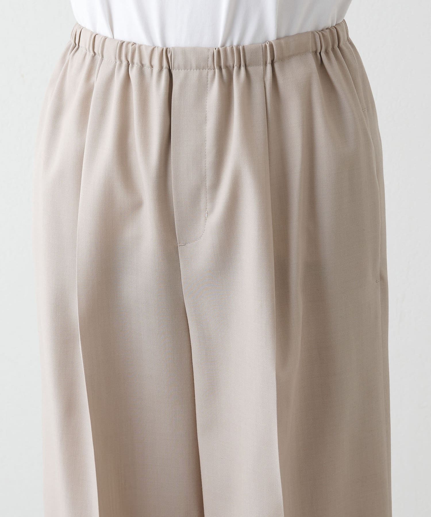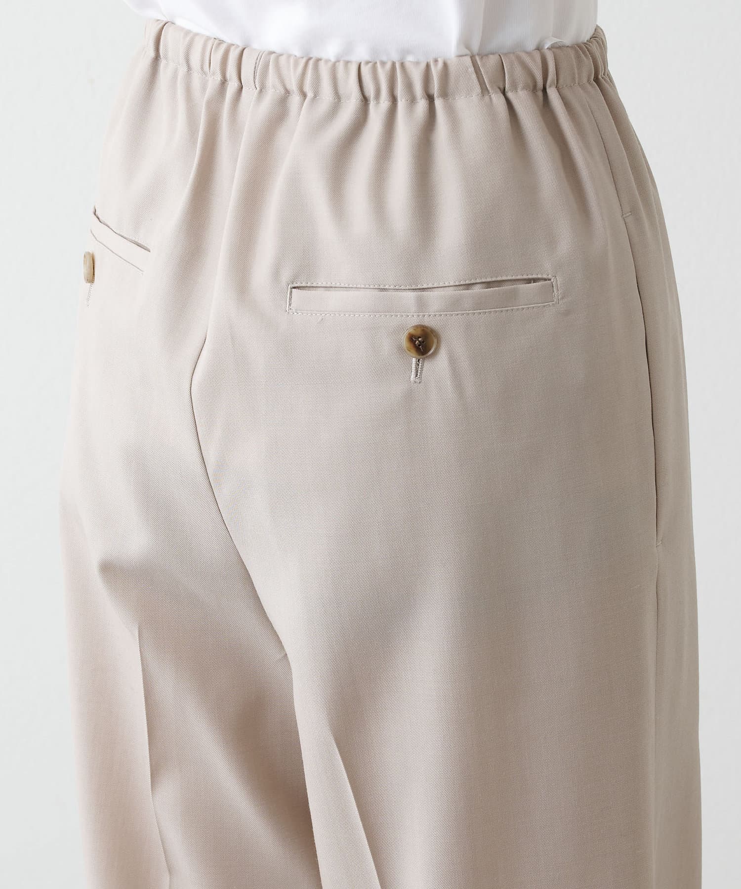 ■クリース入りのきれいな見え感ながら、ゴム+ストリングのウエスト仕様の快適な着心地が魅力。