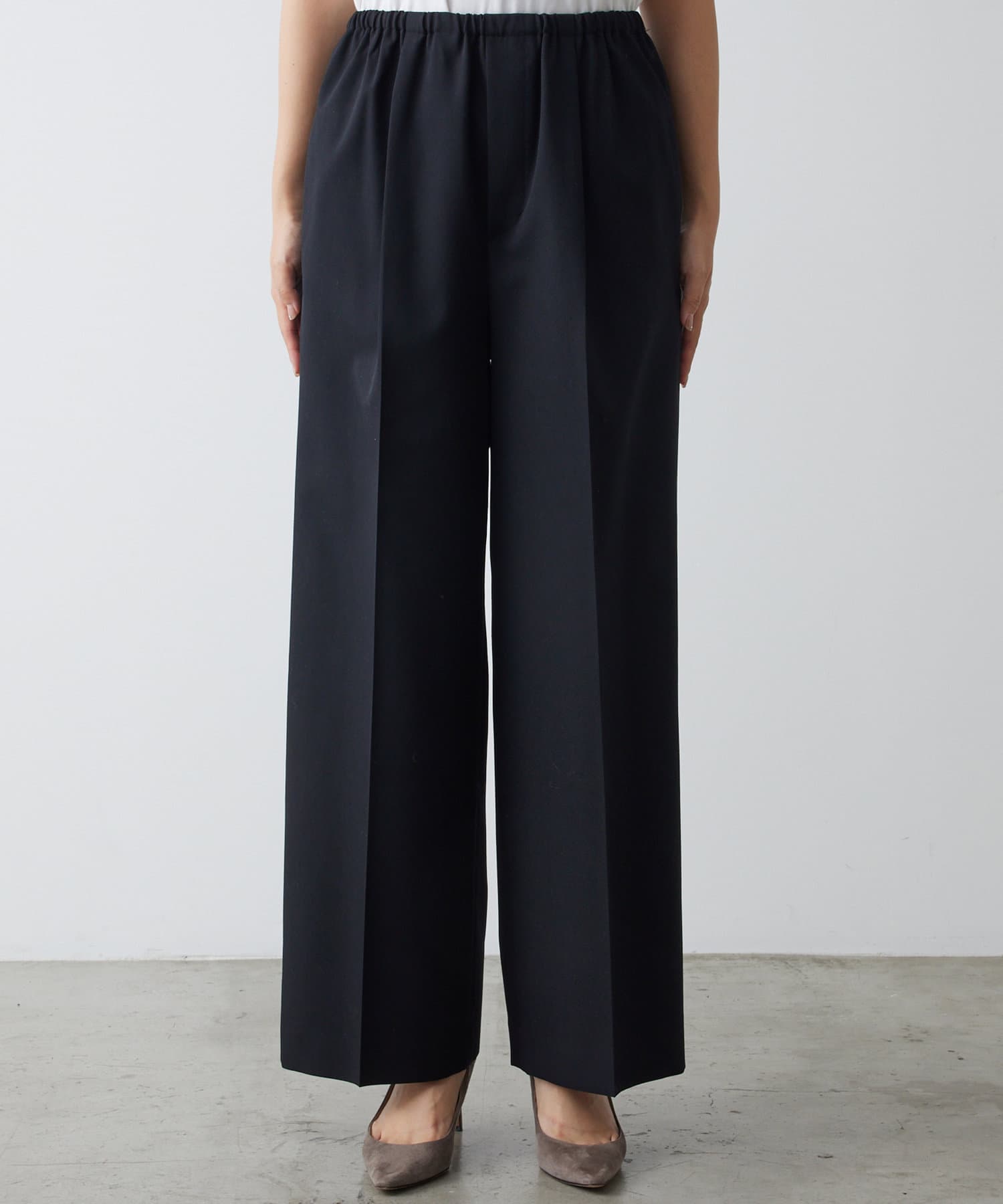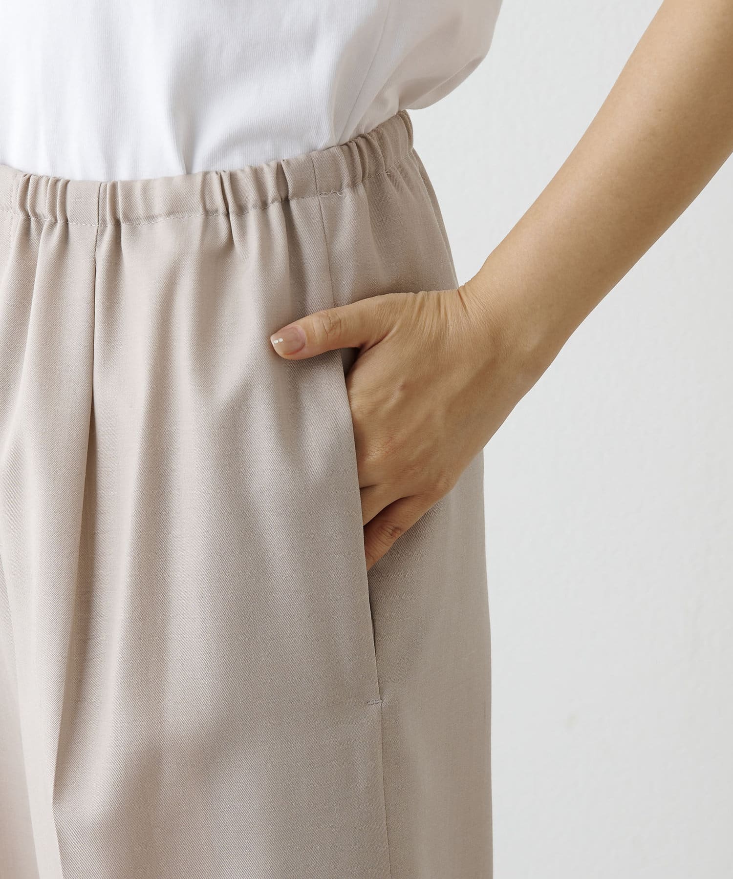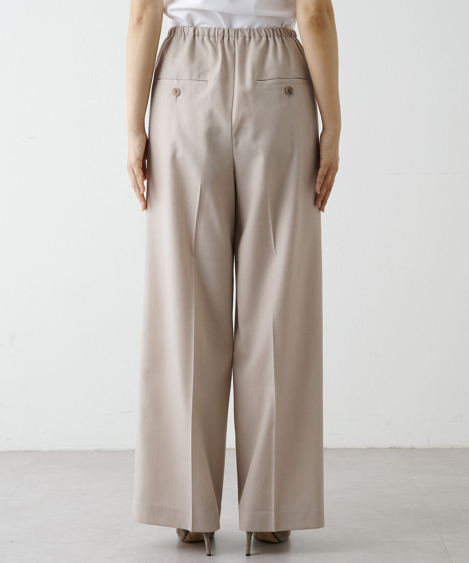 ■クリース入りのきれいな見え感ながら、ゴム+ストリングのウエスト仕様の快適な着心地が魅力。