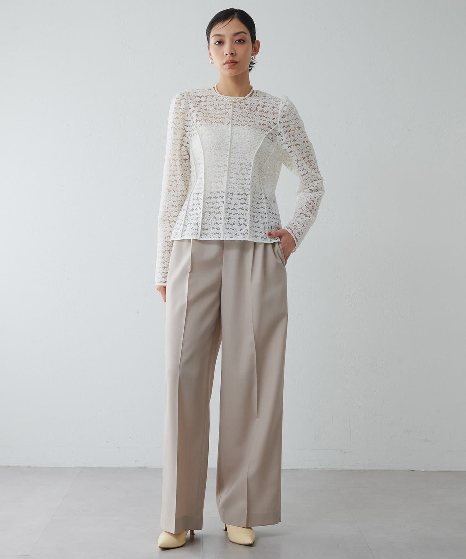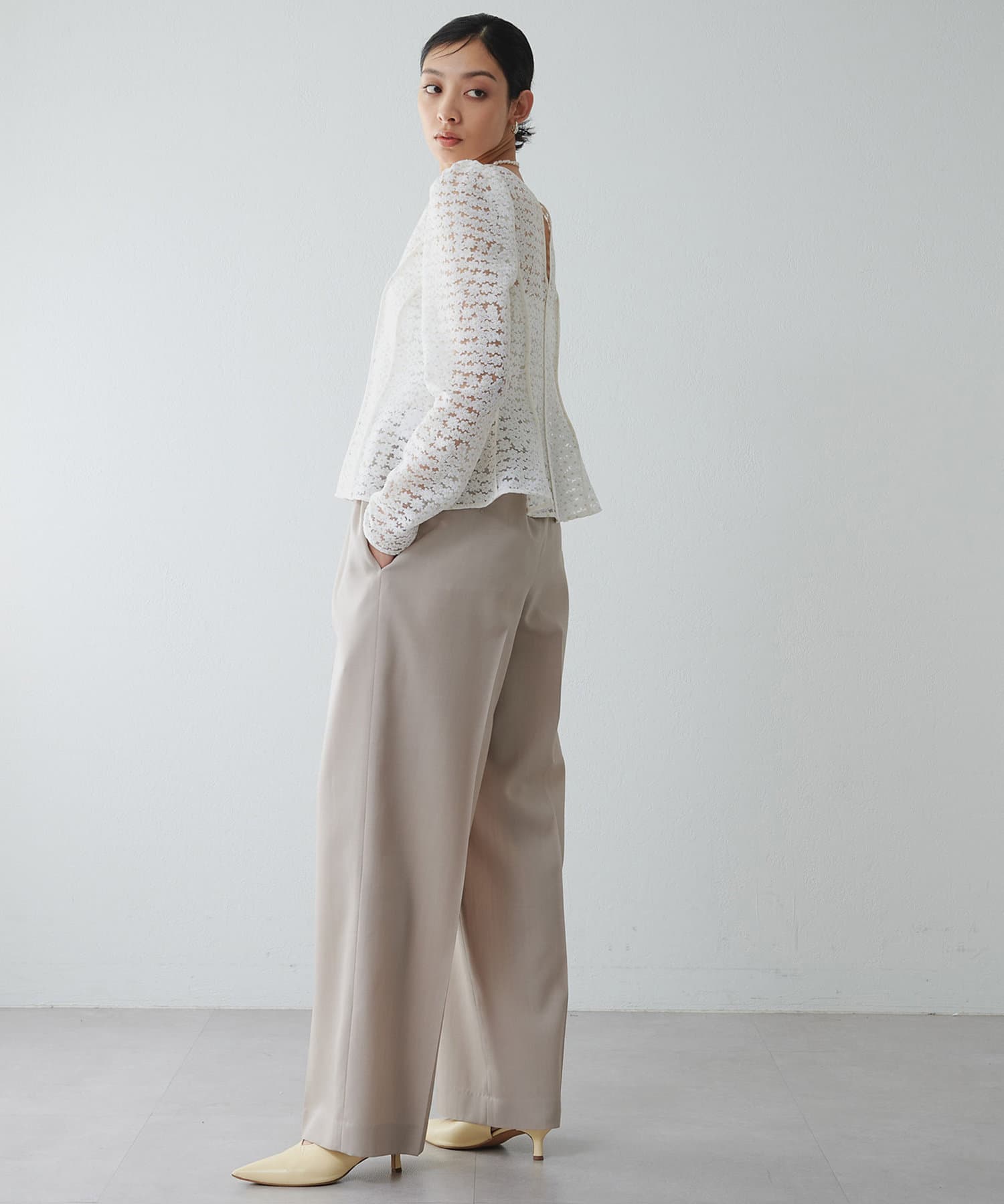 ■きれいめなブラウスはもちろん、フェザーなど表情のあるトップスとの素材コントラストを楽しむのもおすすめ。