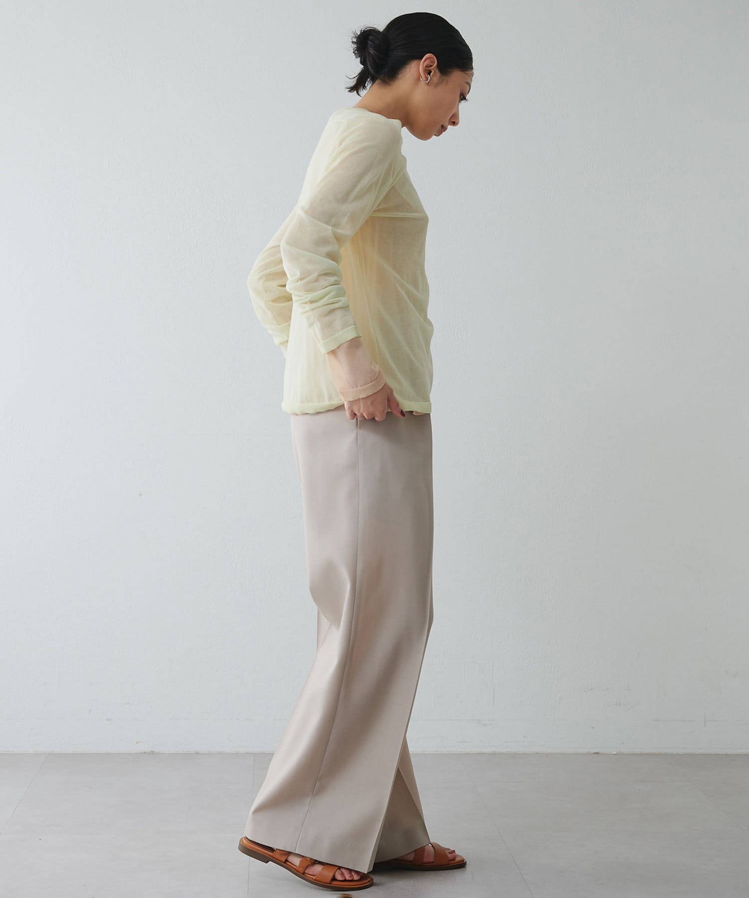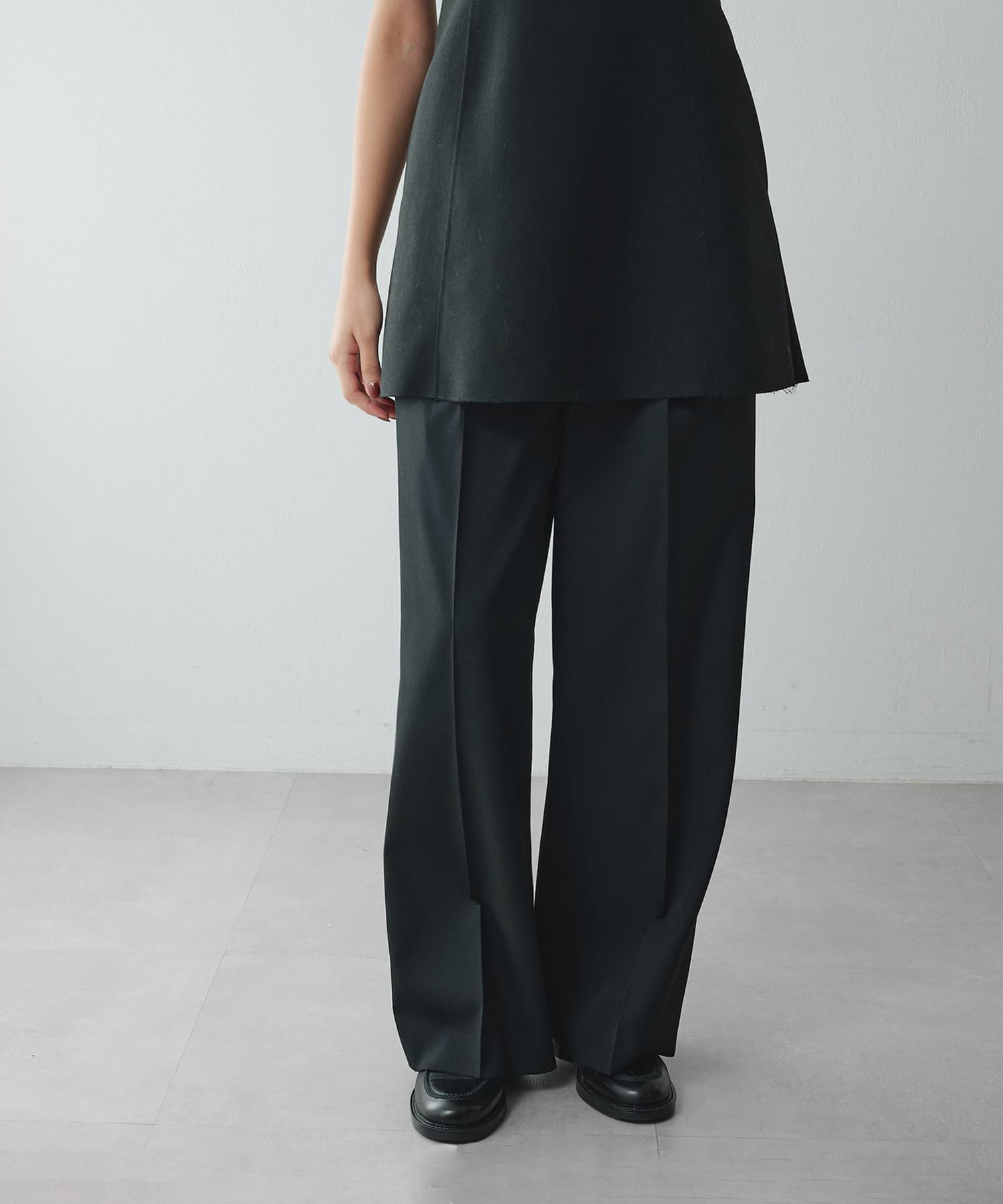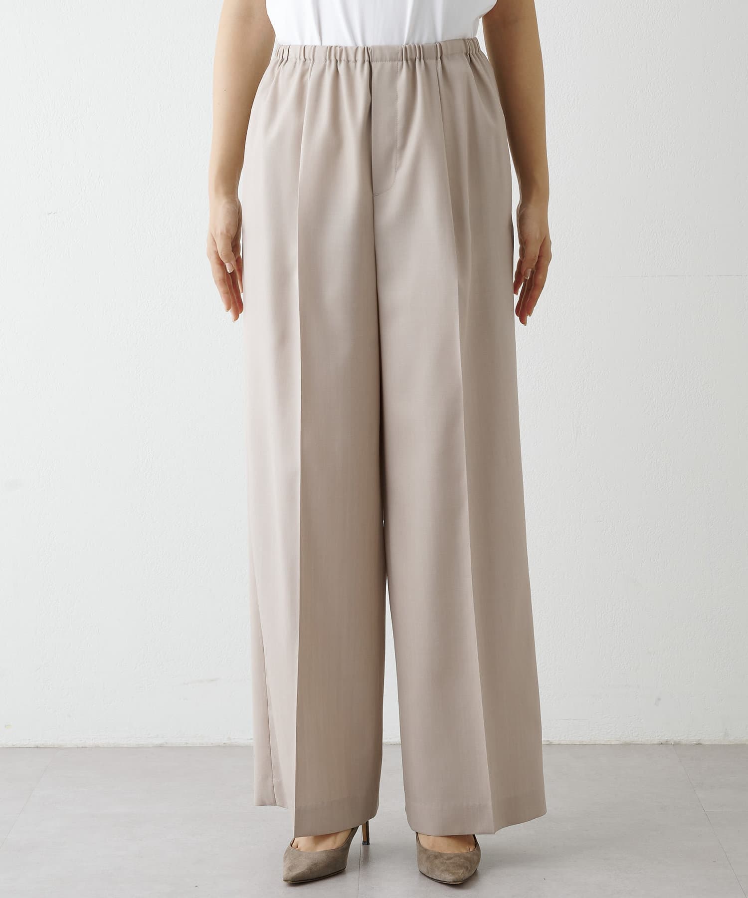 ウエストはゴム仕様で太めなシルエットなのでイージーな履き心地が叶います。毛100%ですが薄手なので、3シーズンで着用可能です。