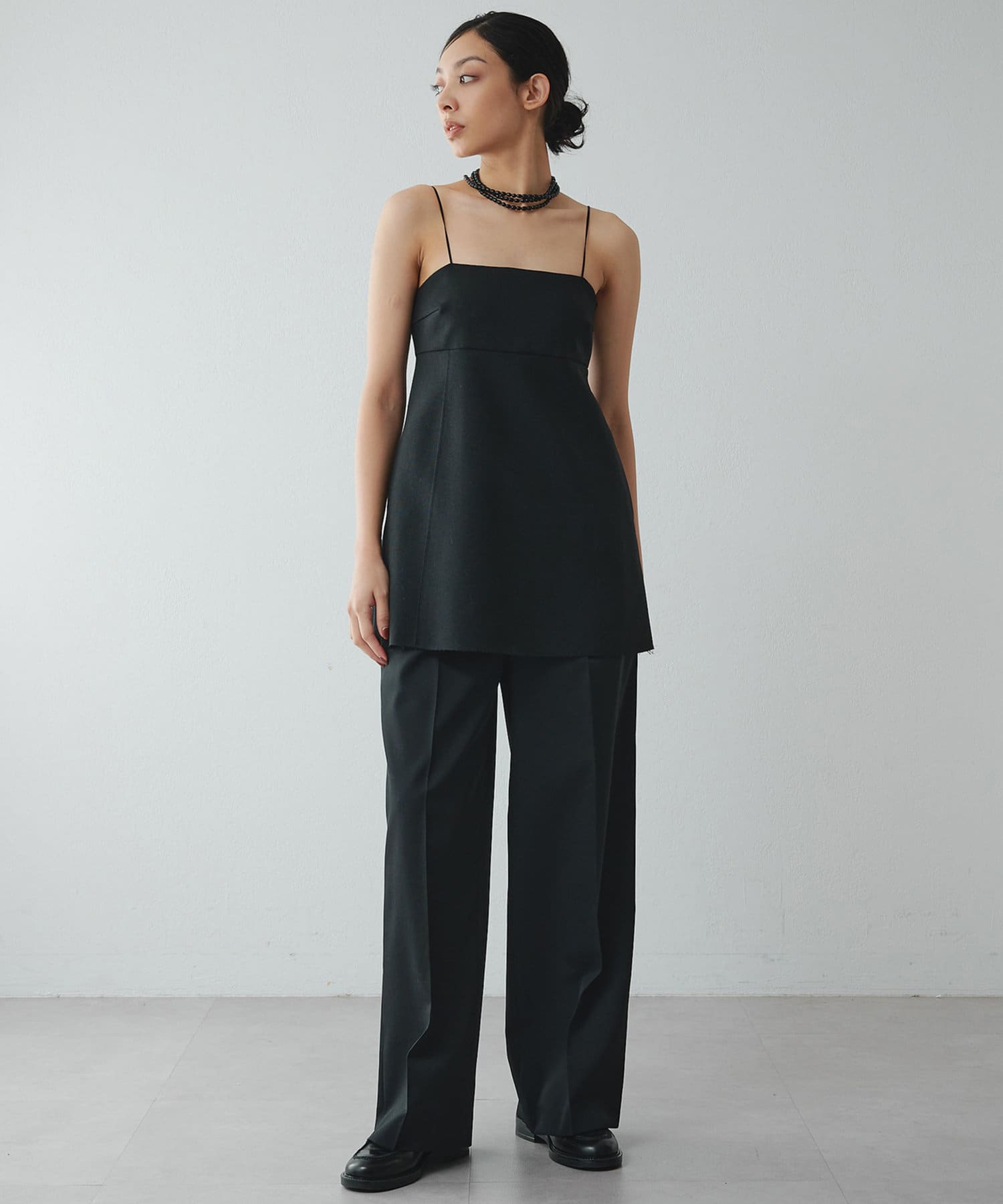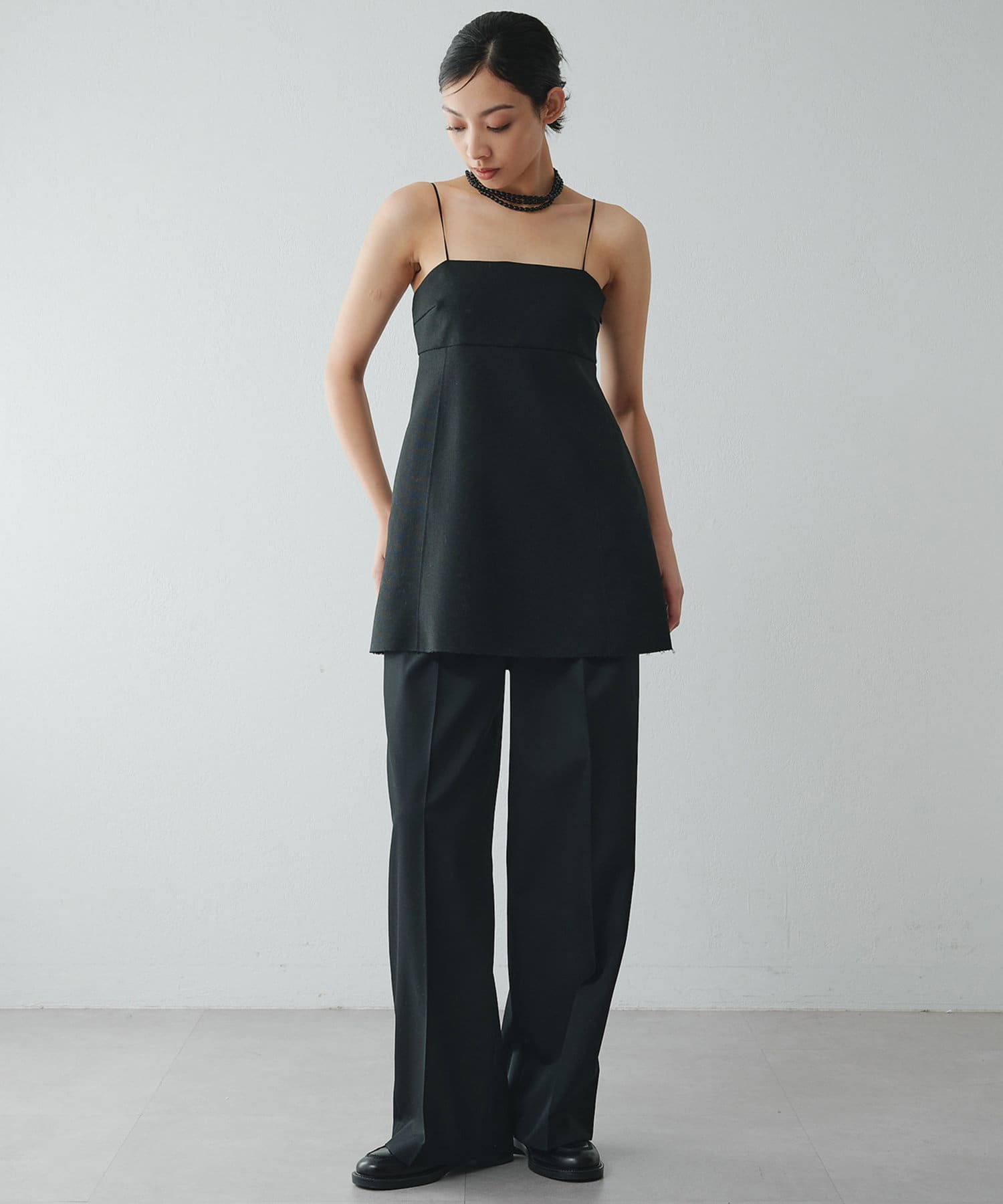 ■ハリ感と落ち感を合わせもつ素材で仕立てた大人っぽい一着。