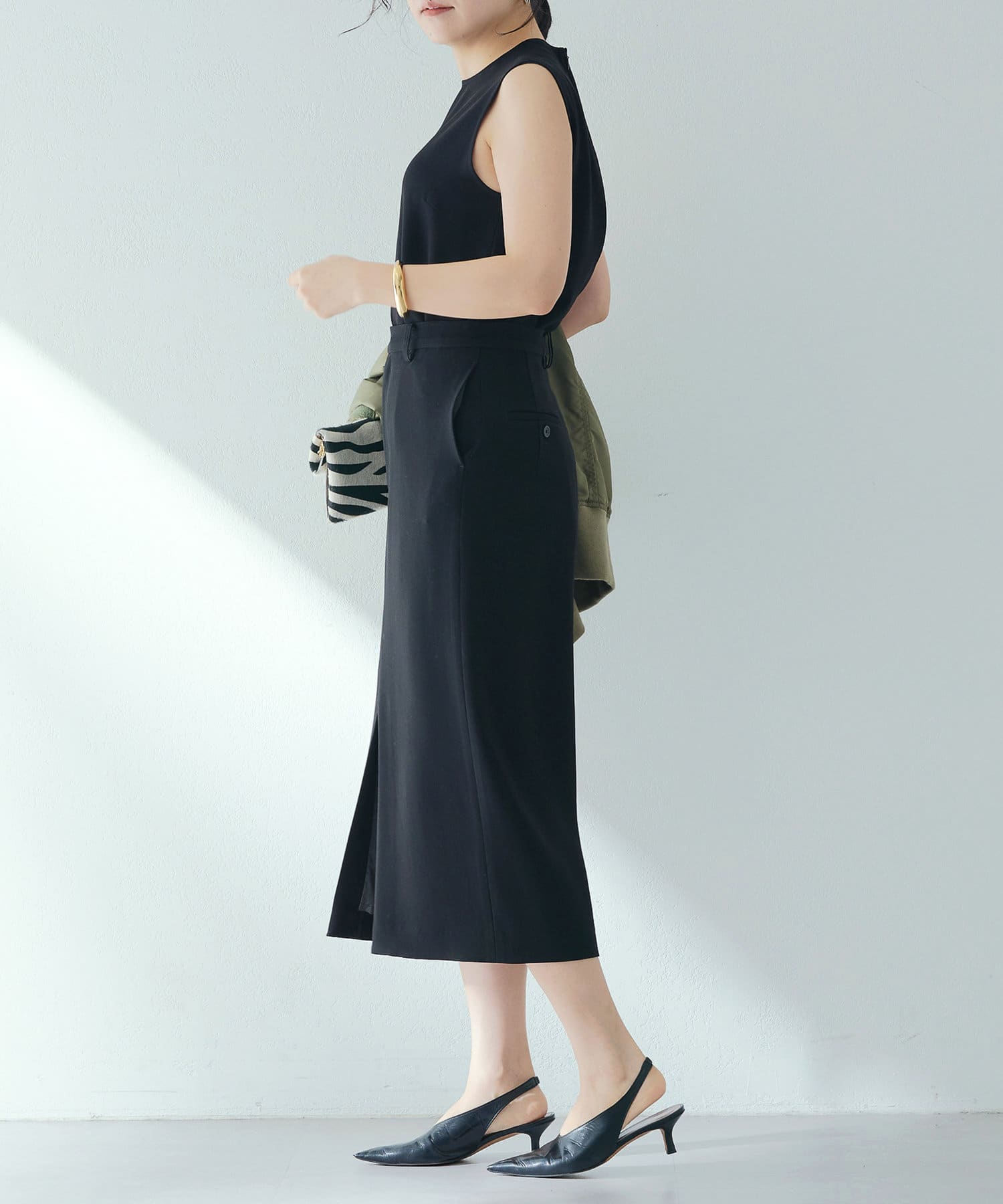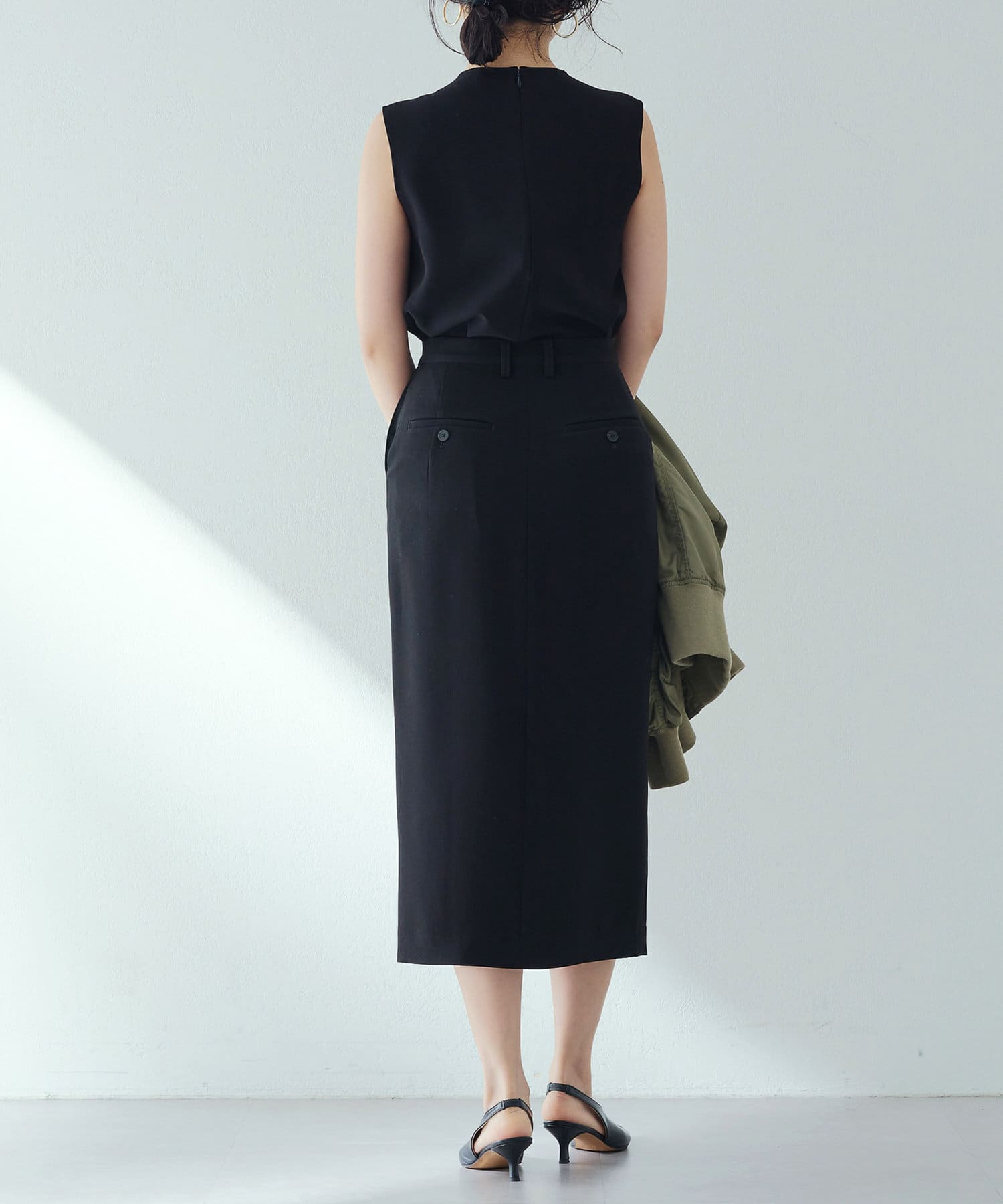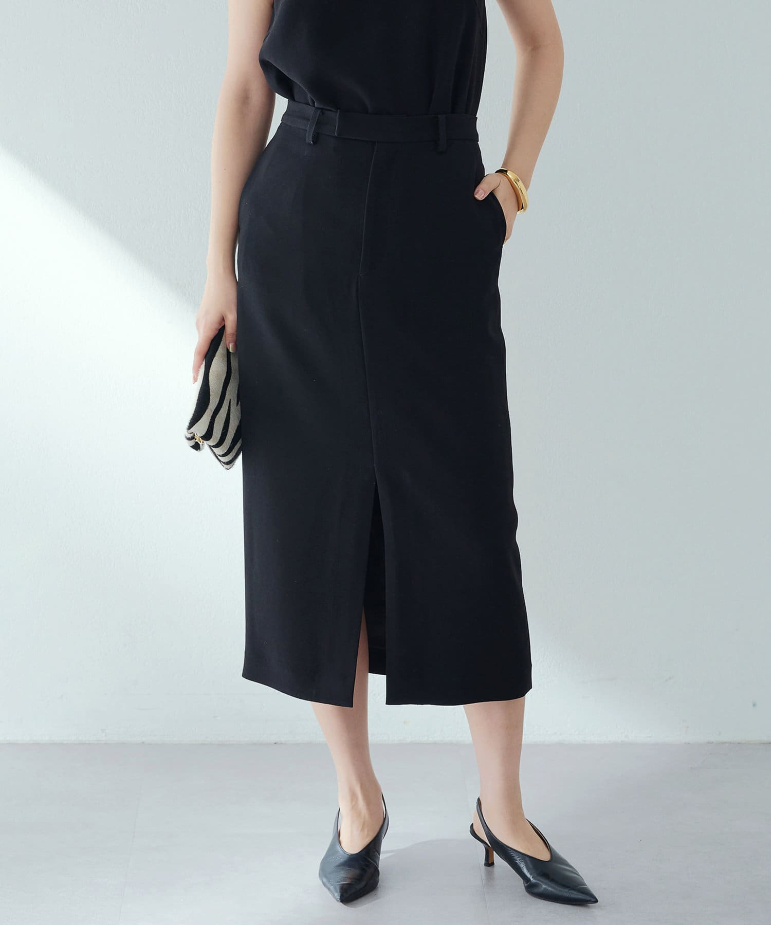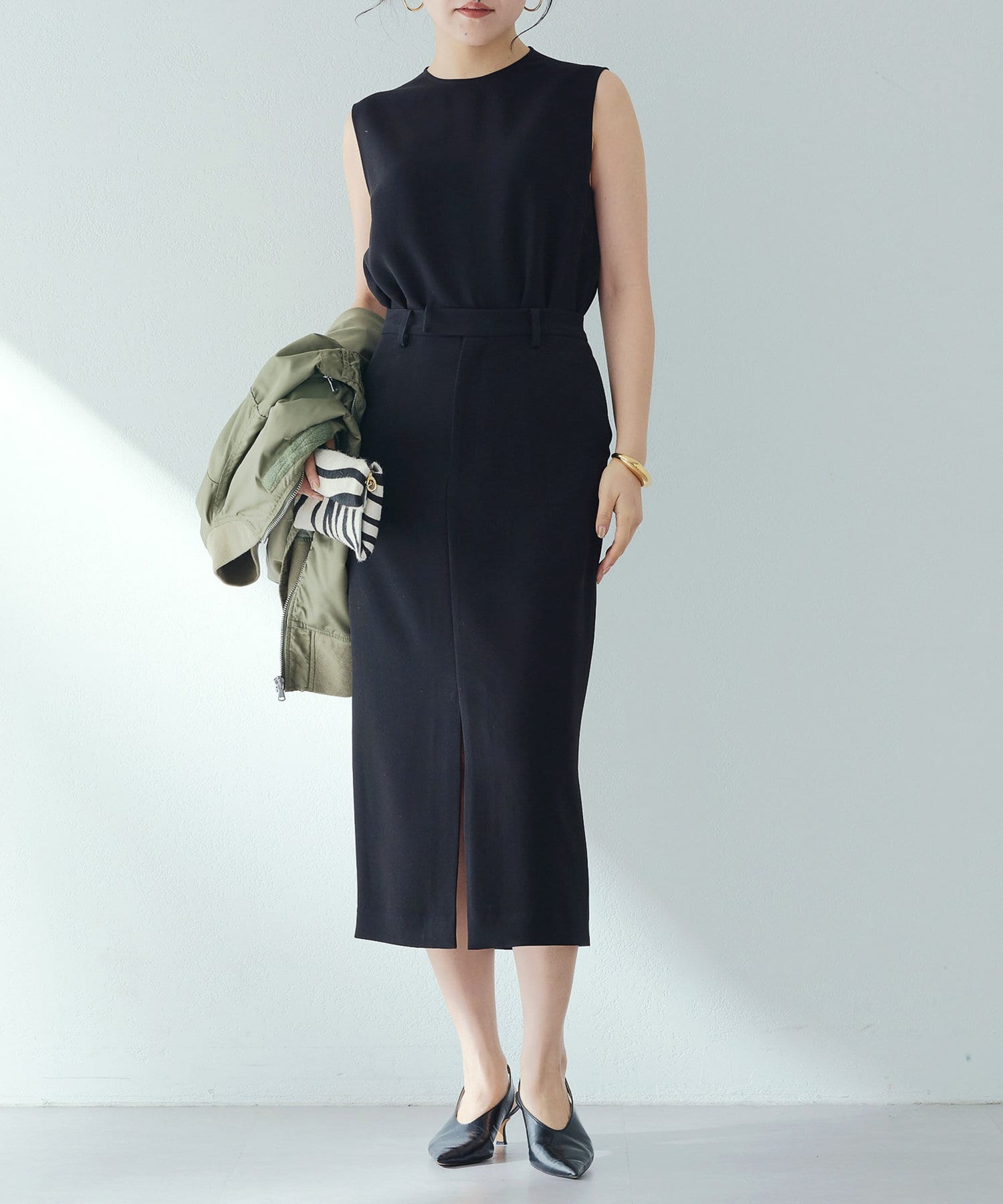 綺麗さのある大人上品なタイトスリットスカート。ドライな着心地が◎。パンツコーデが多い方でも履きやすい、すっきりとしたラインスカートです。素足は少し見えますが脚全部が見えてしまう感じはありません。丈も長めで安心。暖かい季節はベーシックに白T合わせも様になる。