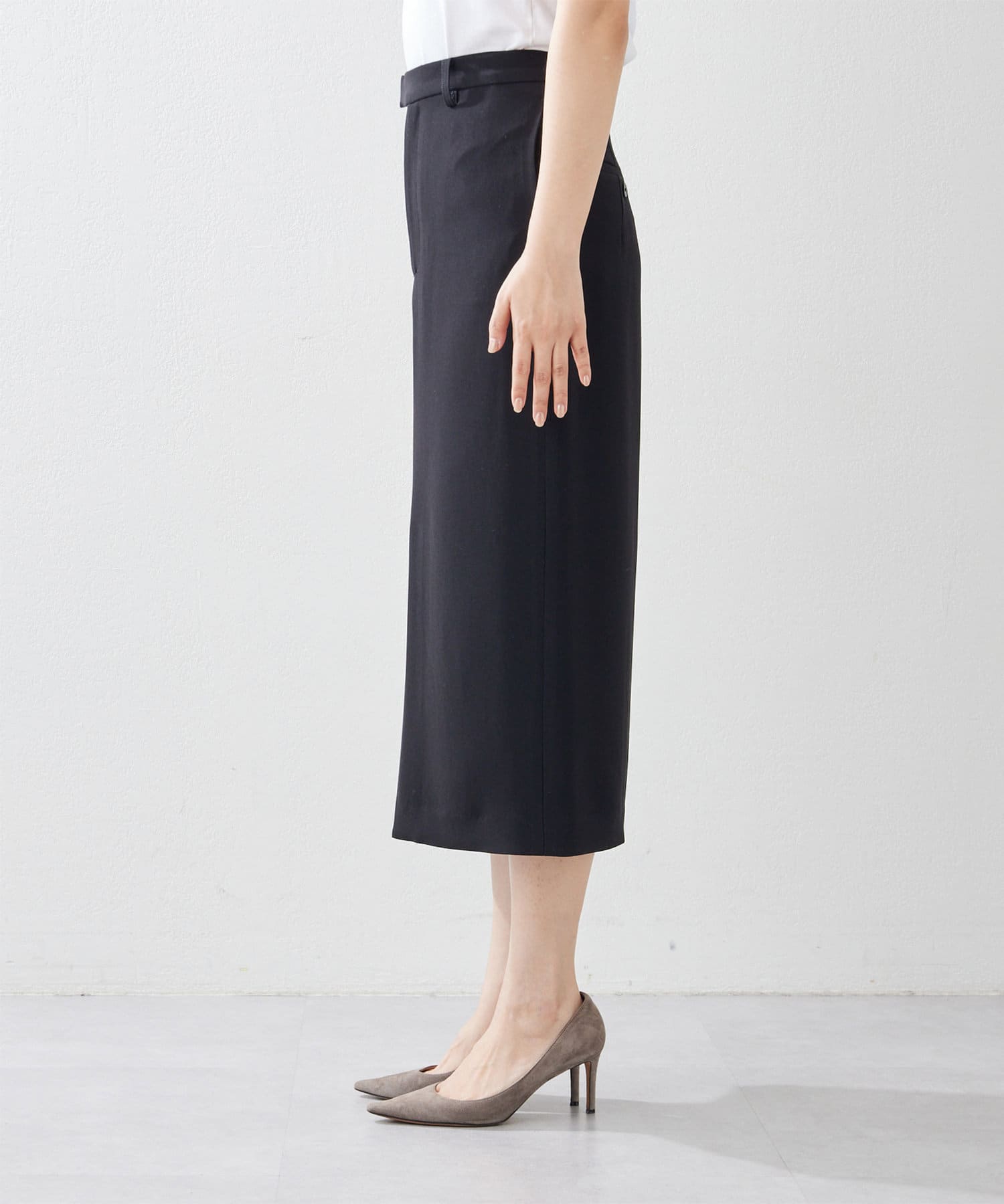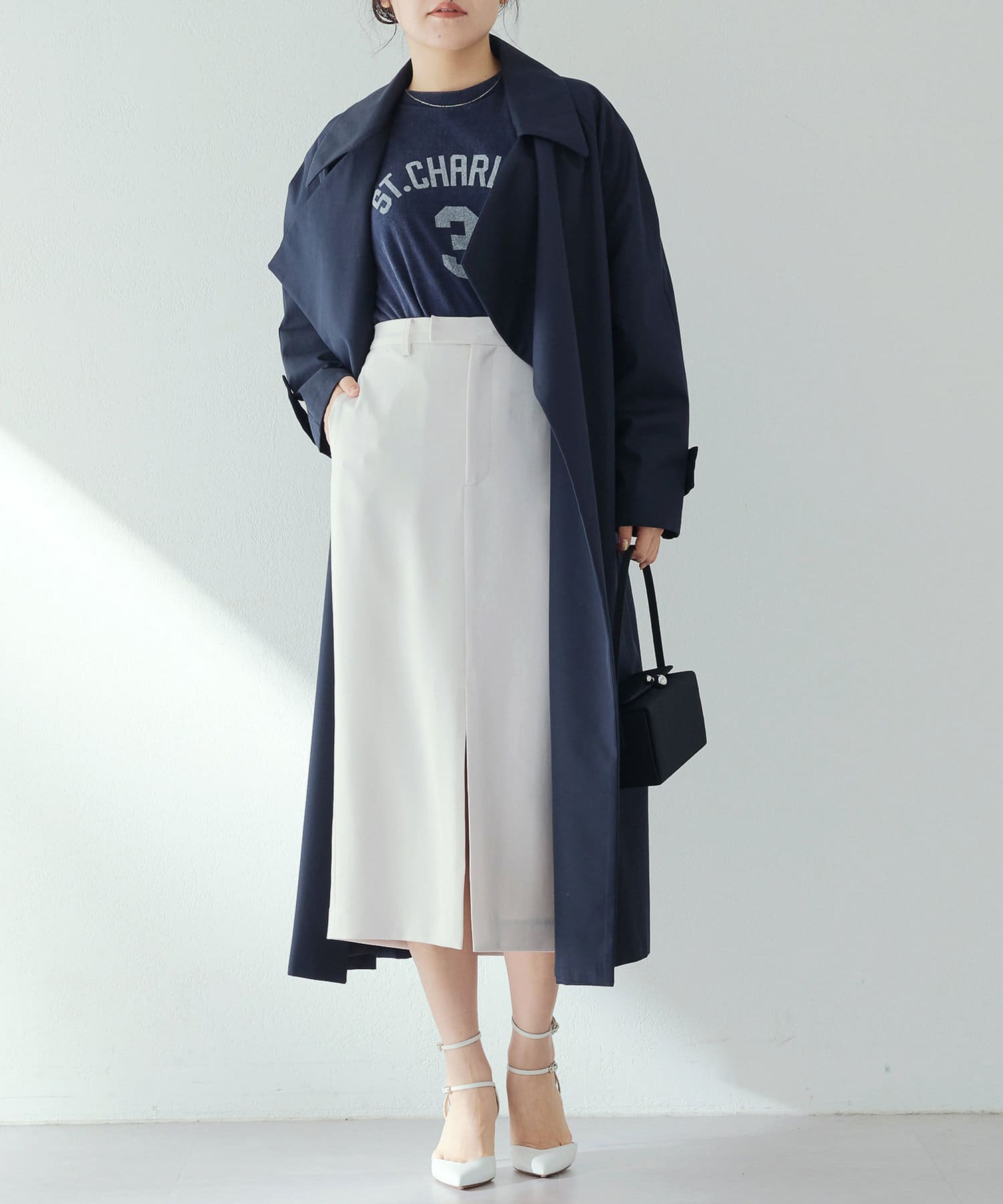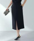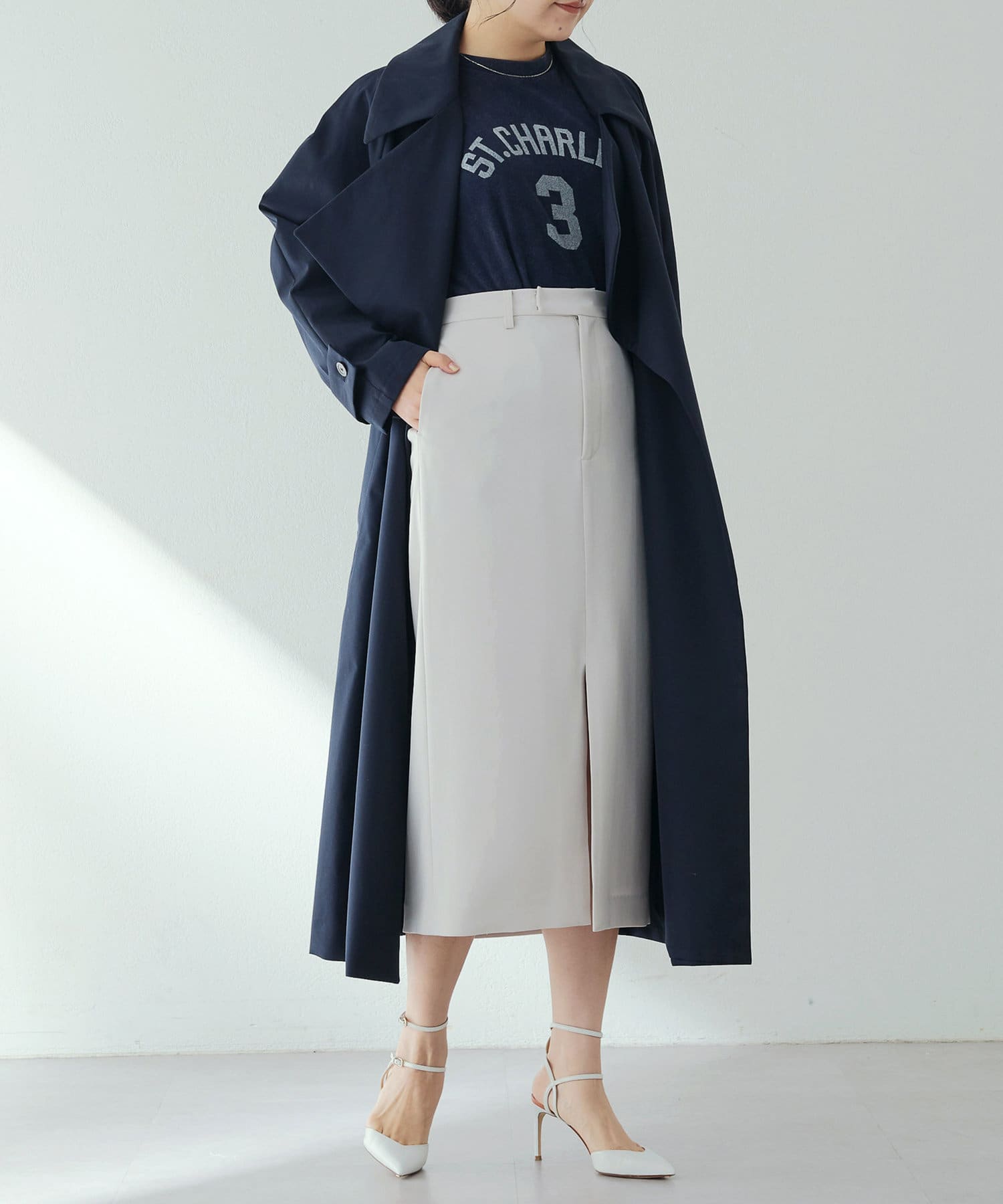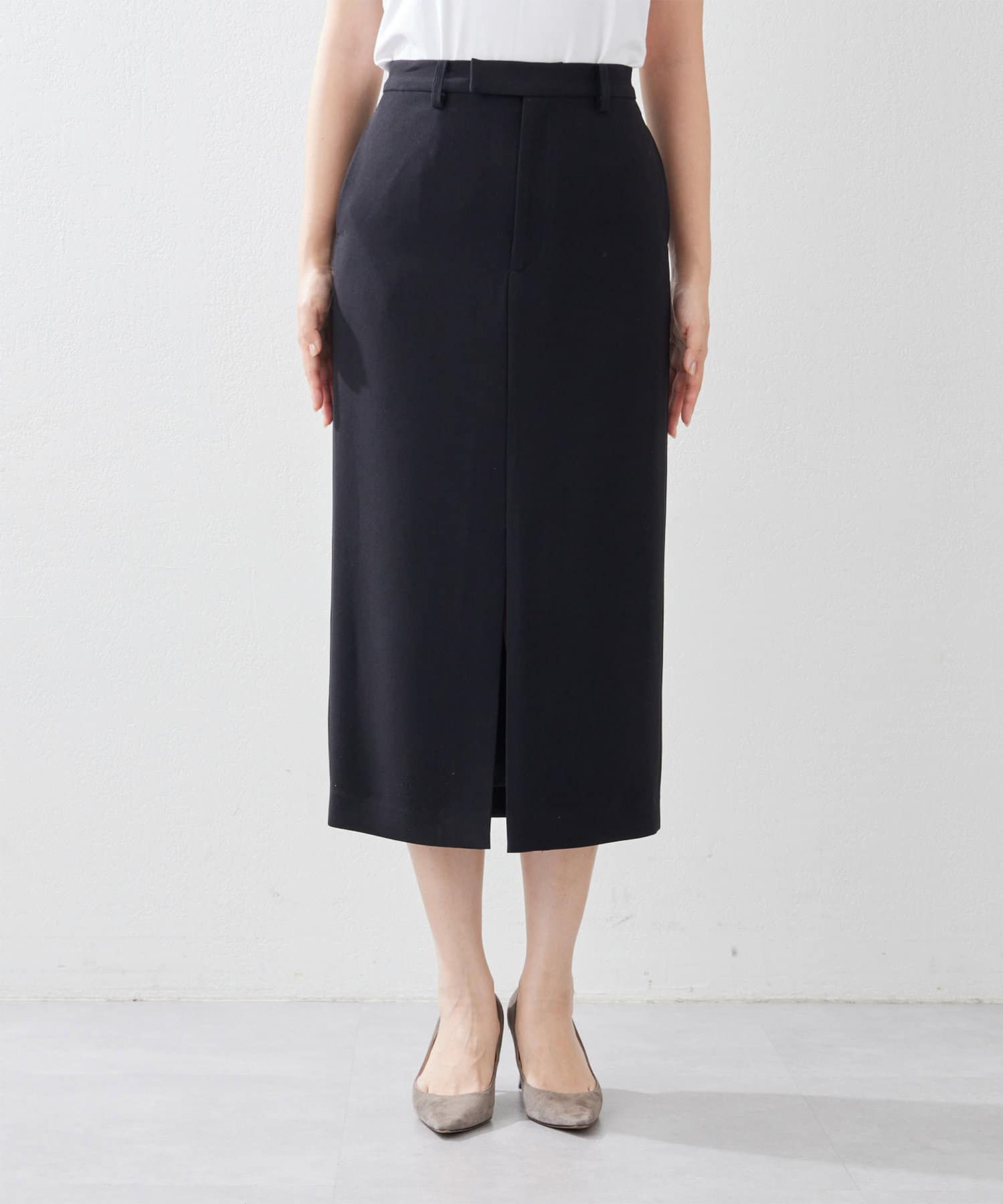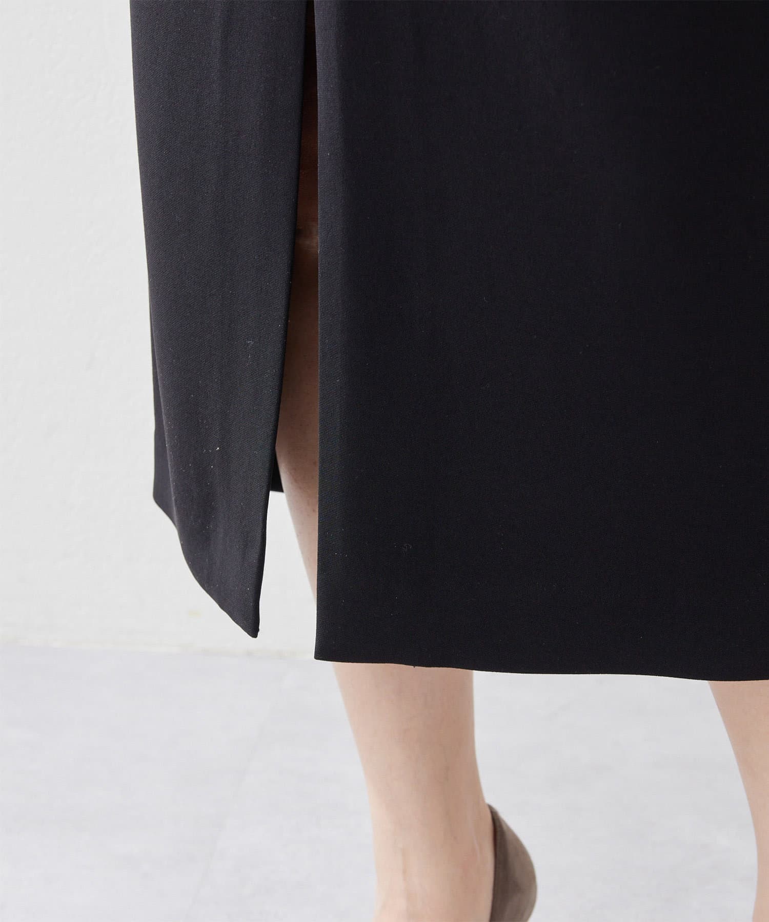 綺麗さのある大人上品なタイトスリットスカート。ドライな着心地が◎。パンツコーデが多い方でも履きやすい、すっきりとしたラインスカートです。素足は少し見えますが脚全部が見えてしまう感じはありません。丈も長めで安心。暖かい季節はベーシックに白T合わせも様になる。