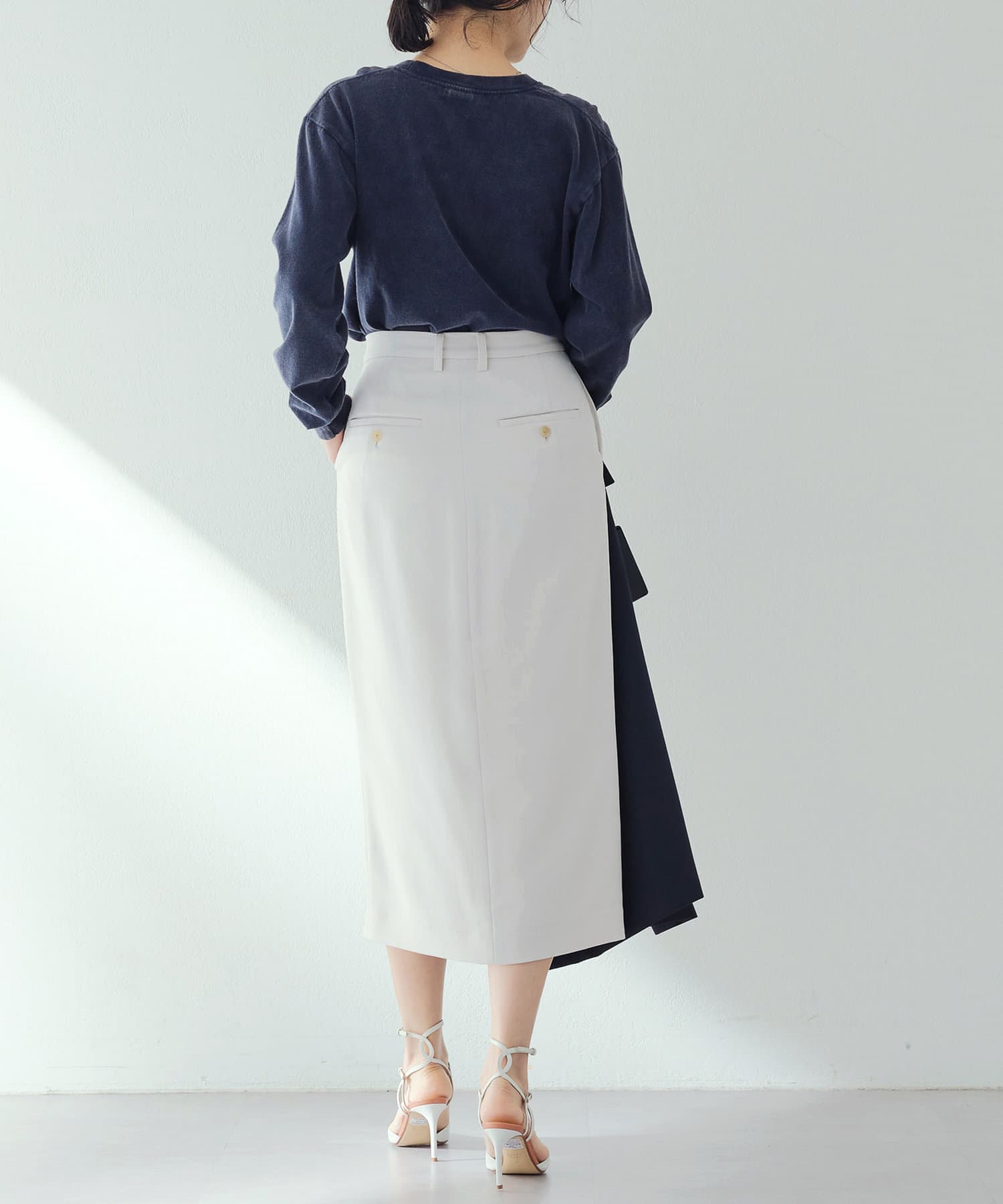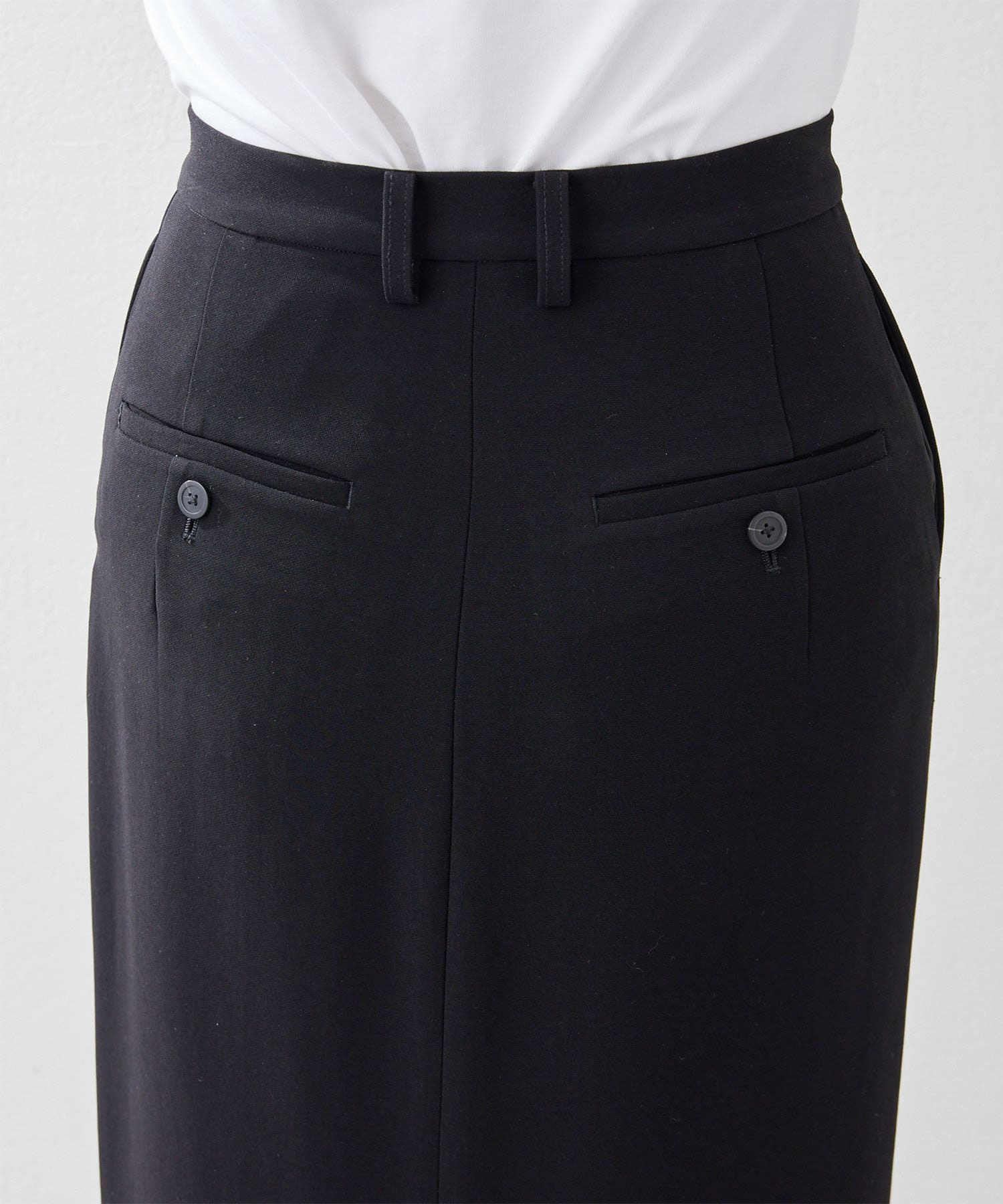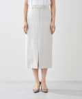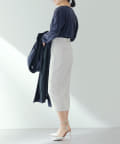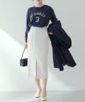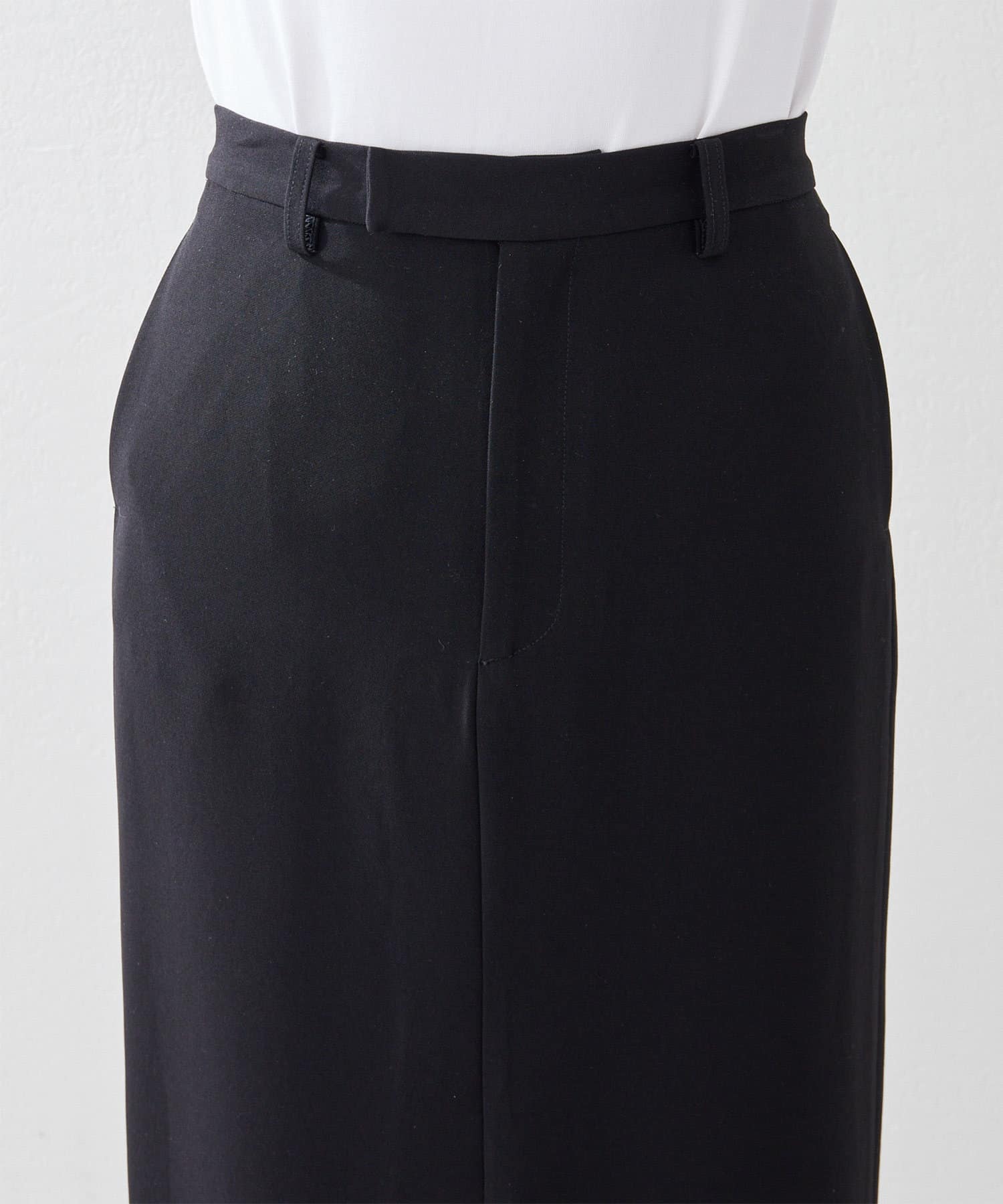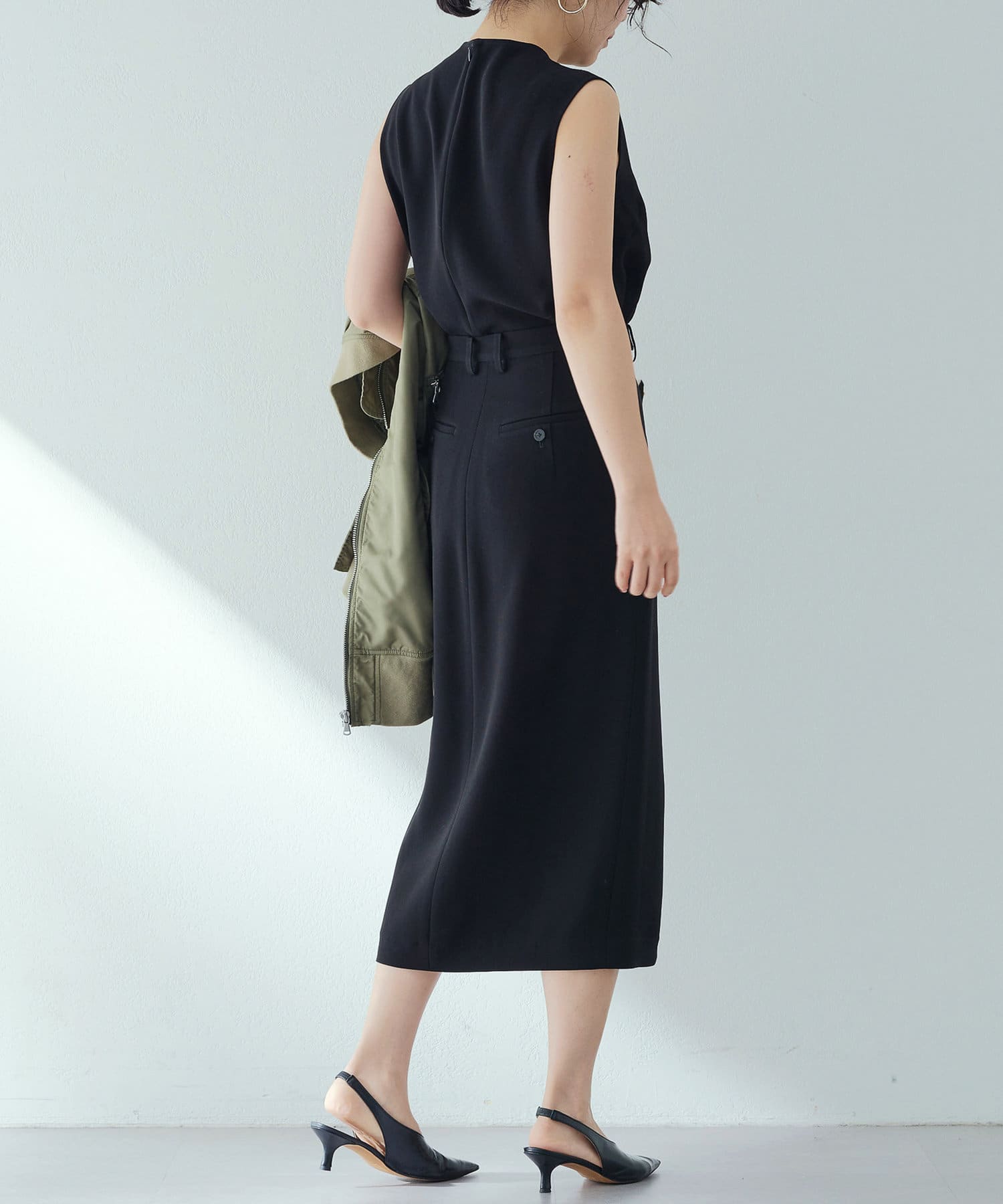 綺麗さのある大人上品なタイトスリットスカート。ドライな着心地が◎。パンツコーデが多い方でも履きやすい、すっきりとしたラインスカートです。素足は少し見えますが脚全部が見えてしまう感じはありません。丈も長めで安心。暖かい季節はベーシックに白T合わせも様になる。