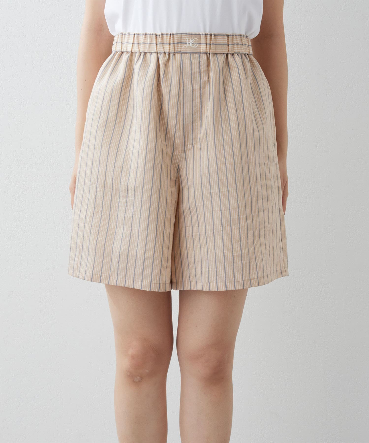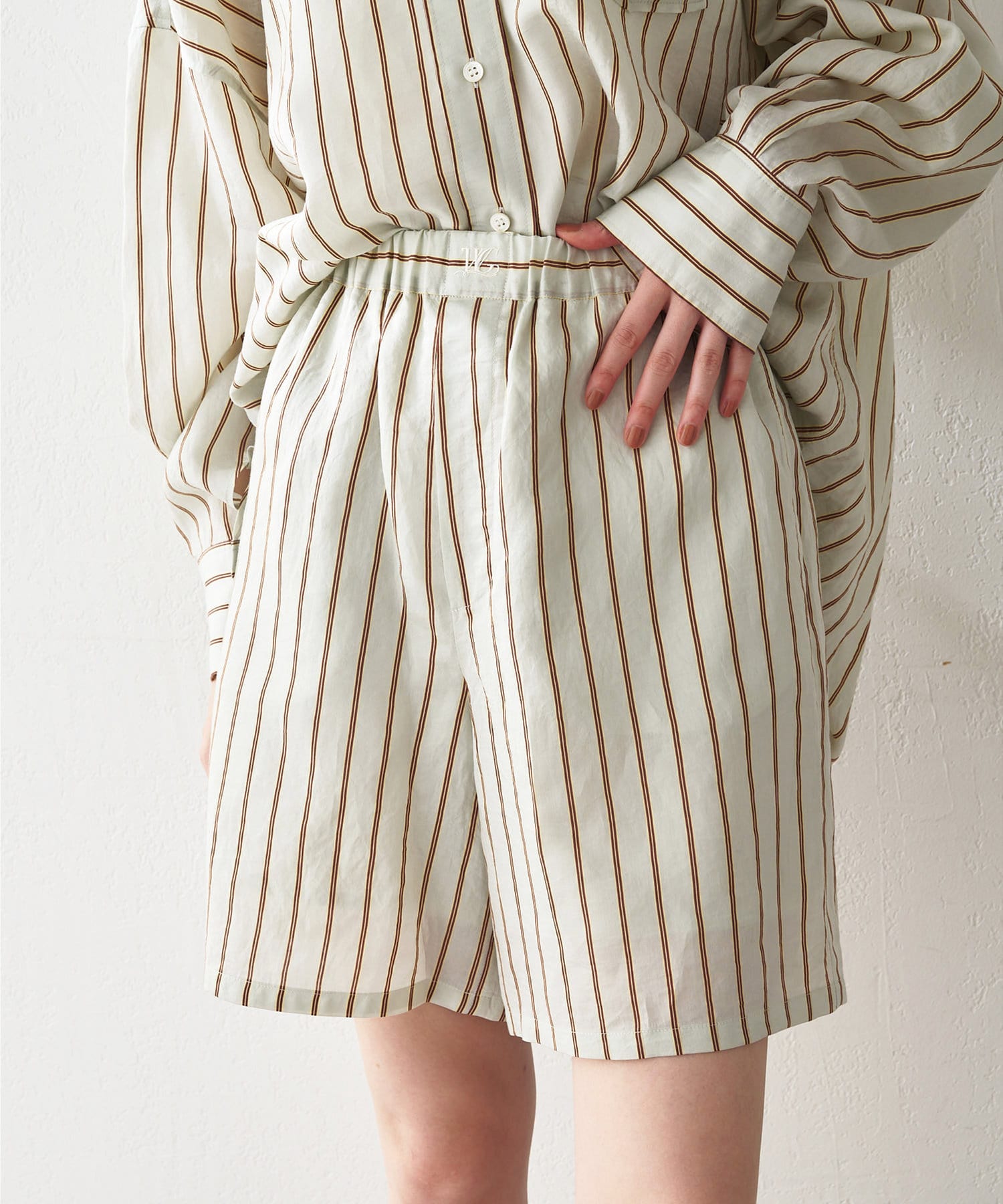■シャツ地でトランクスディテールに仕上げたストライプショートパンツ。
