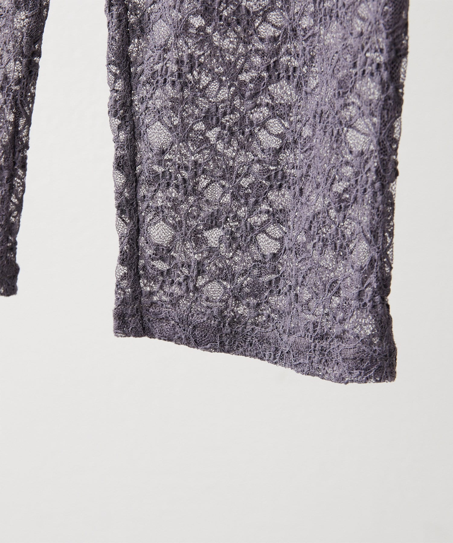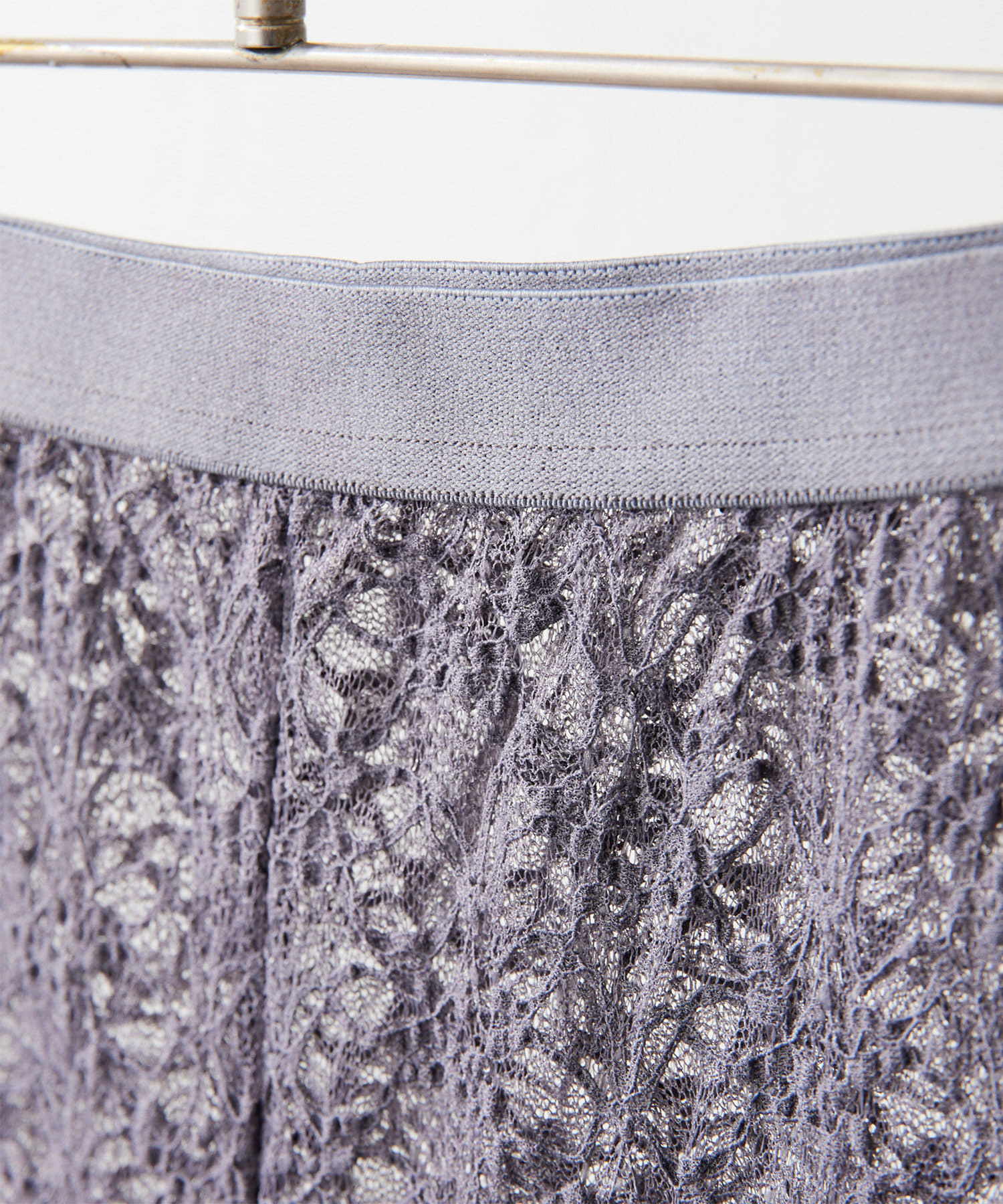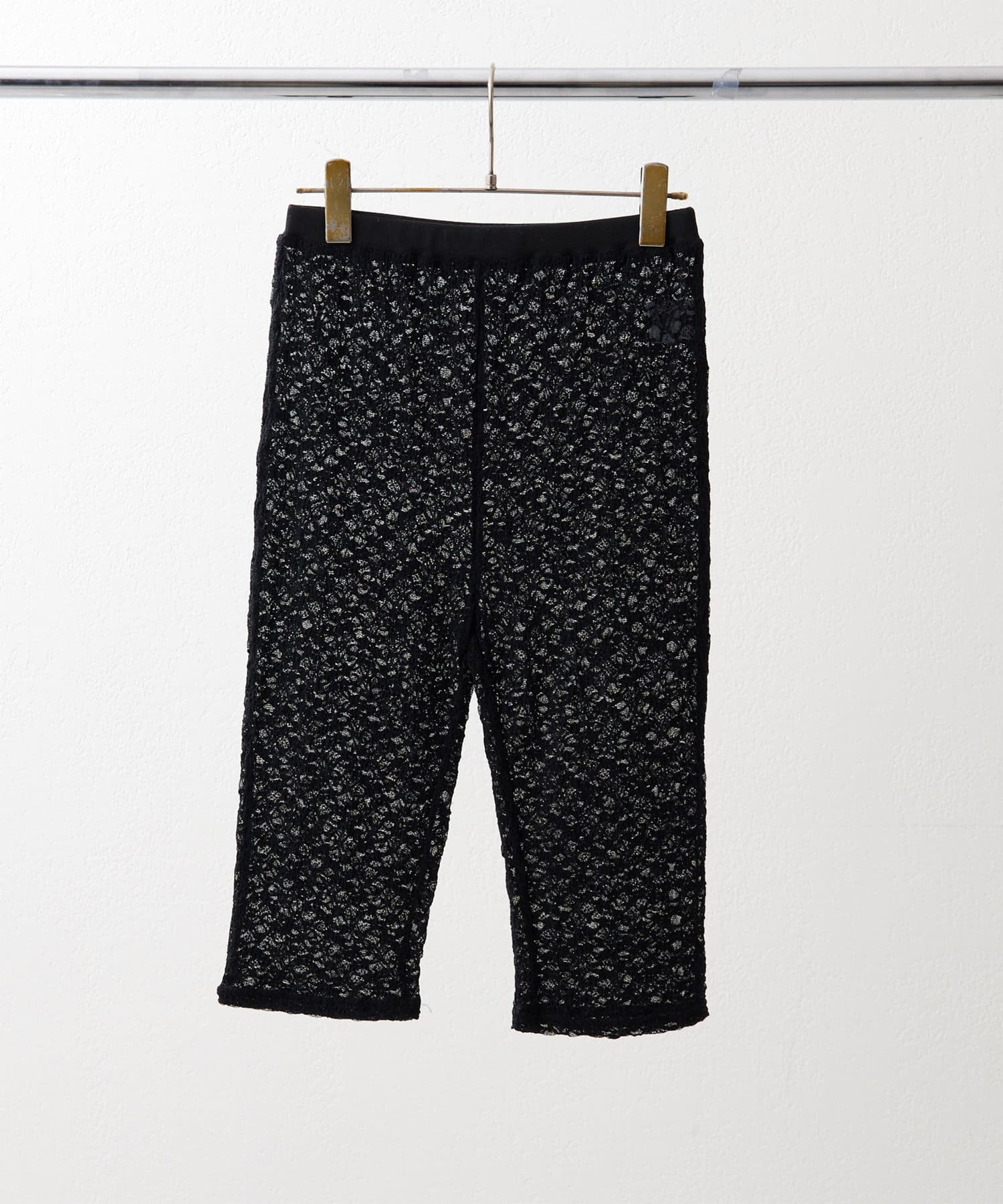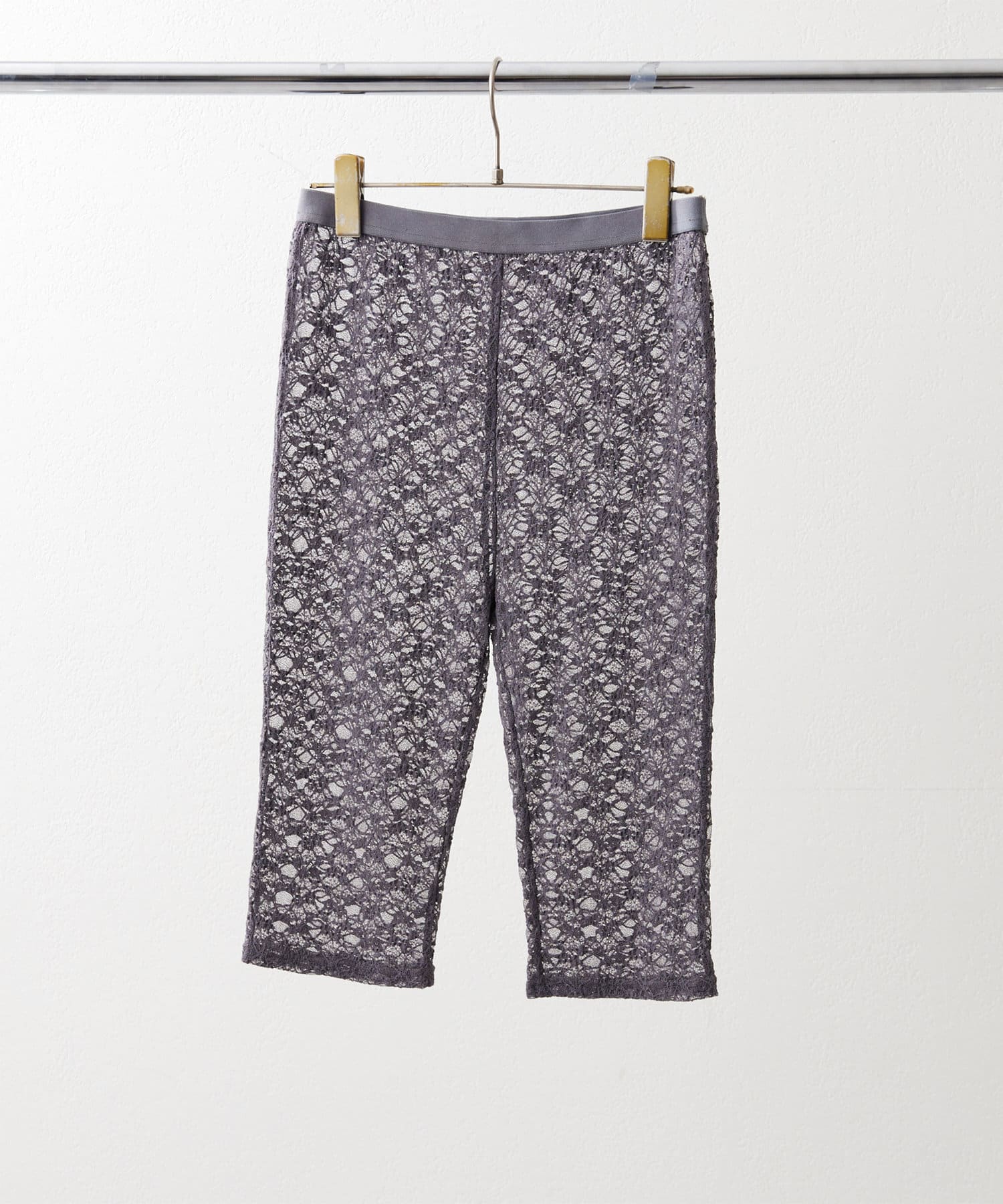 伸縮性あるレースパンツ。全面に透け感があります。デニムを合わせてウエストラインからレースをのぞかせたり、シャツワンピースに合わせるのも可愛い。レース自体はチクチクしません。