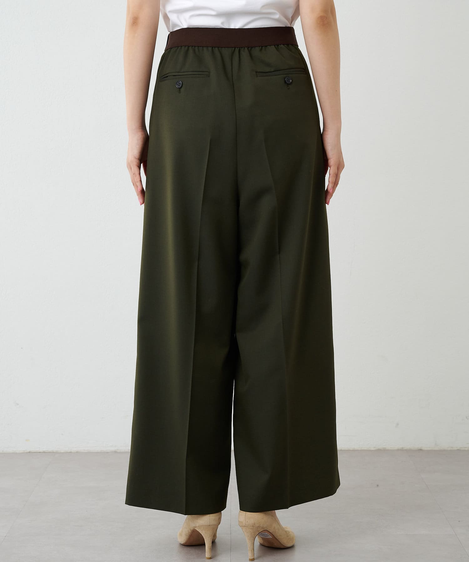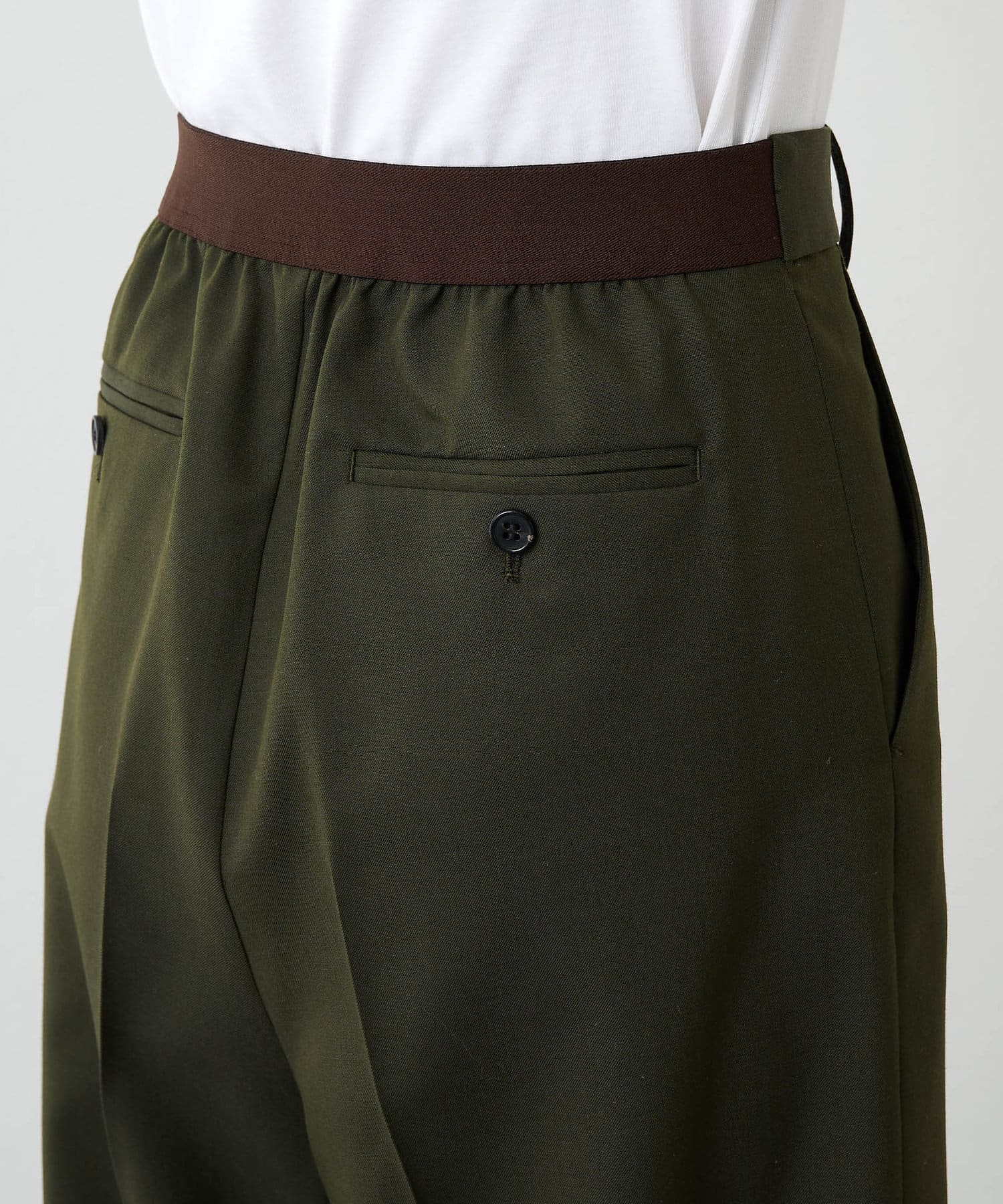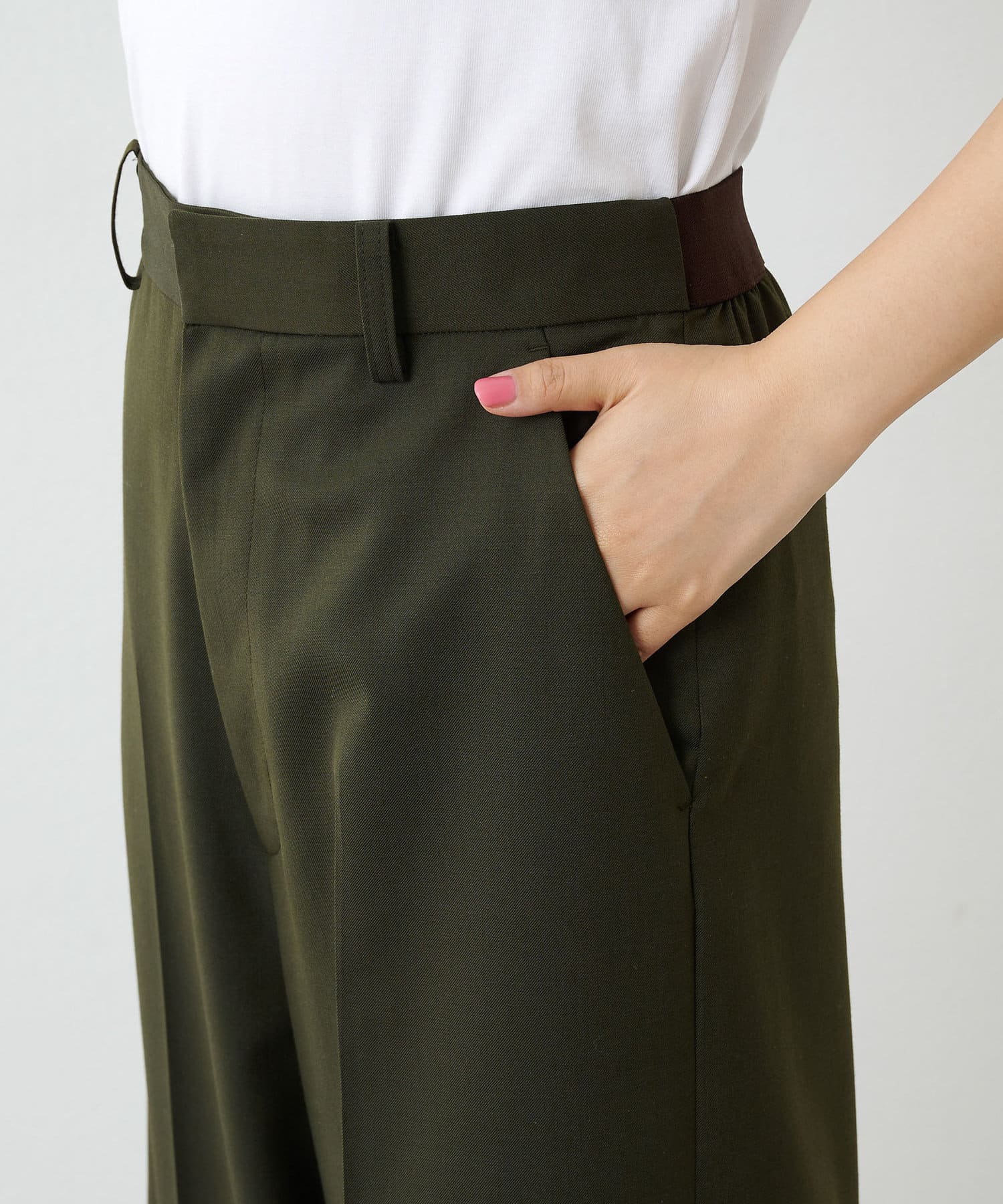 ■フロントはきれいめなスラックス見えしつつ、後ろのゴムベルト使いが特徴的なデザイン。