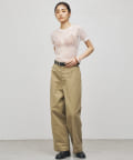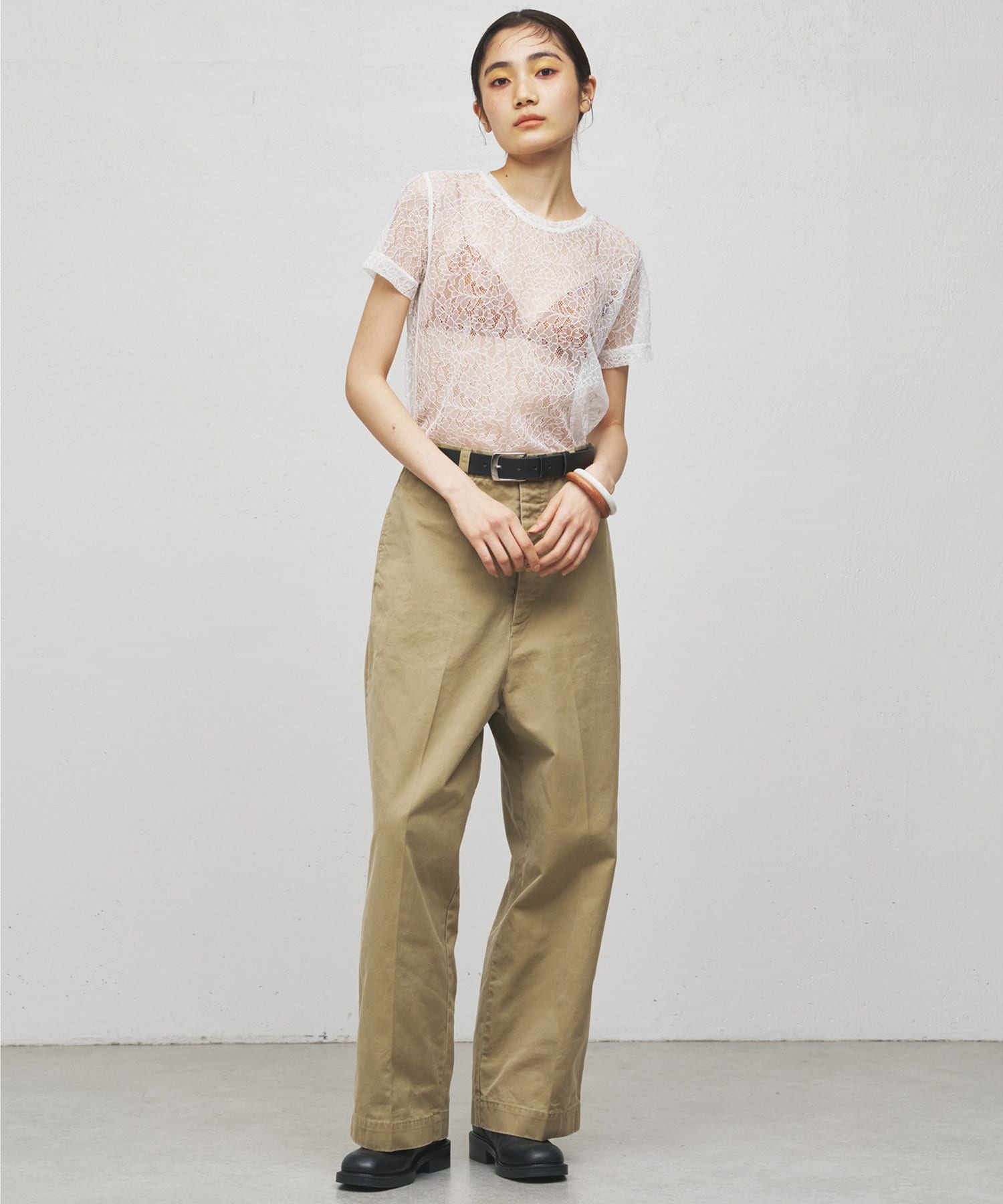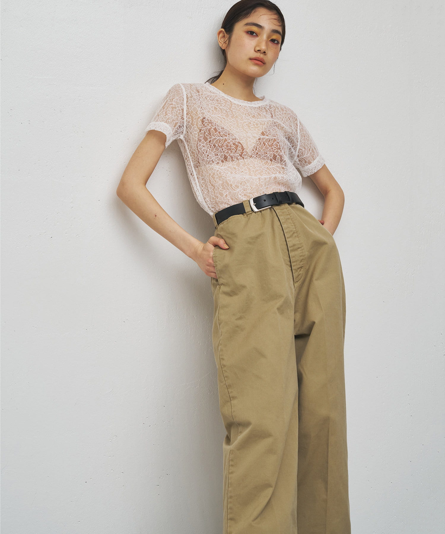 ■シアー素材やレース素材、コンパクトなシルエットなど、女性らしさのあるトップスとのスタイリングがおすすめ。