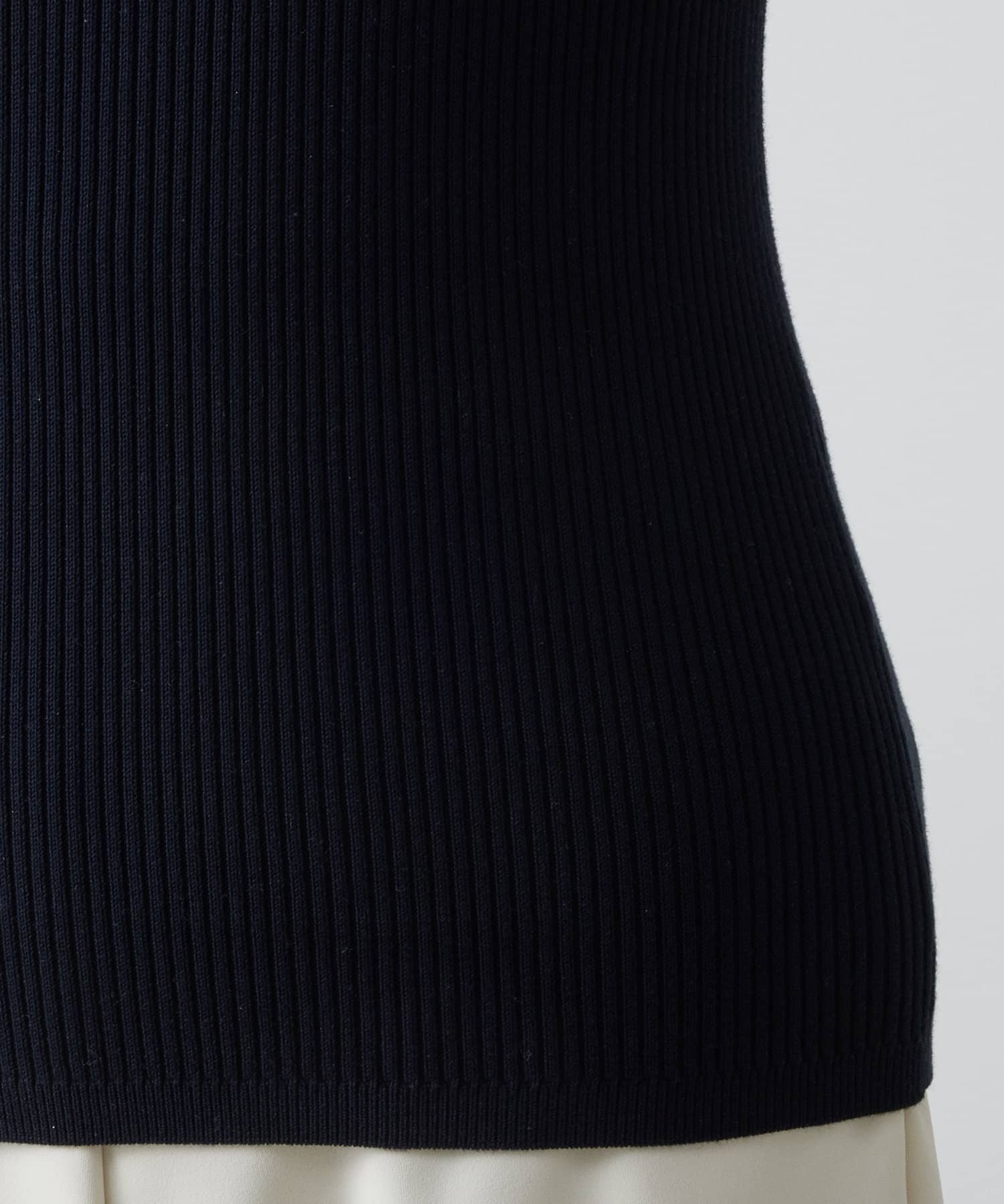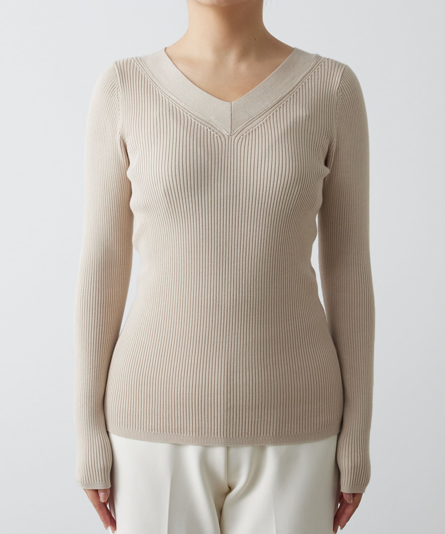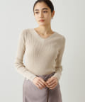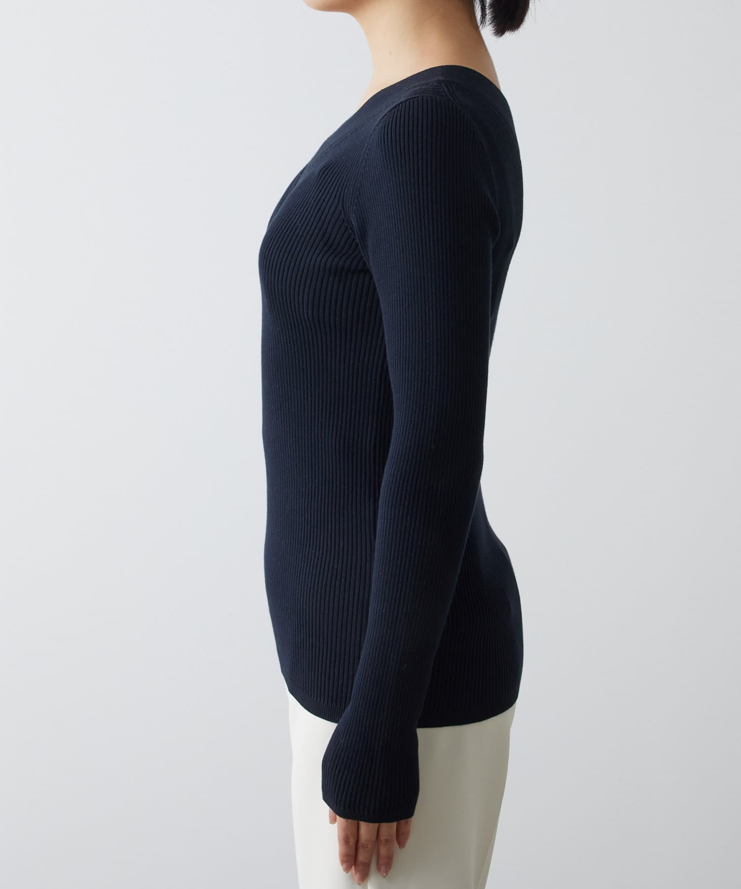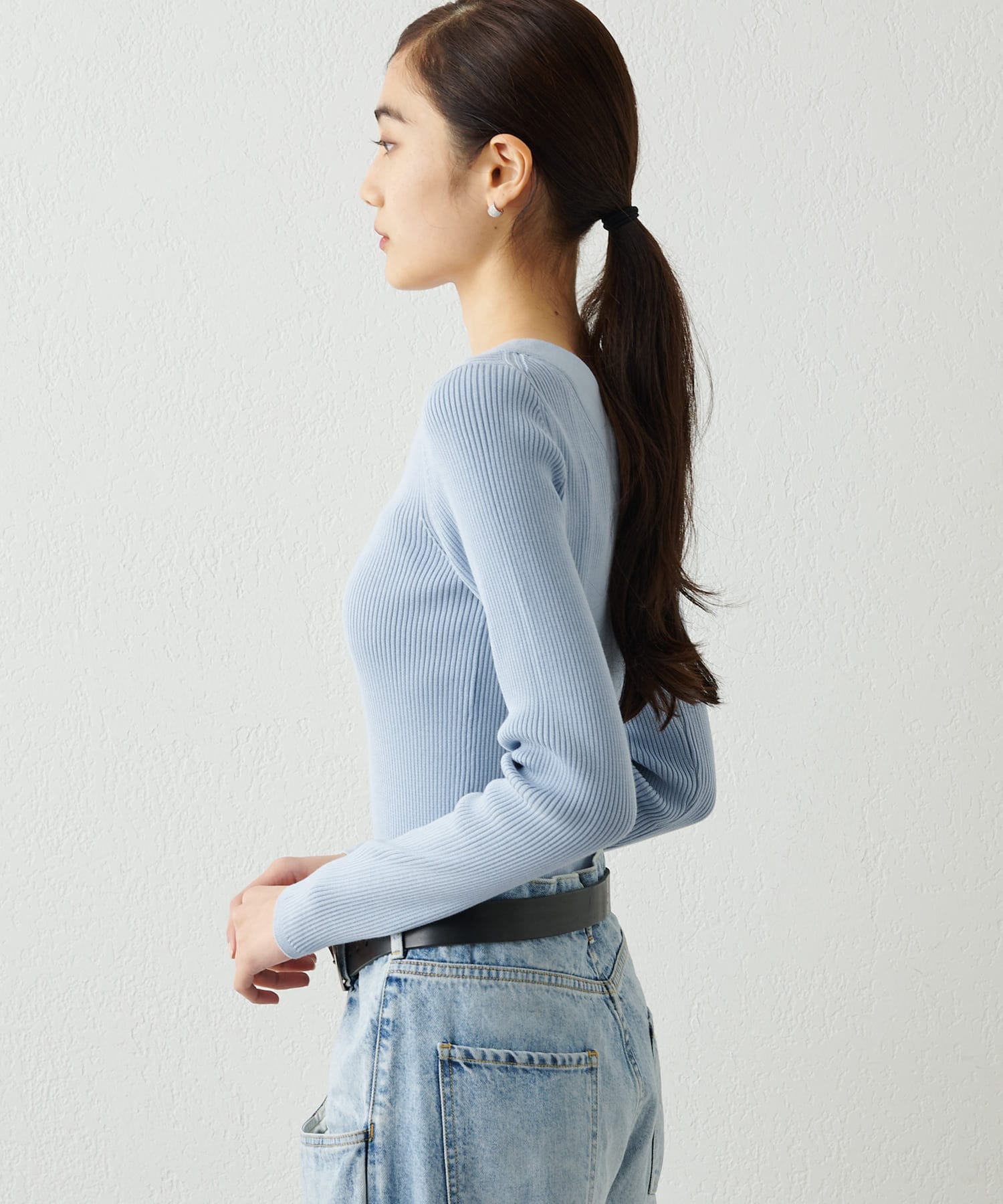 柔らかなタッチで着心地の良いリブニット。顔まわりがスッキリとした印象に。リブならではの女性らしさがあり、合わせるアイテムによっては雰囲気を変えられます。オンオフ活躍間違いなし。