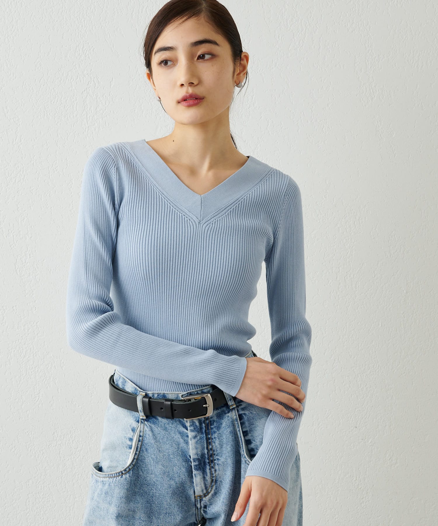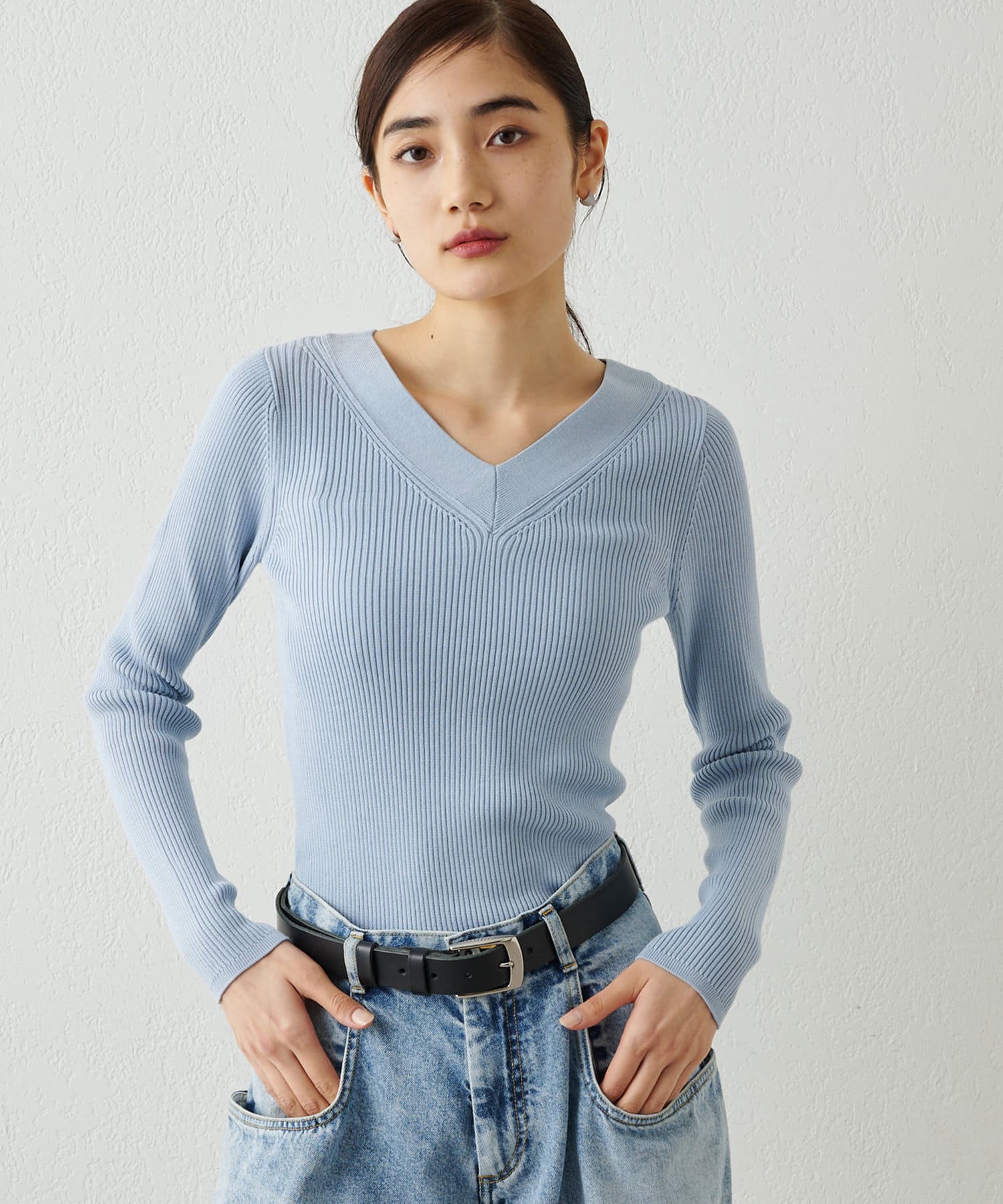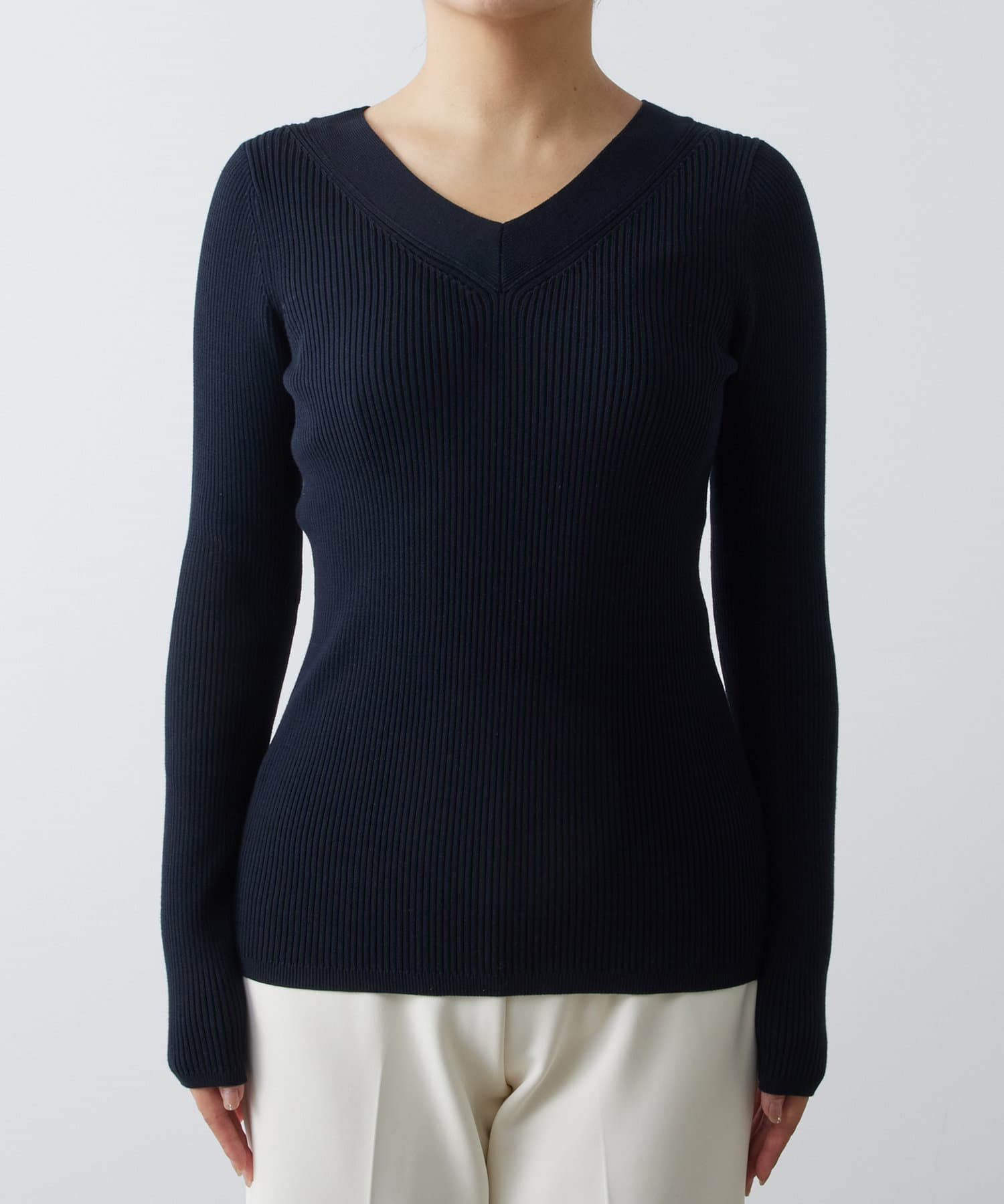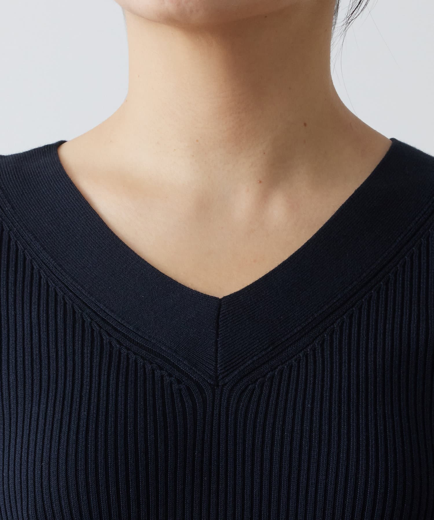 ■程よいデコルテの開き具合がすっきりと着こなせるVネックリブプルオーバー。