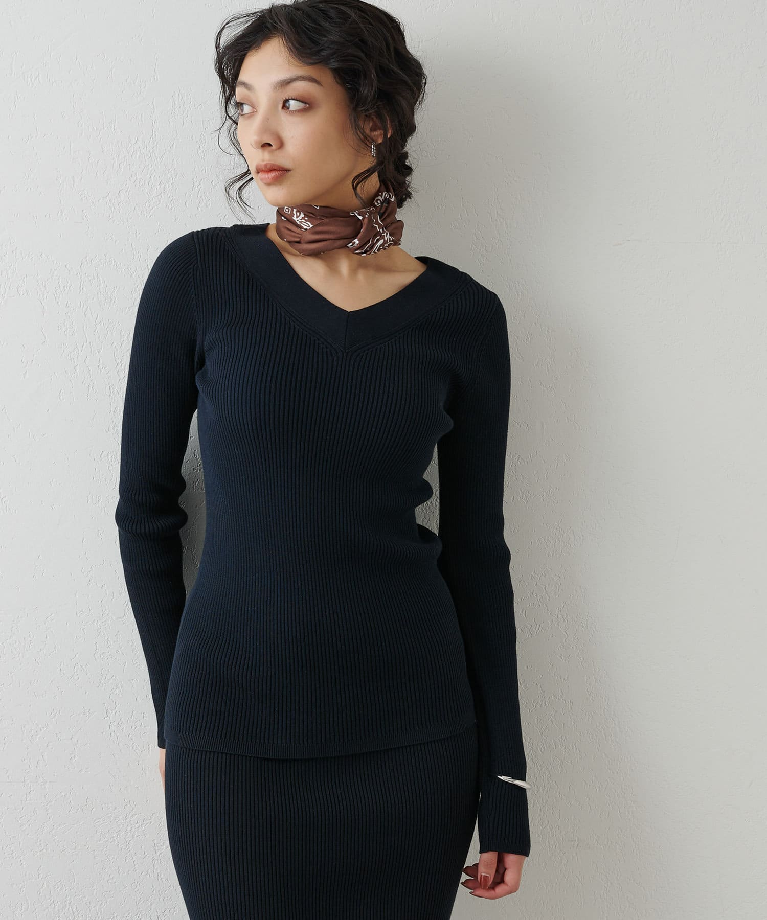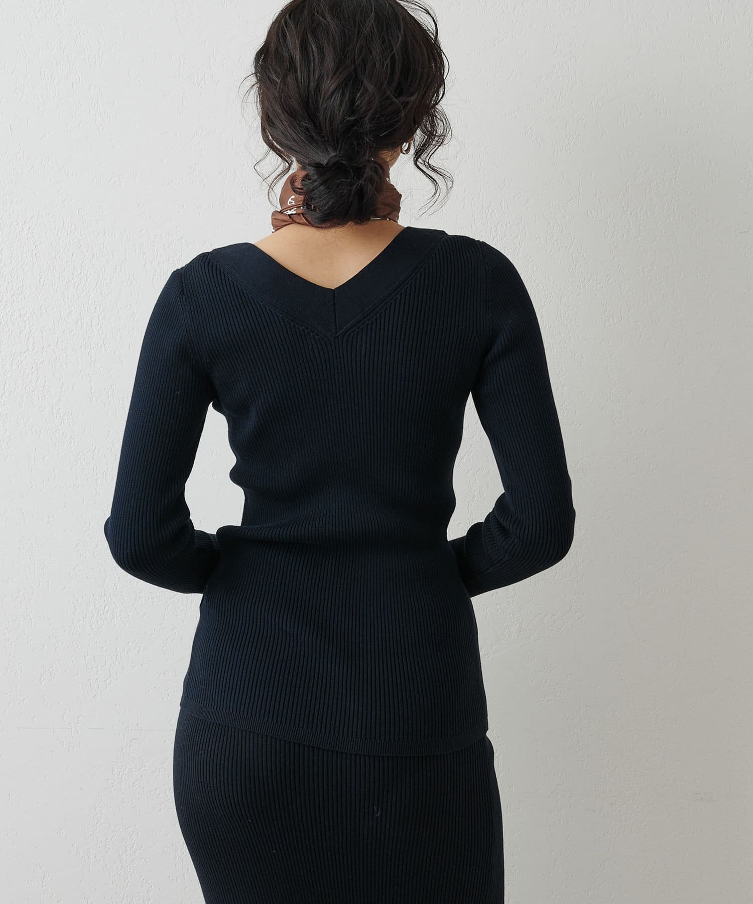 デコルテが綺麗に見えるVネックライン。1枚着るだけで女性らしいシルエットに。身体には沿いますが窮屈な感じはないです。セットアップで揃えれば、さらにコーディネートの着回しが楽しめます。