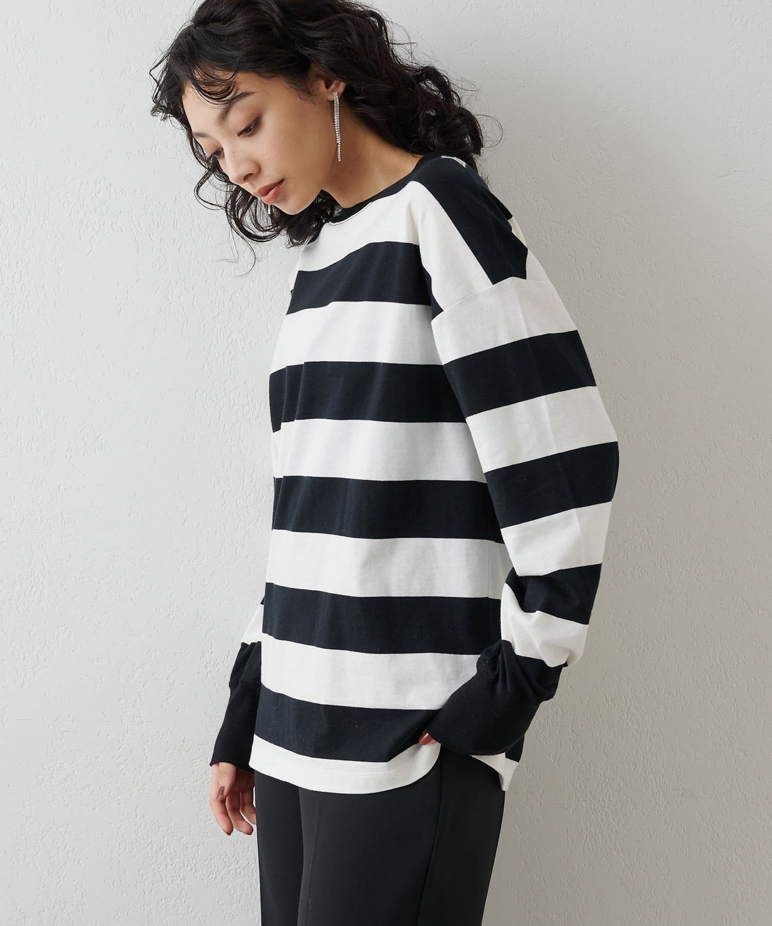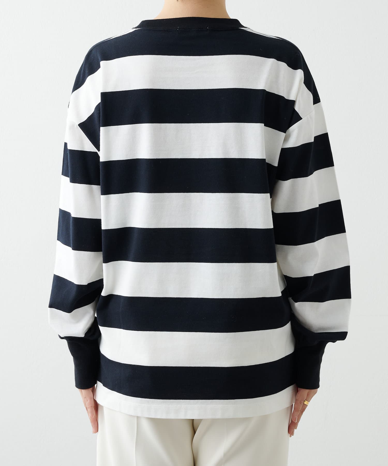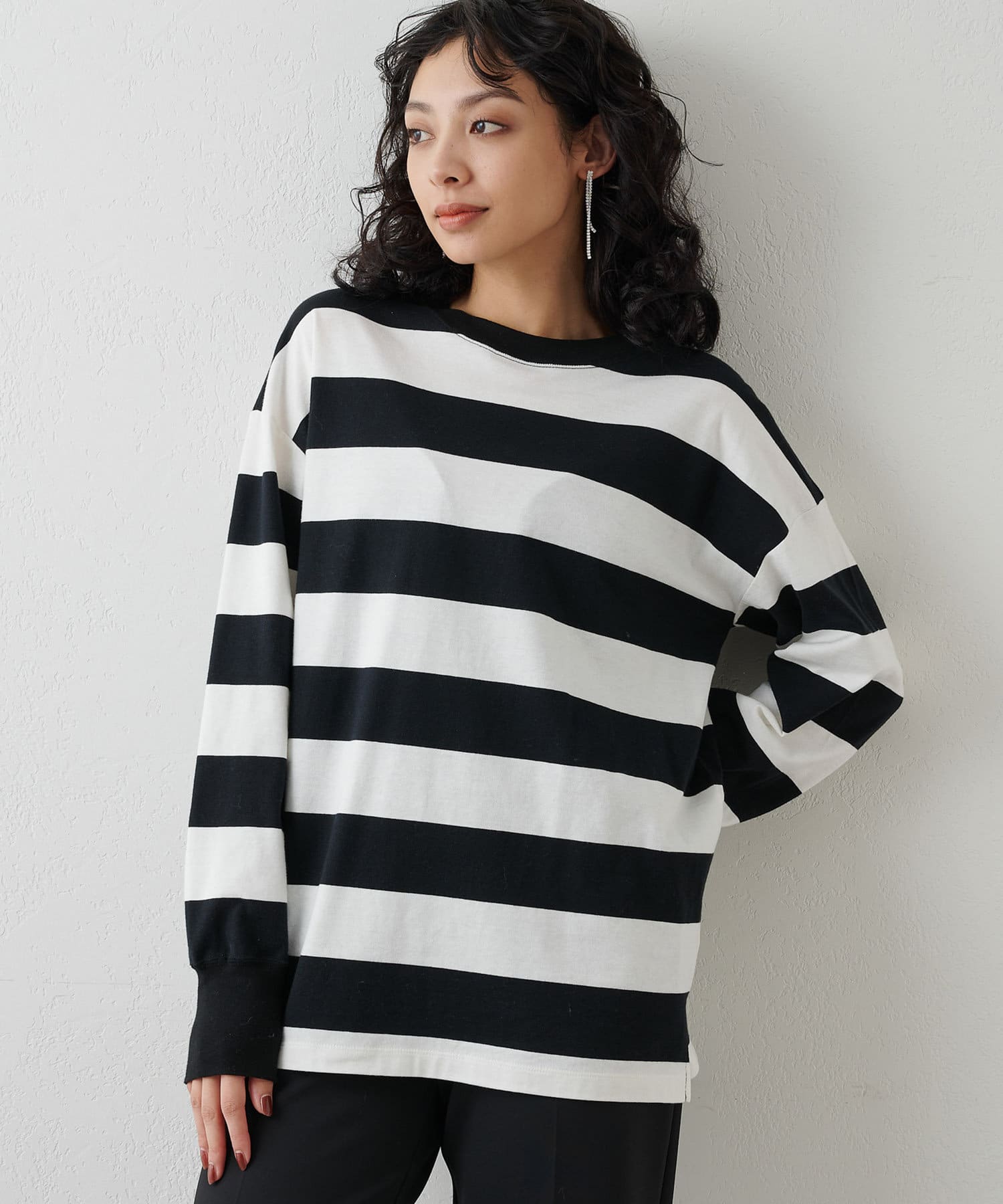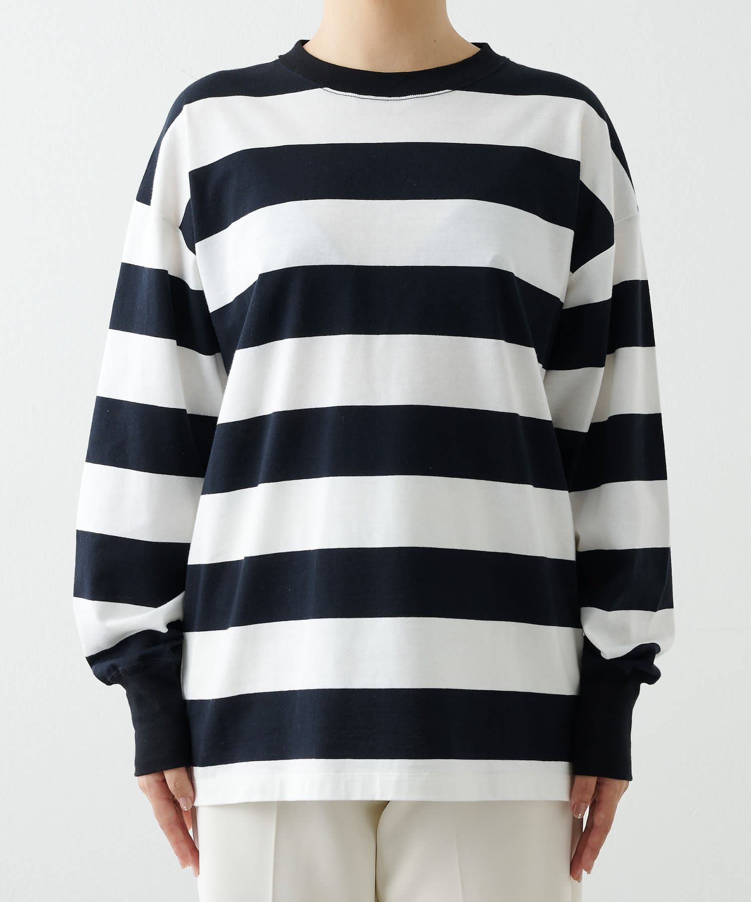 ■リラックス感のある程よいオーバーシルエットと太ボーダー柄がアクセントに。