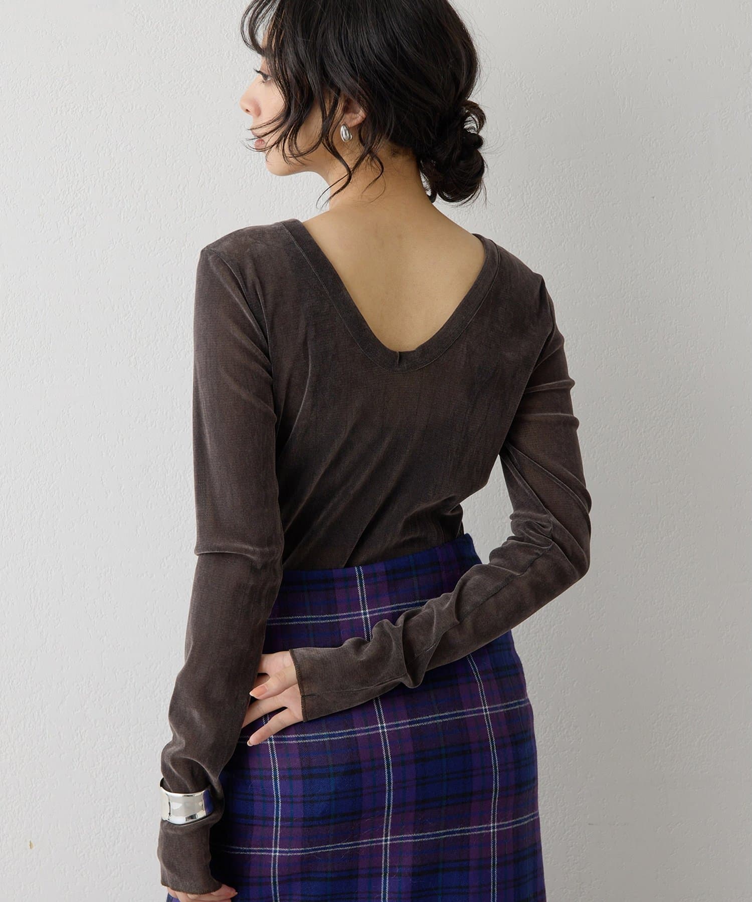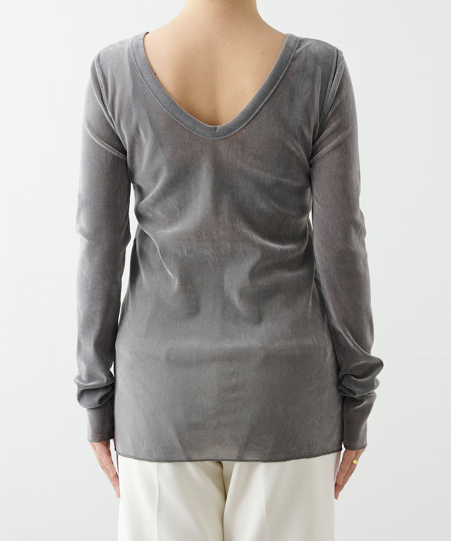 ■大胆な背中の開きと透け感のある風合いが女性らしい一枚。