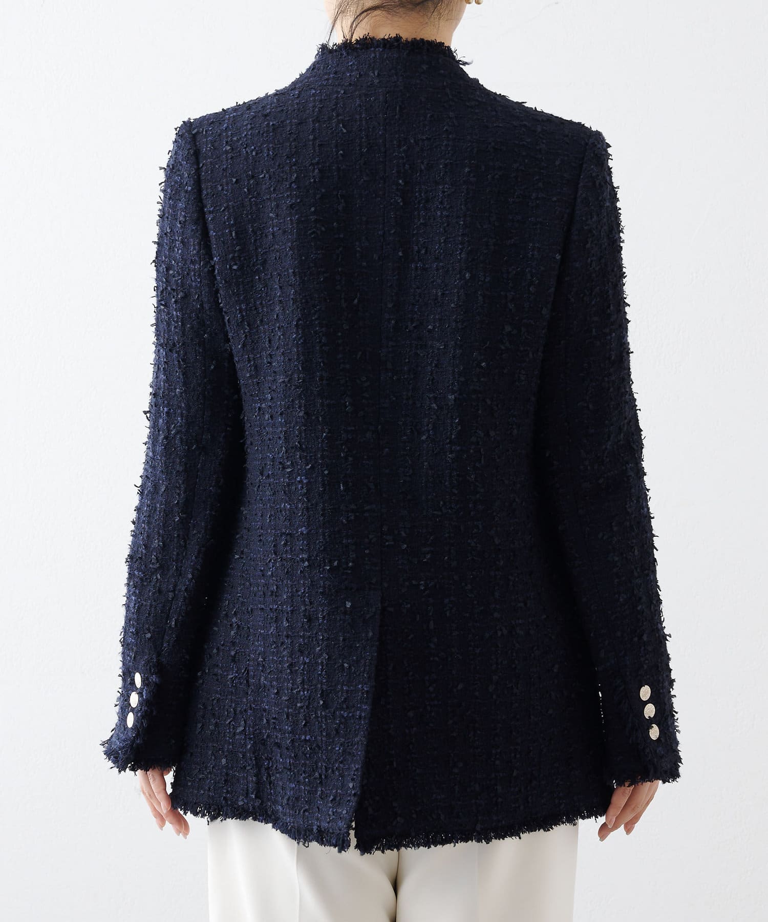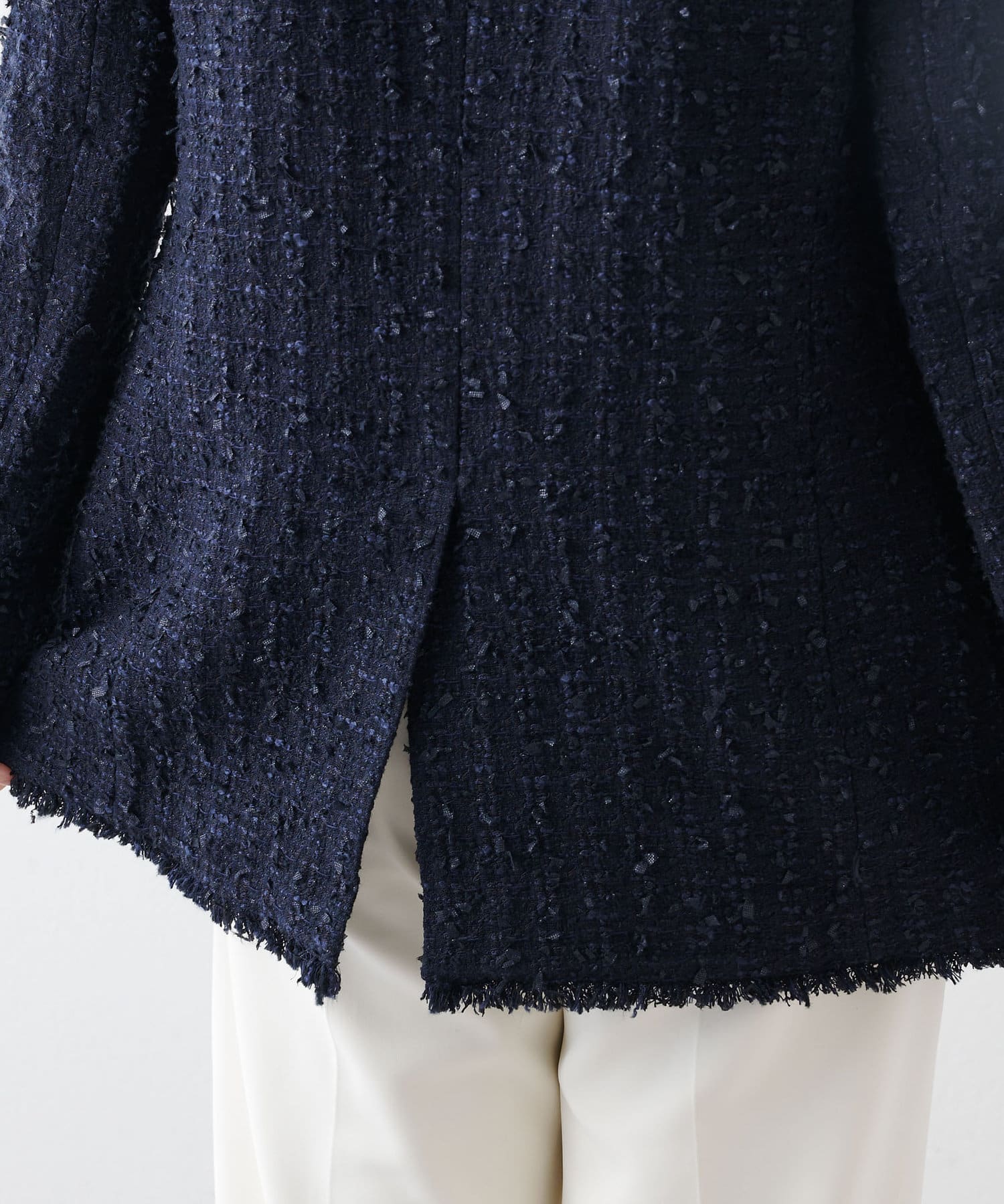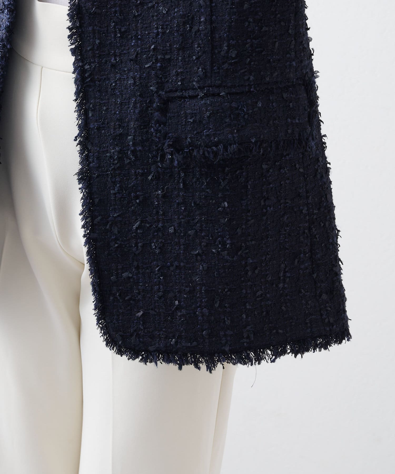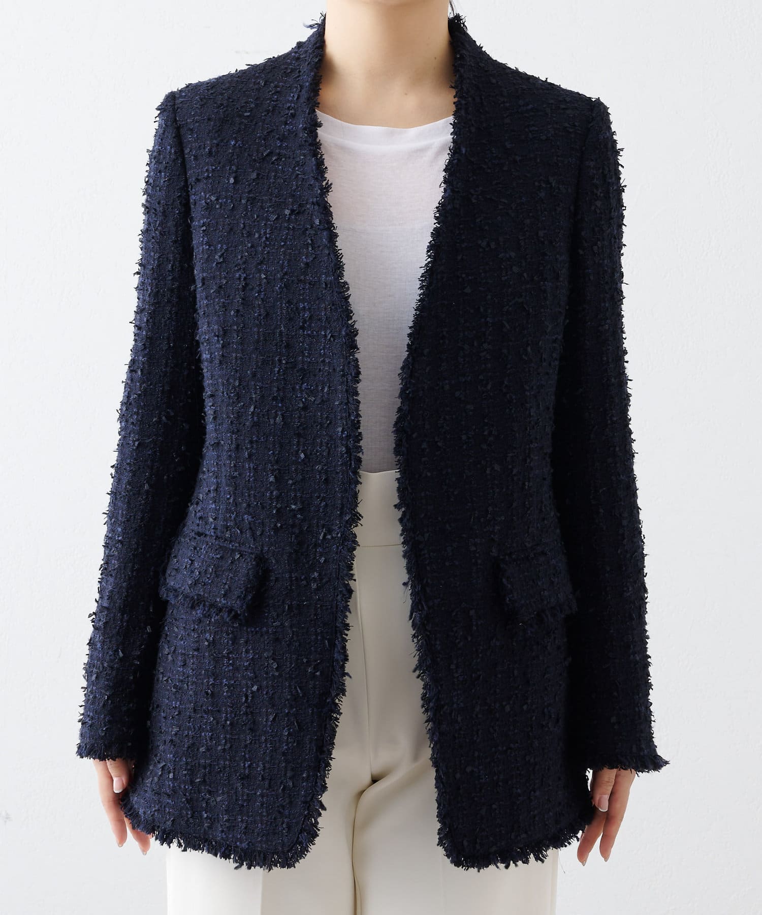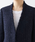 ■しっかりとした表情感のあるツイードが華やかなノーカラージャケット。