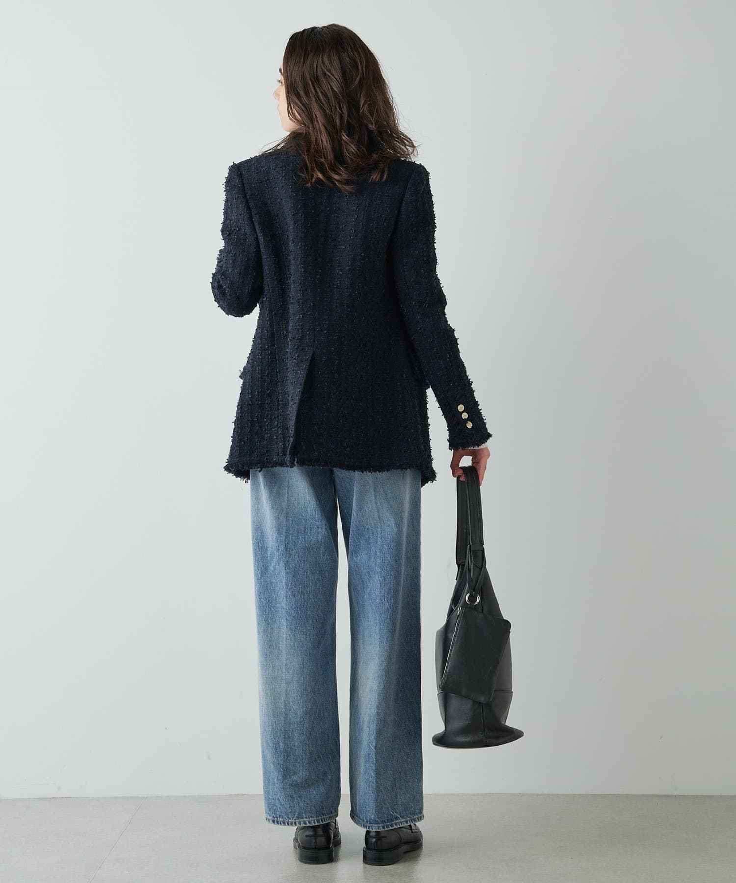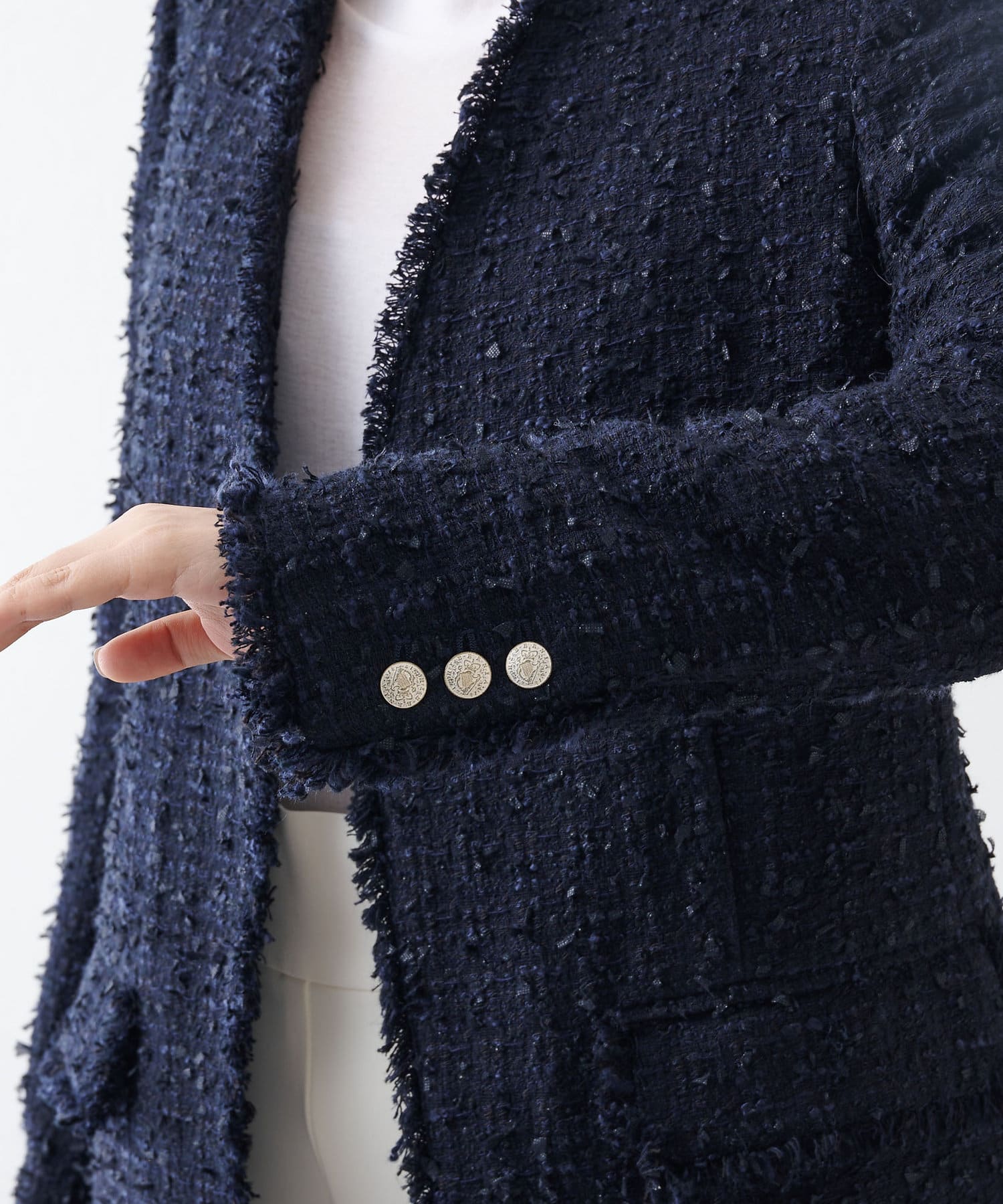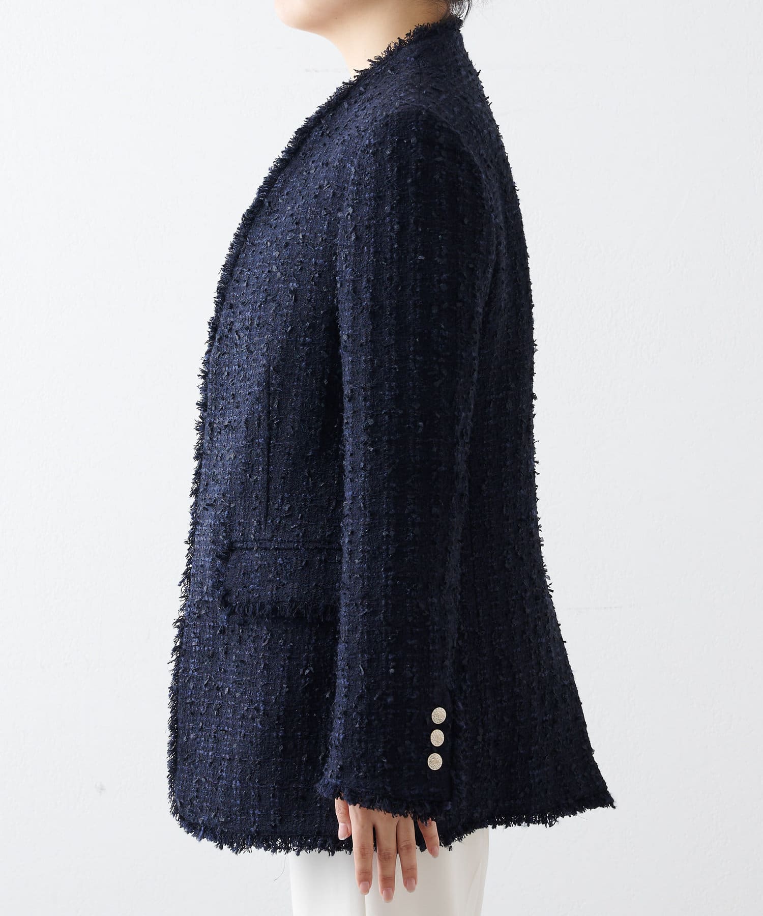 ■しっかりとした表情感のあるツイードが華やかなノーカラージャケット。