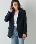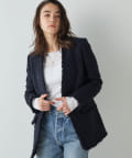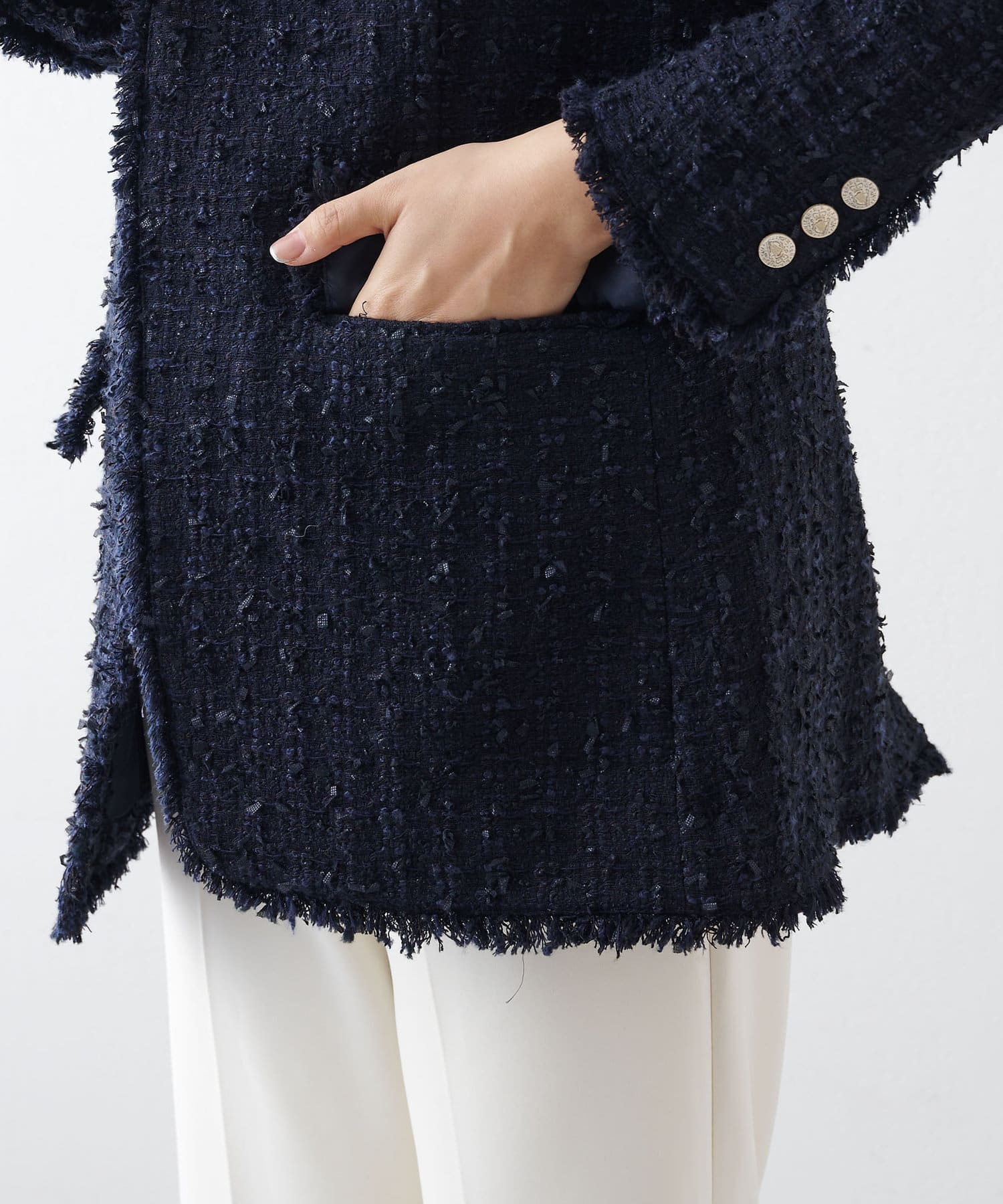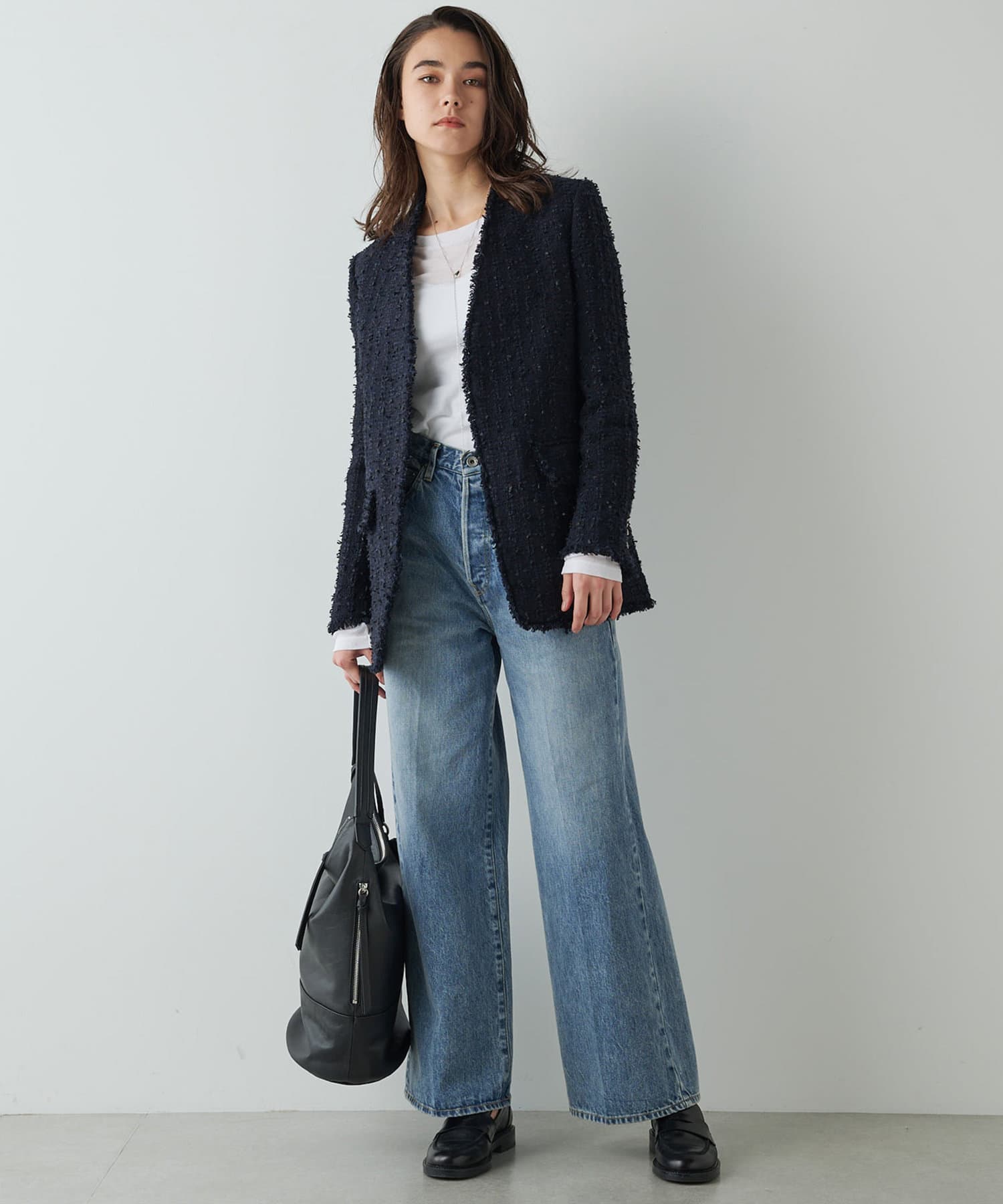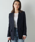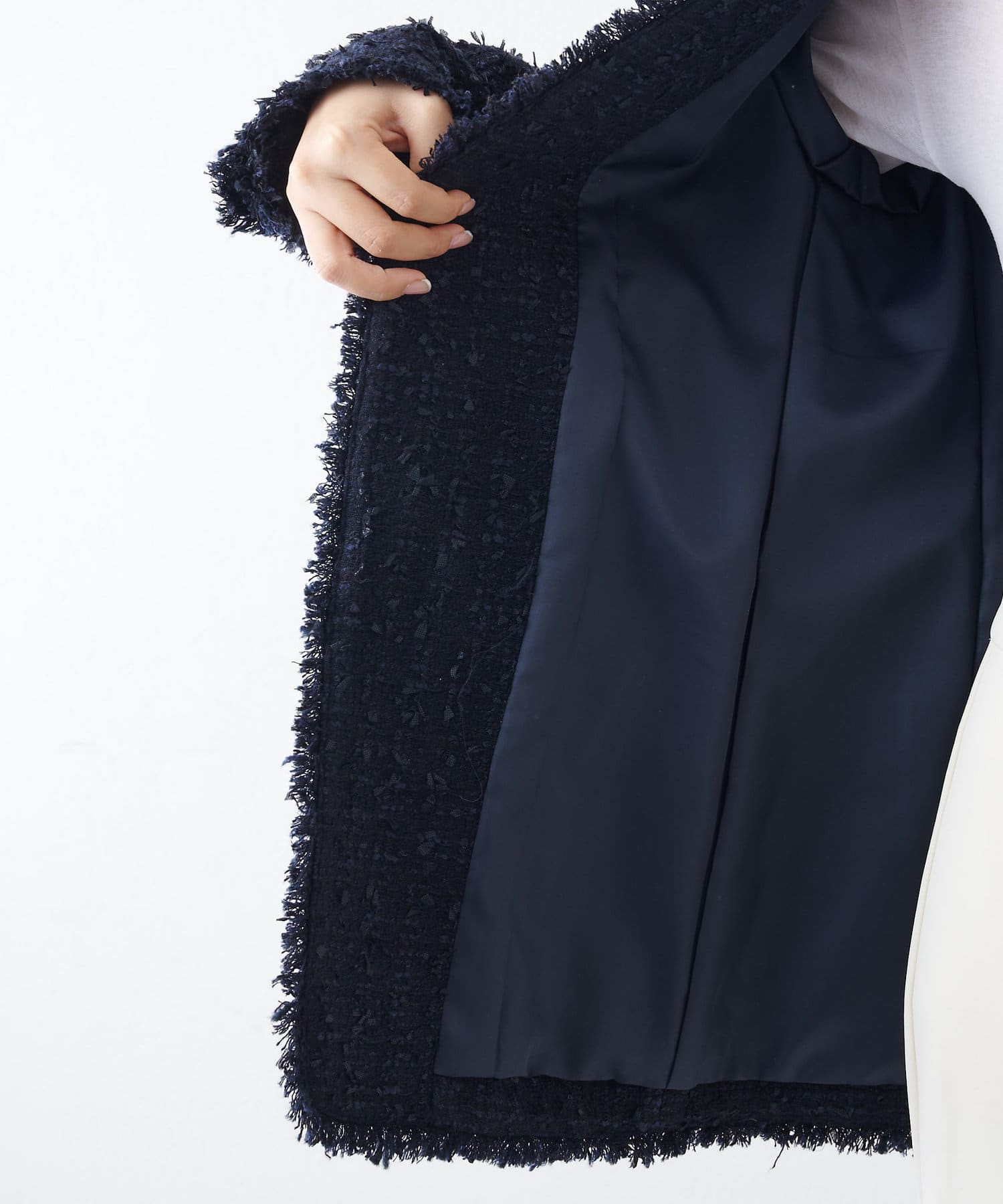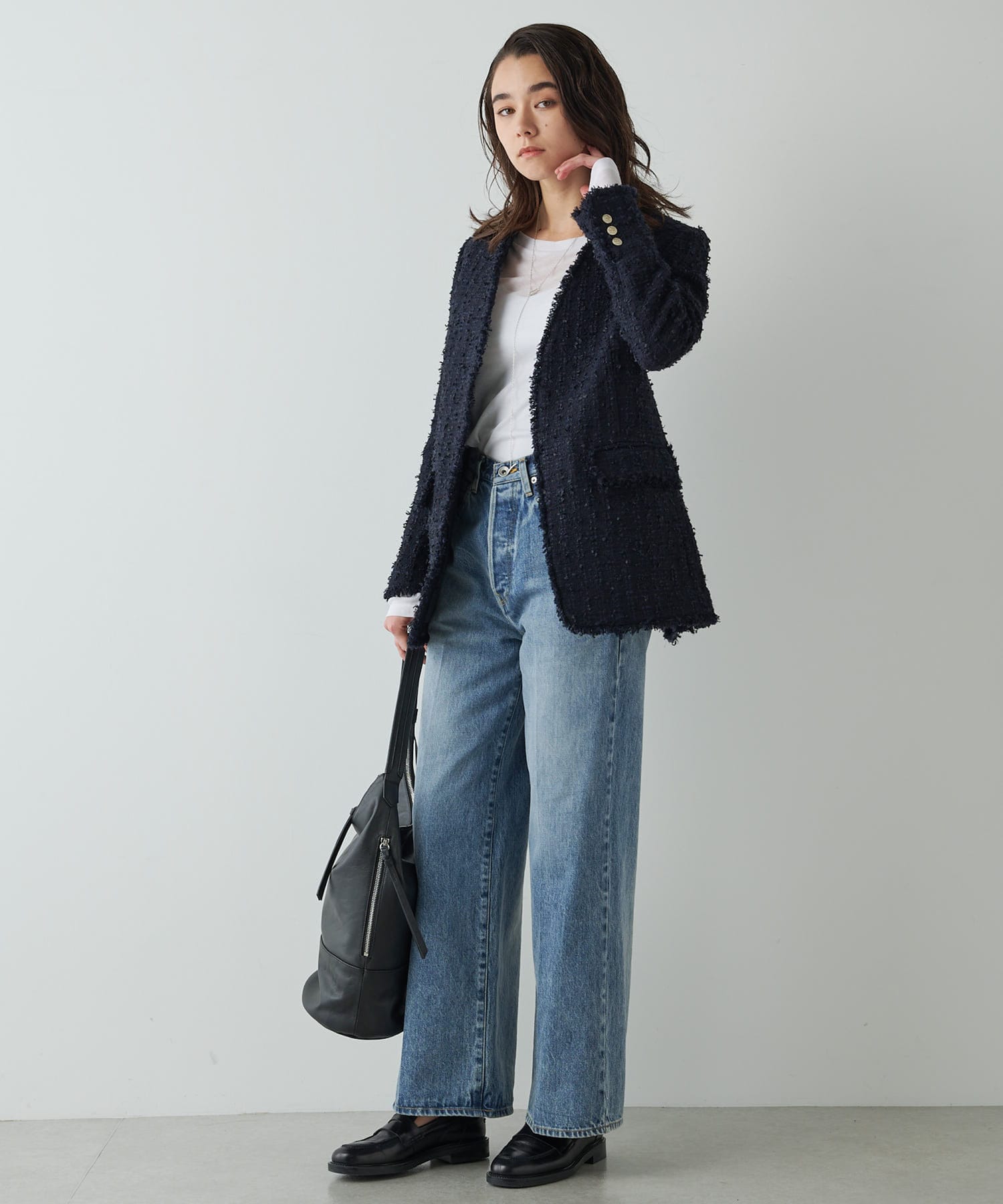 ■しっかりとした表情感のあるツイードが華やかなノーカラージャケット。