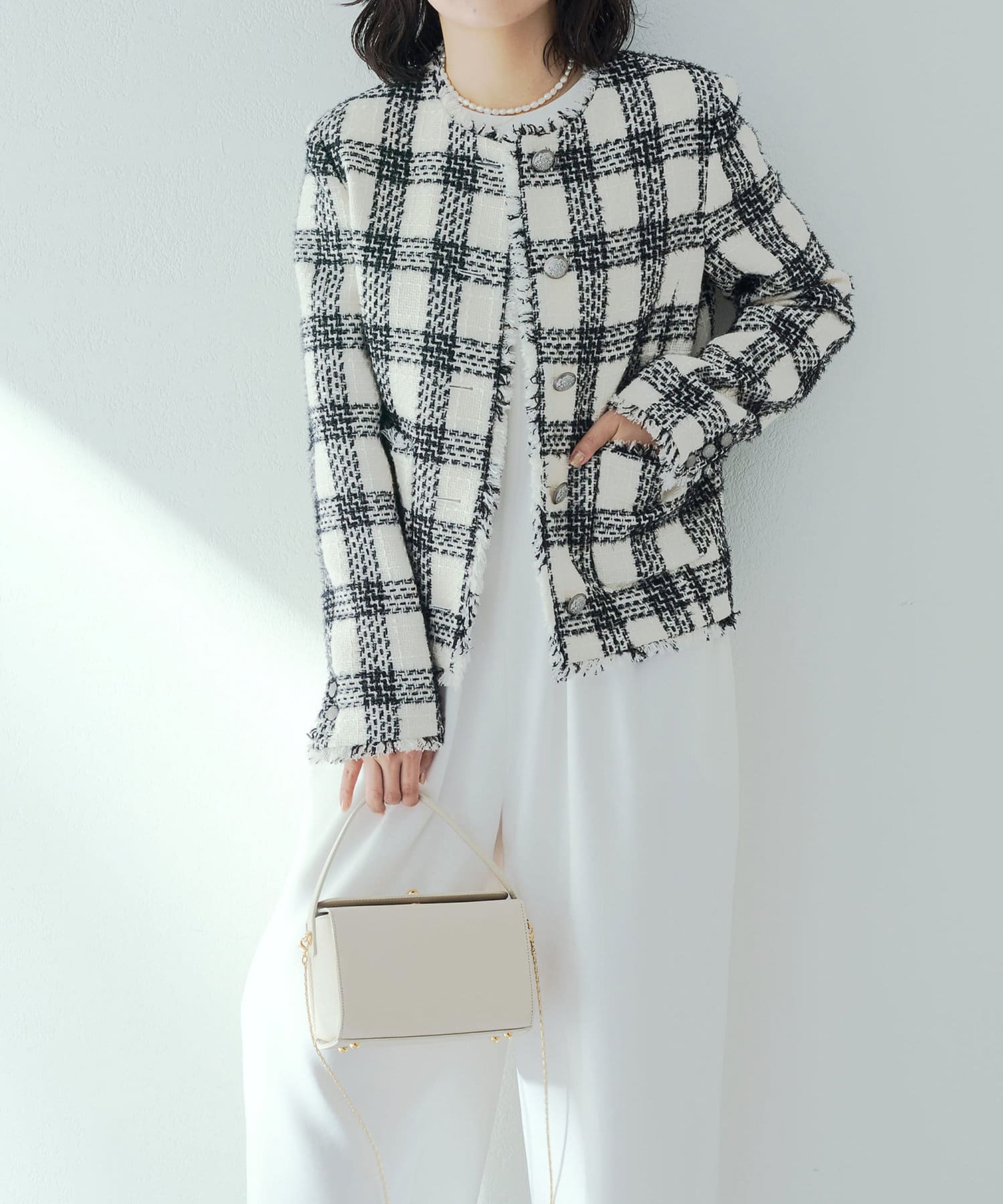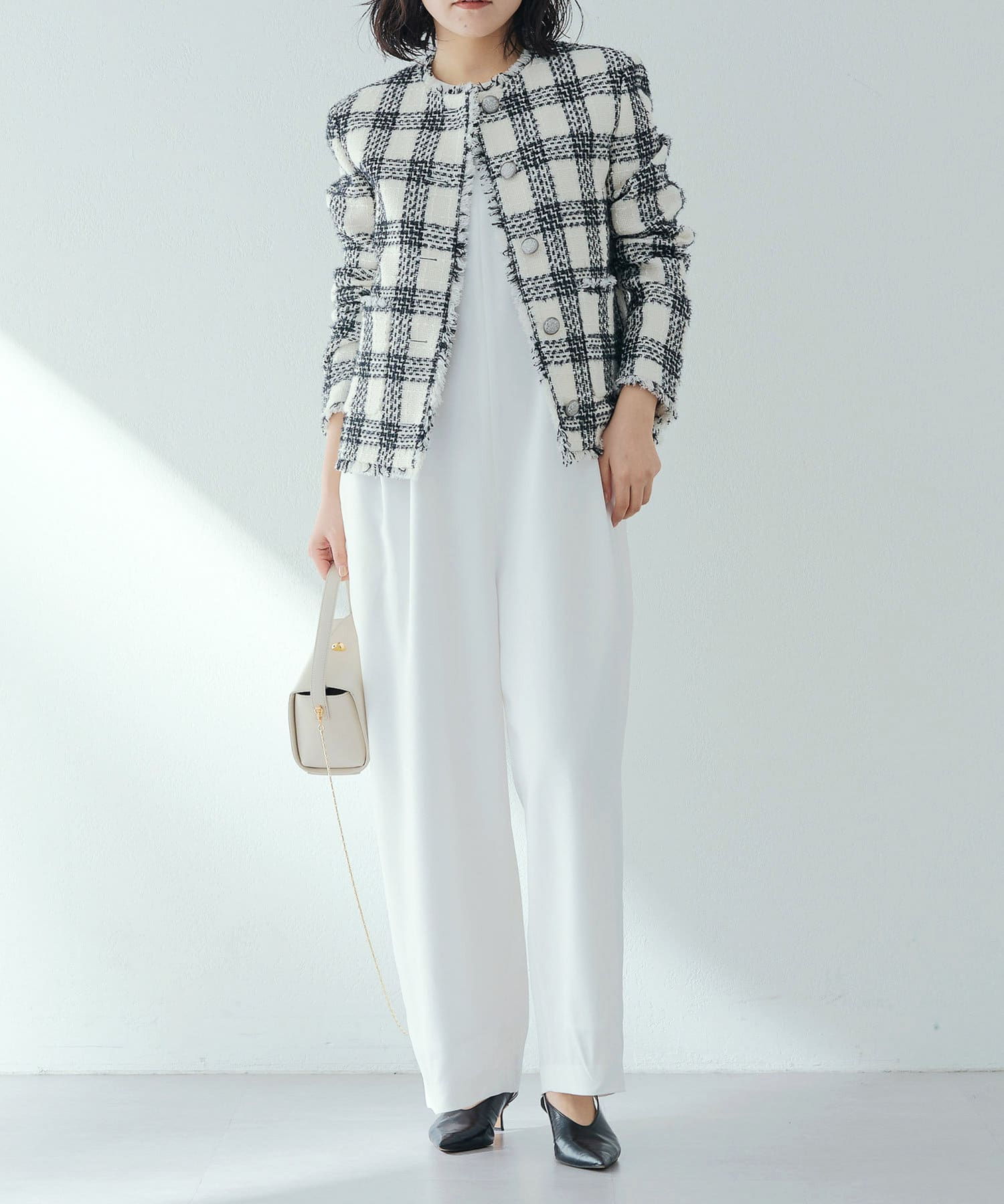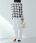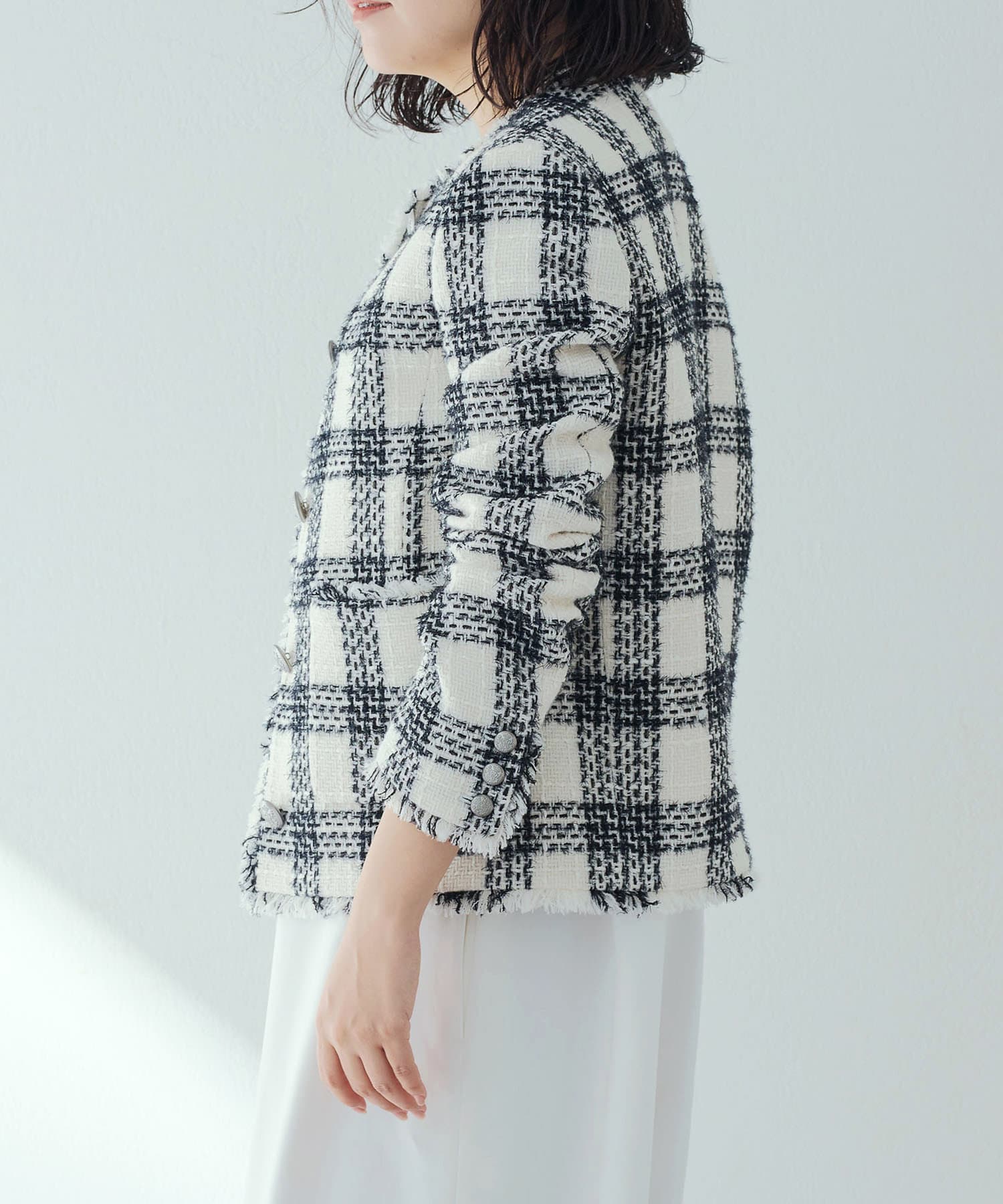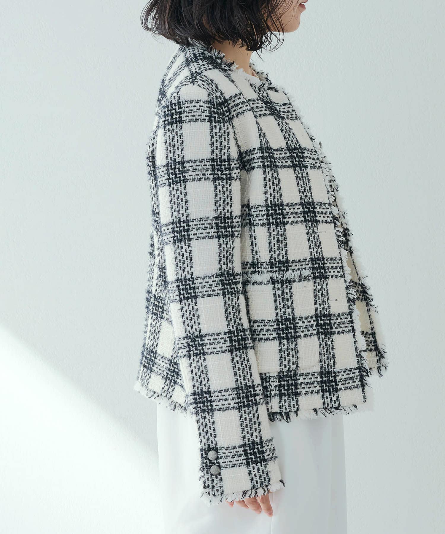 様々なシーンで活躍するツイードジャケット。大人の上品さを醸し出す、モノトーンカラーが素敵です。ノーカラーで顔まわりはすっきりと見えます。見た目より軽く着心地も楽でした。