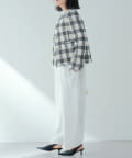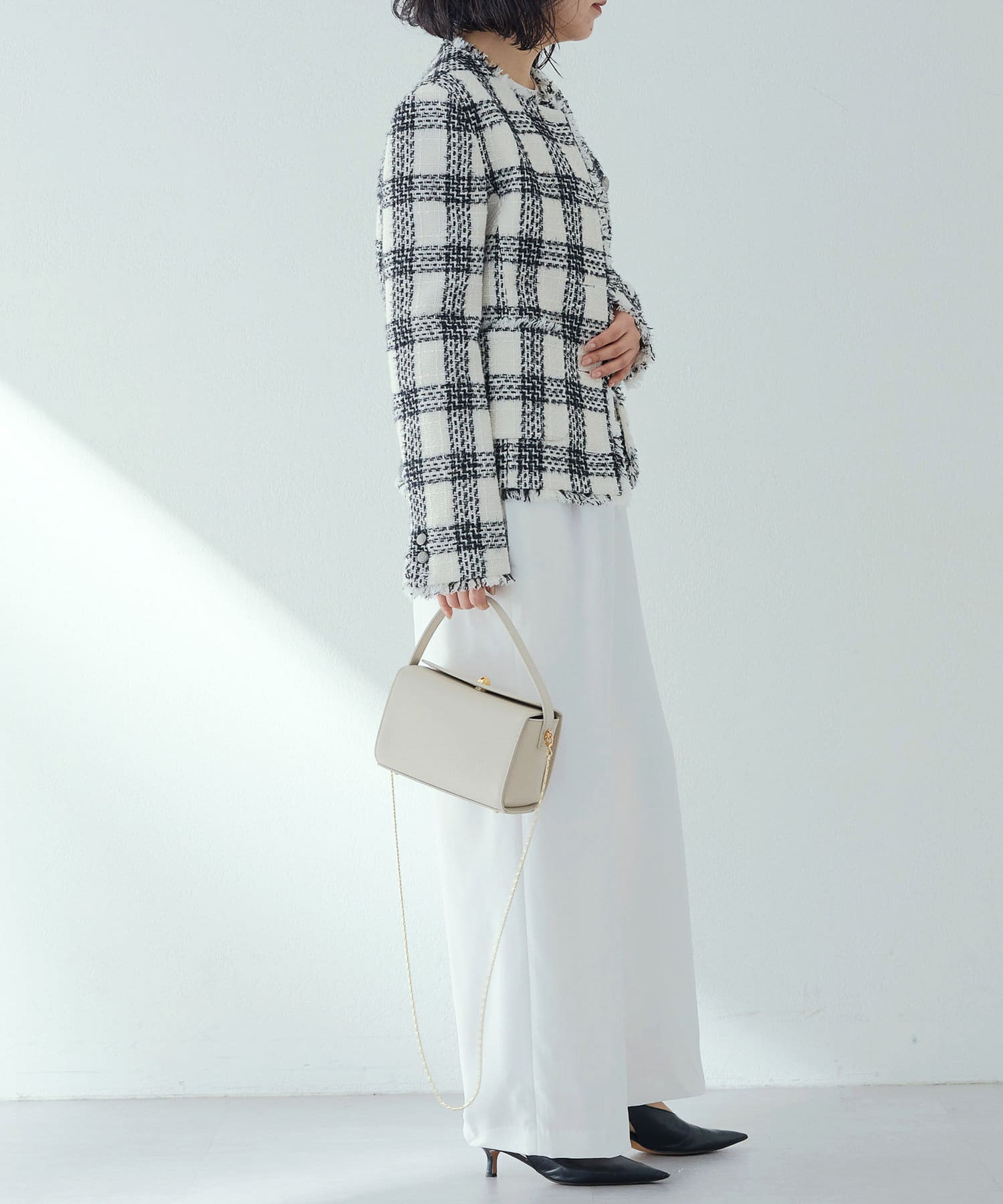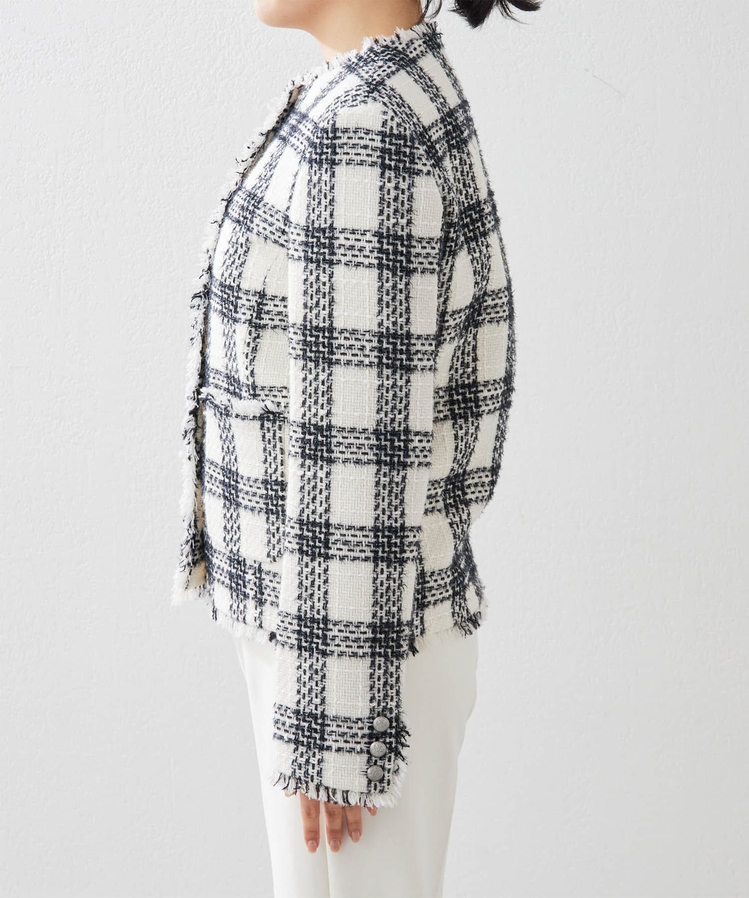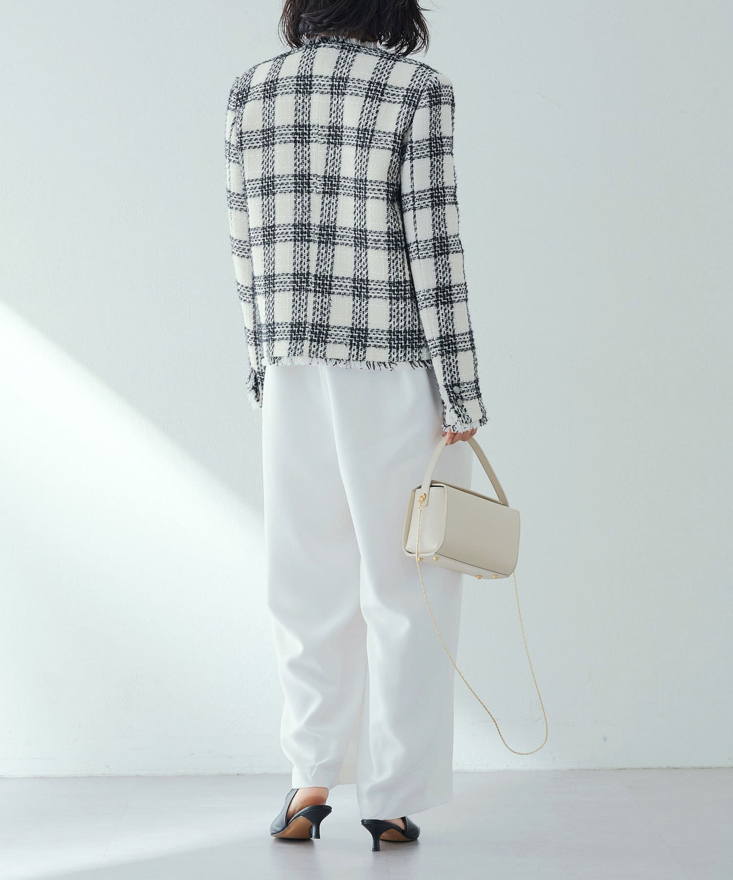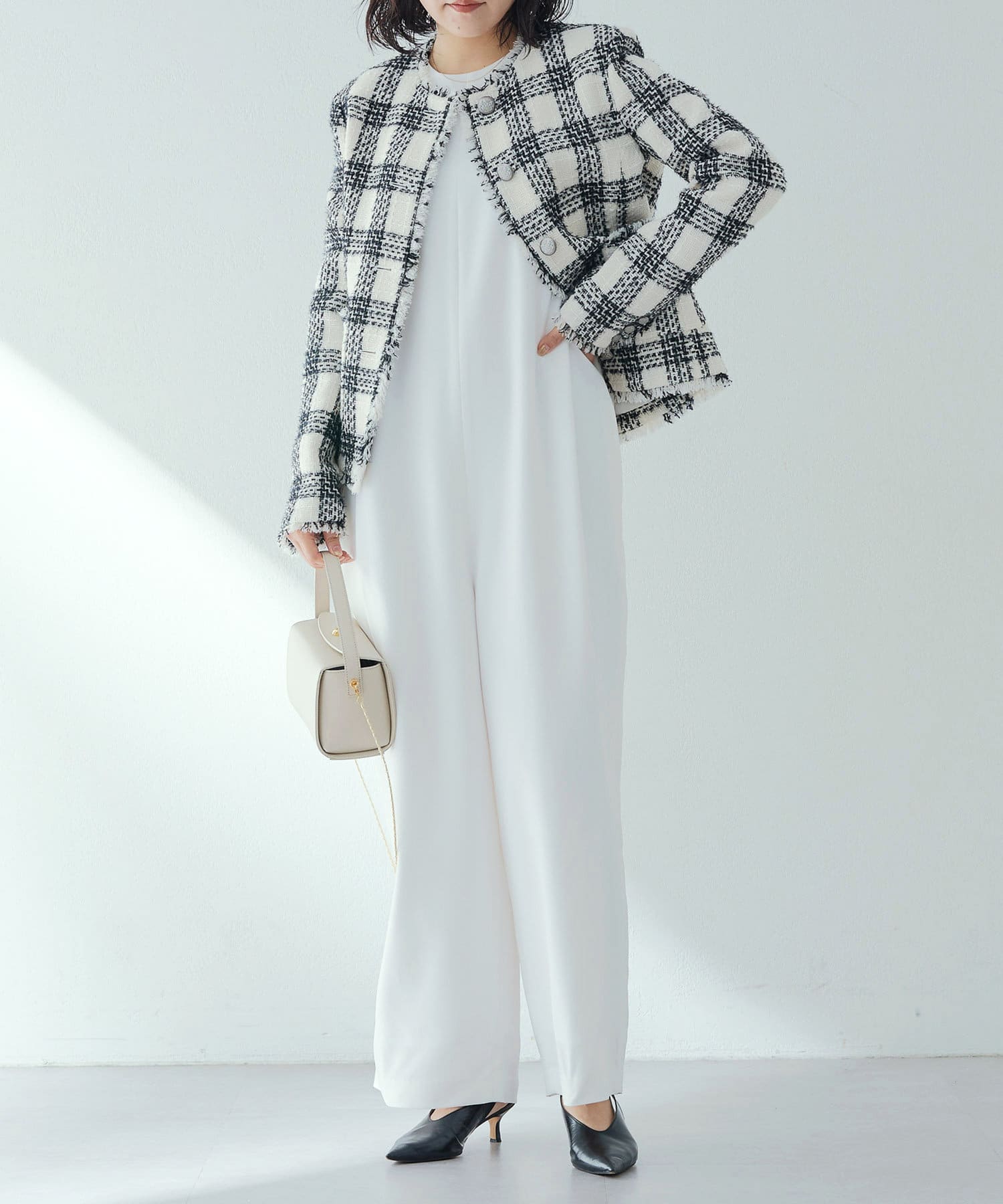 様々なシーンで活躍するツイードジャケット。大人の上品さを醸し出す、モノトーンカラーが素敵です。ノーカラーで顔まわりはすっきりと見えます。見た目より軽く着心地も楽でした。