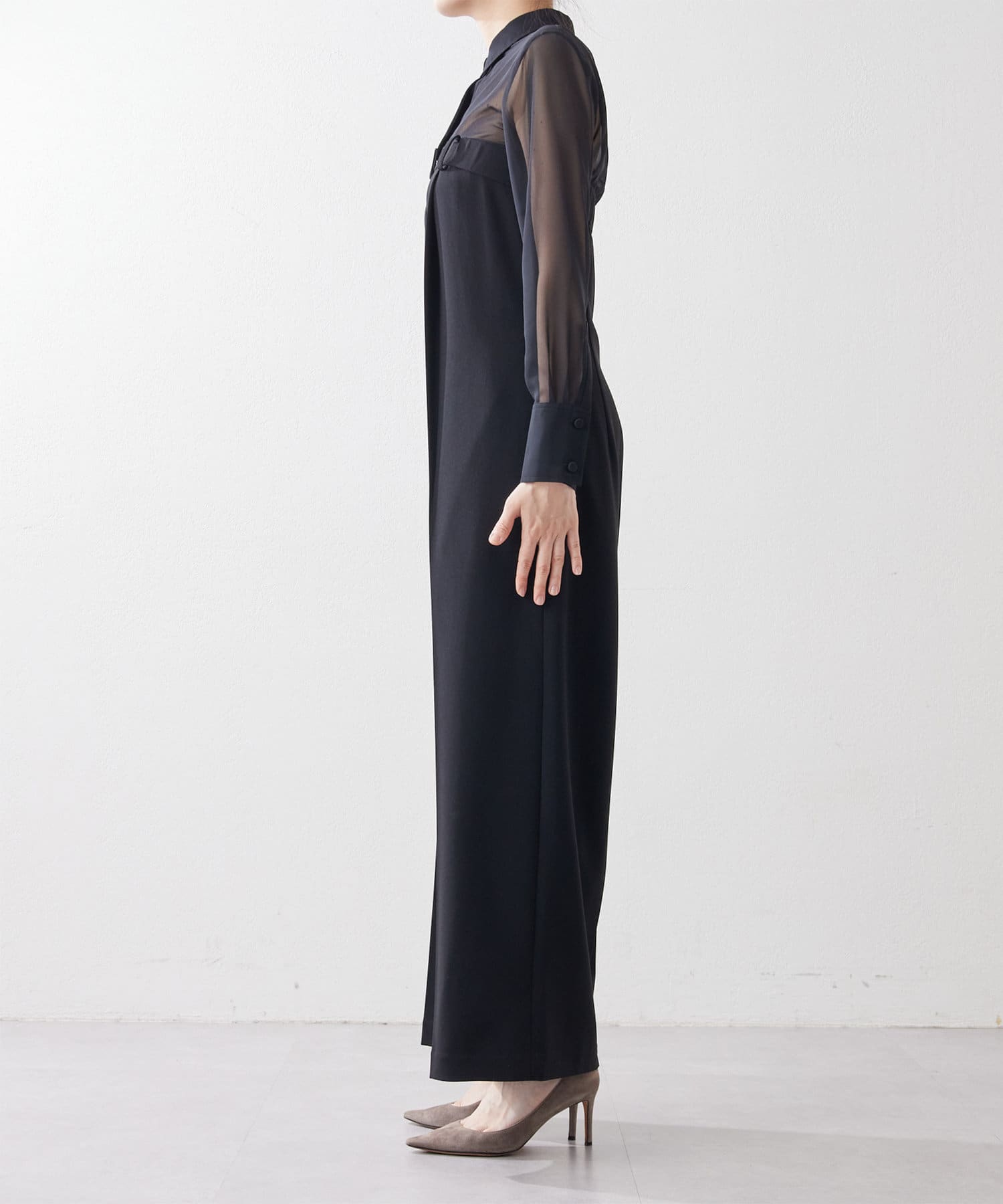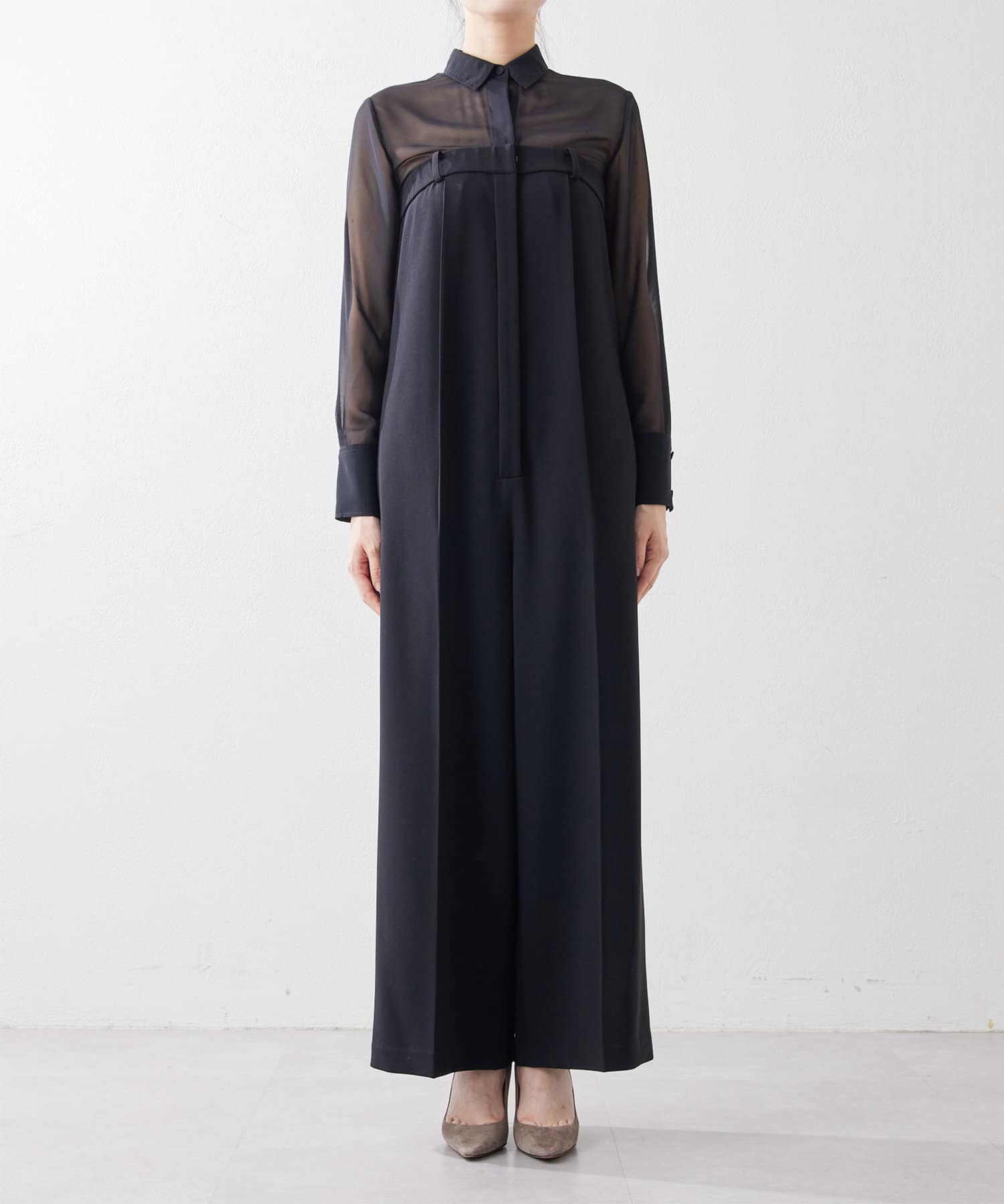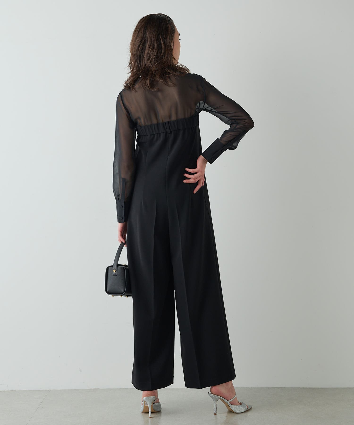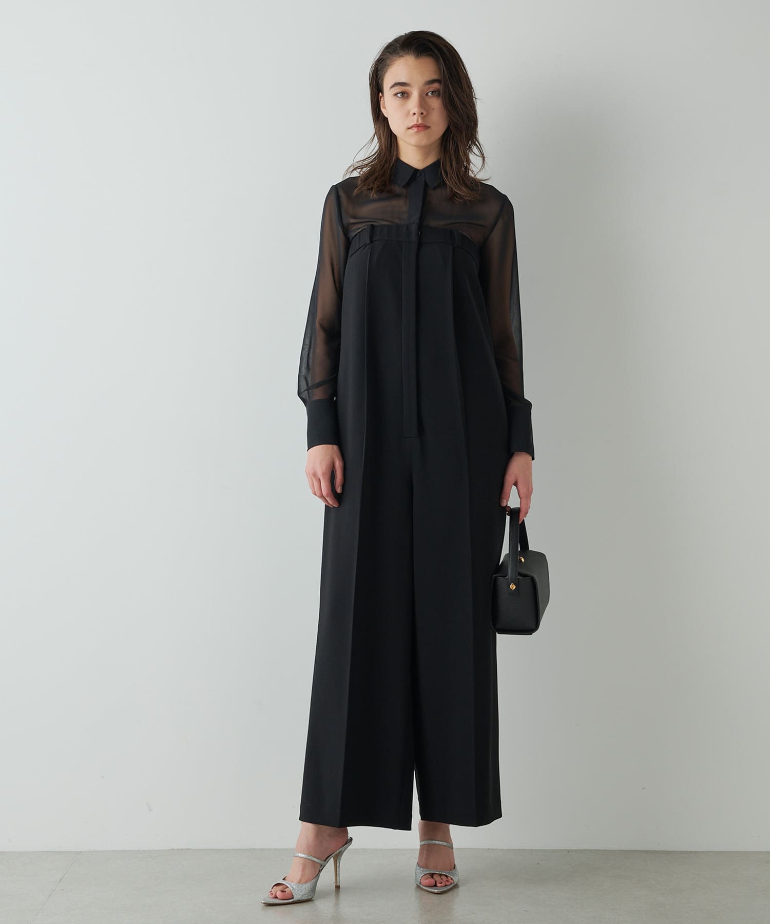 ■ベアトップのコンビネゾンにシアーシャツをレイヤードしたようなデザインのオールインワン。