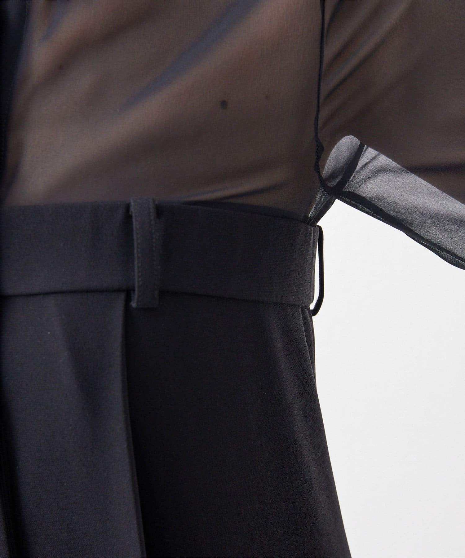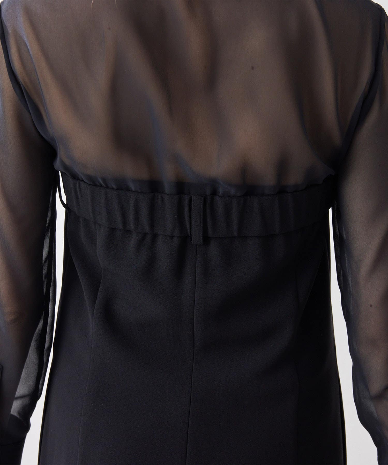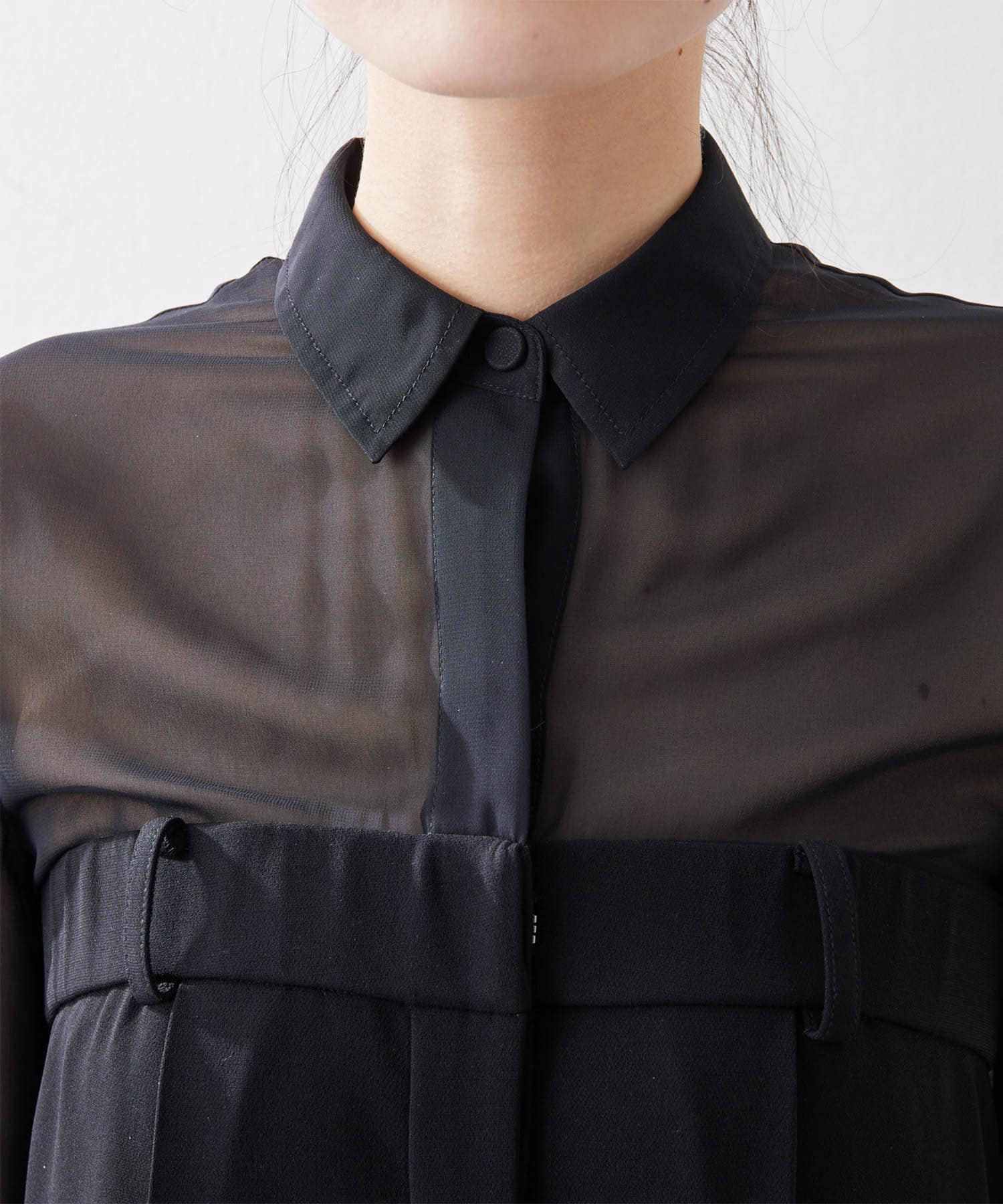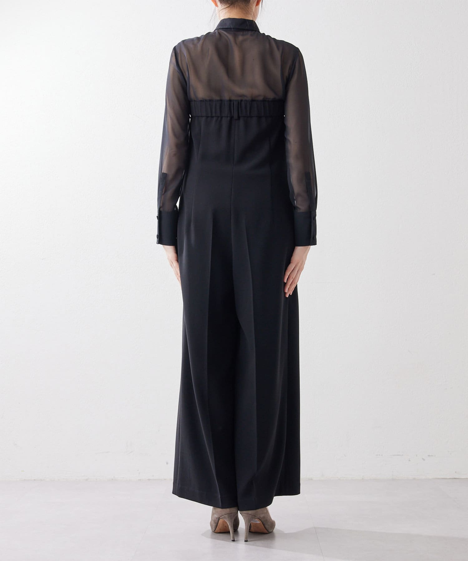 ■ベアトップのコンビネゾンにシアーシャツをレイヤードしたようなデザインのオールインワン。