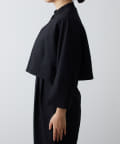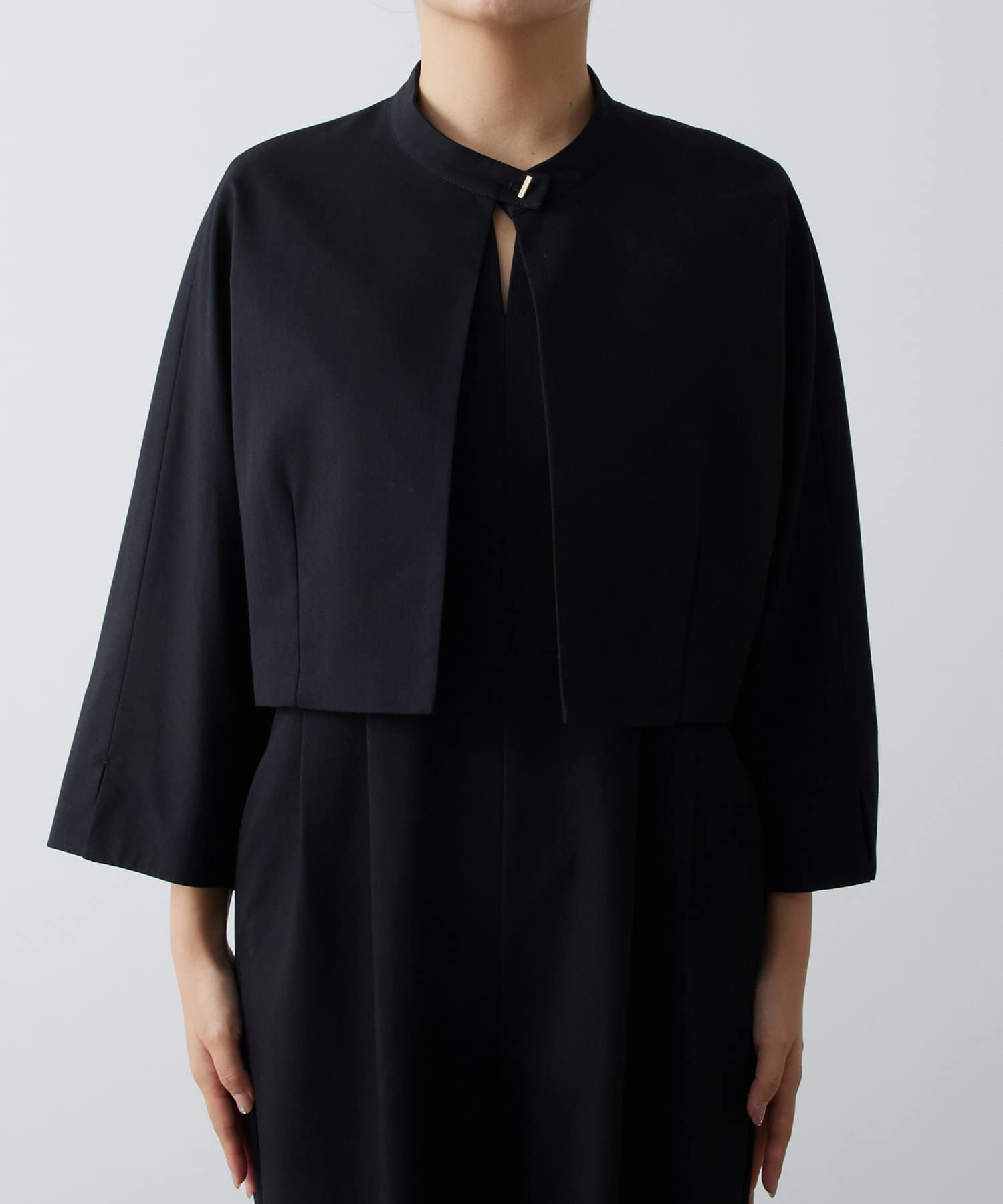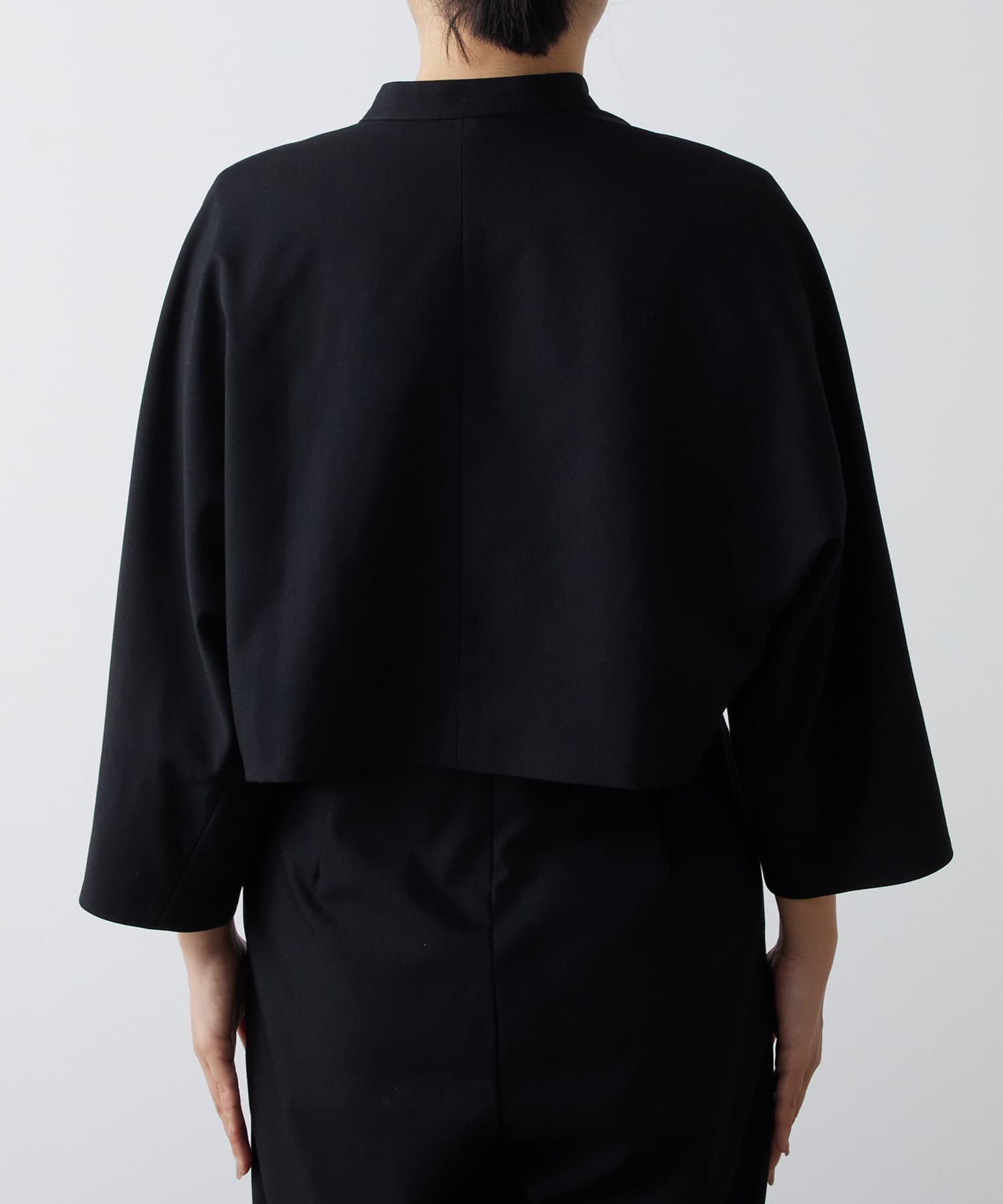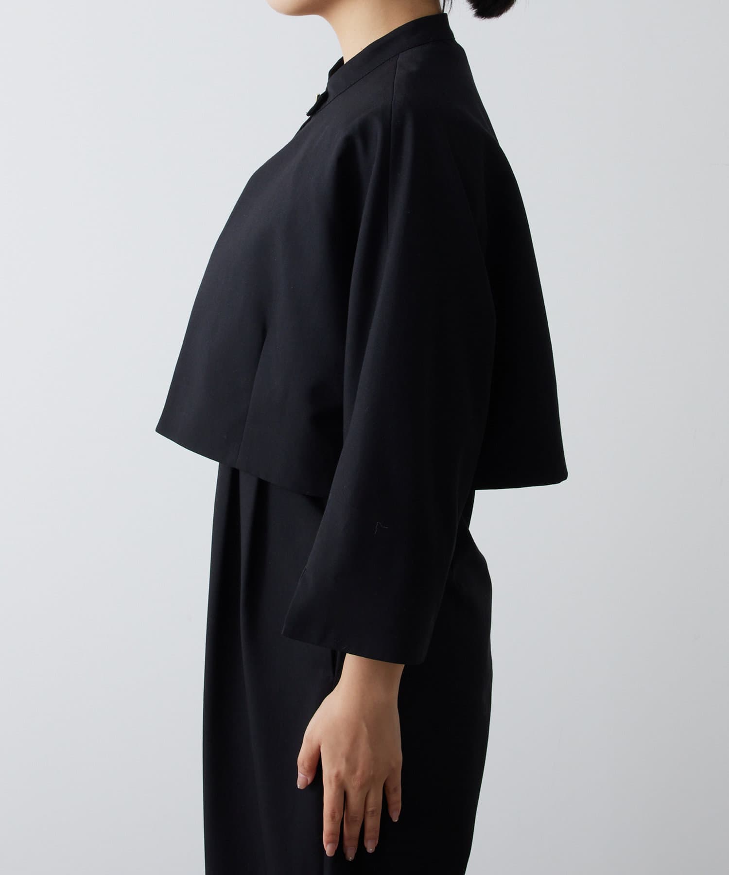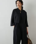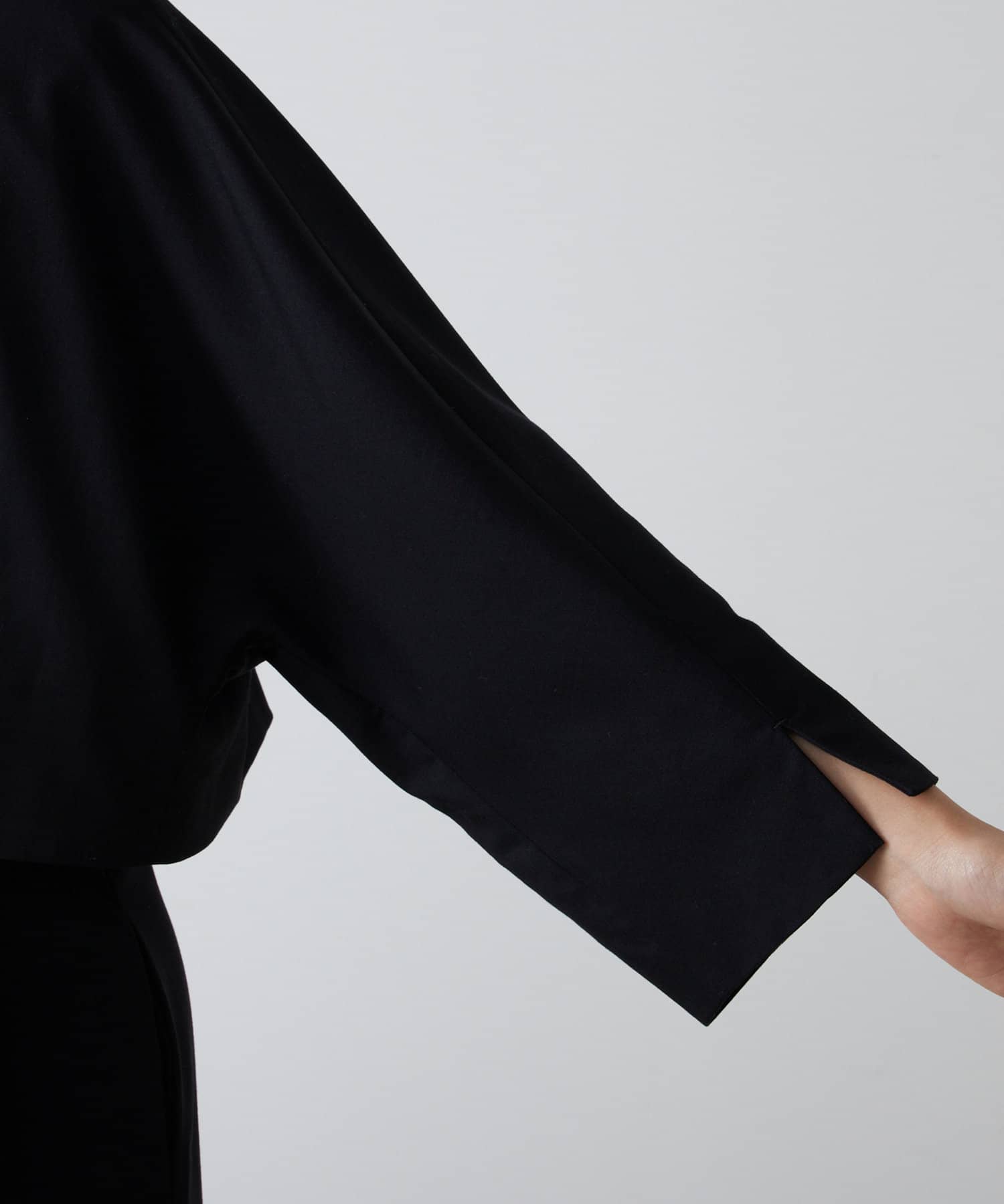 ■トレンドの短丈のスタンドジャケットは、ゆとりのあるドルマンスリーブが女性らしい印象。