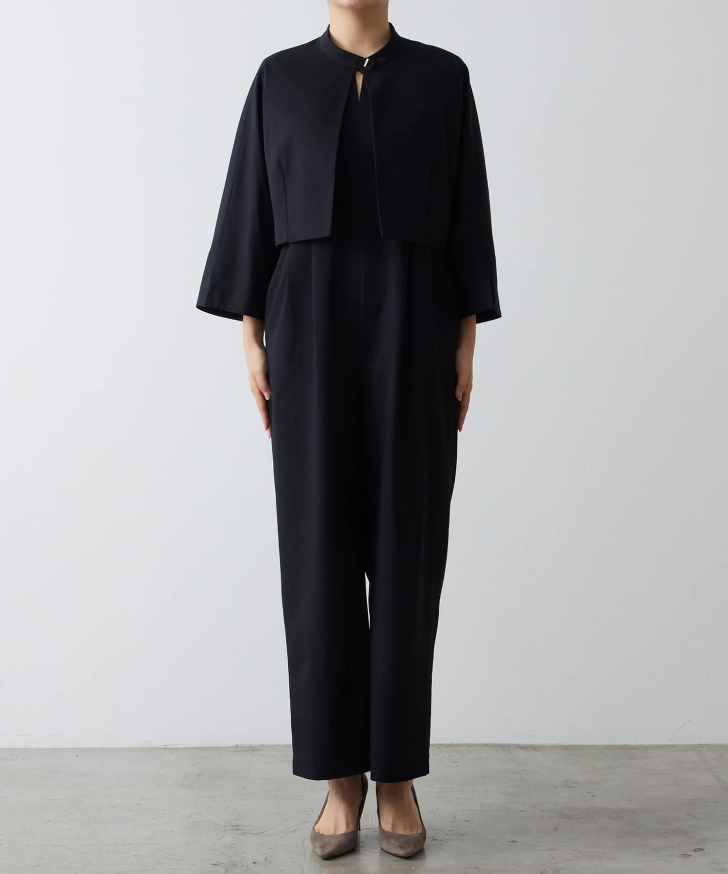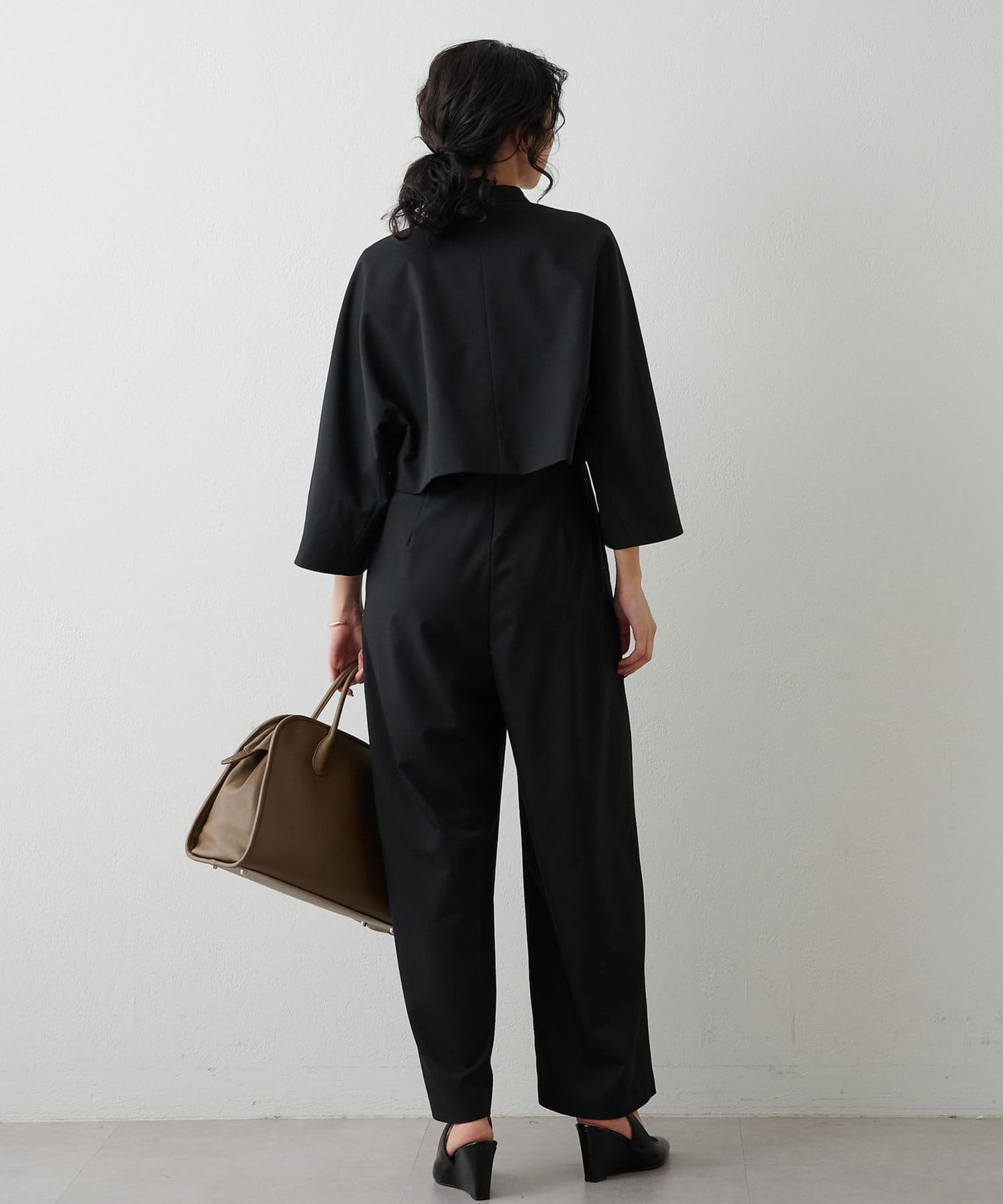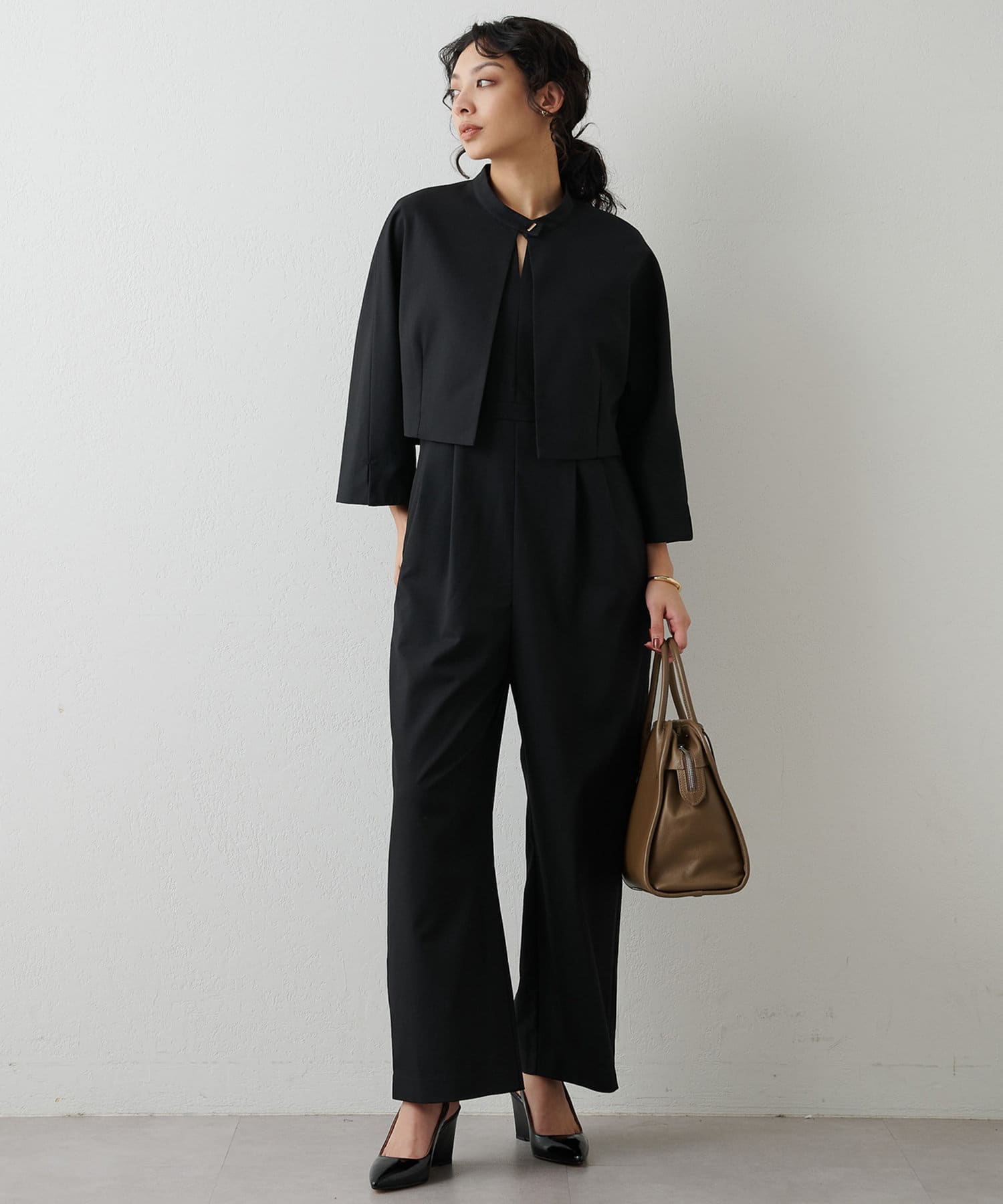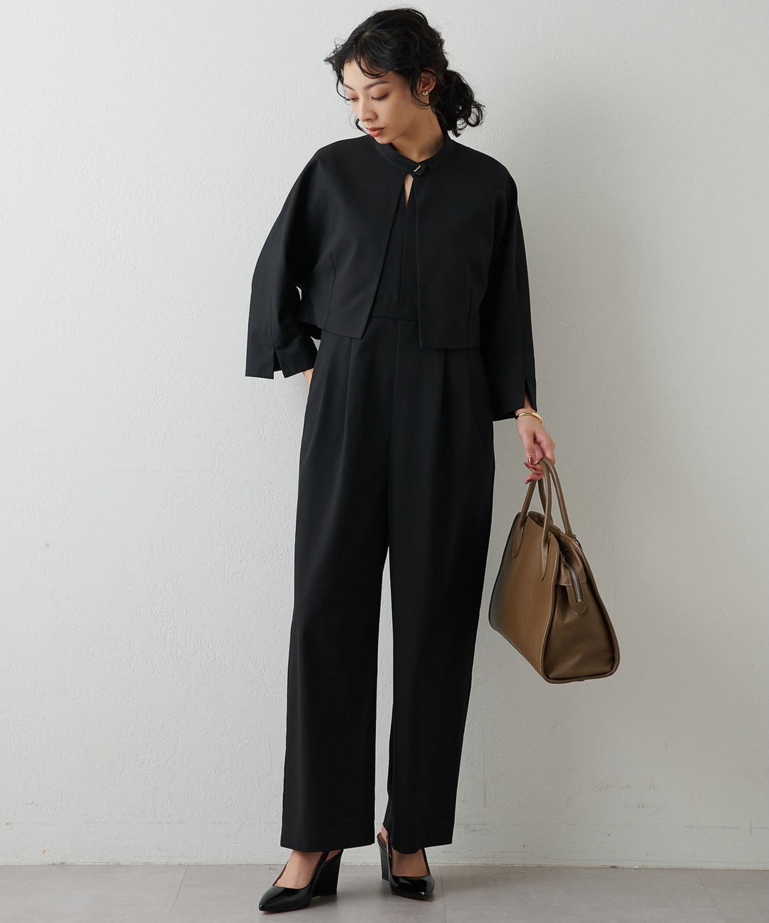 ジャケットは袖の長さとスリットが抜け感を出してくれます。オールインワンの方はウエストがくびれて見え、脚長効果を感じられるシルエット。個人的には襟が丸いデザインのためブラックでも柔らかい印象になるところが好きです。