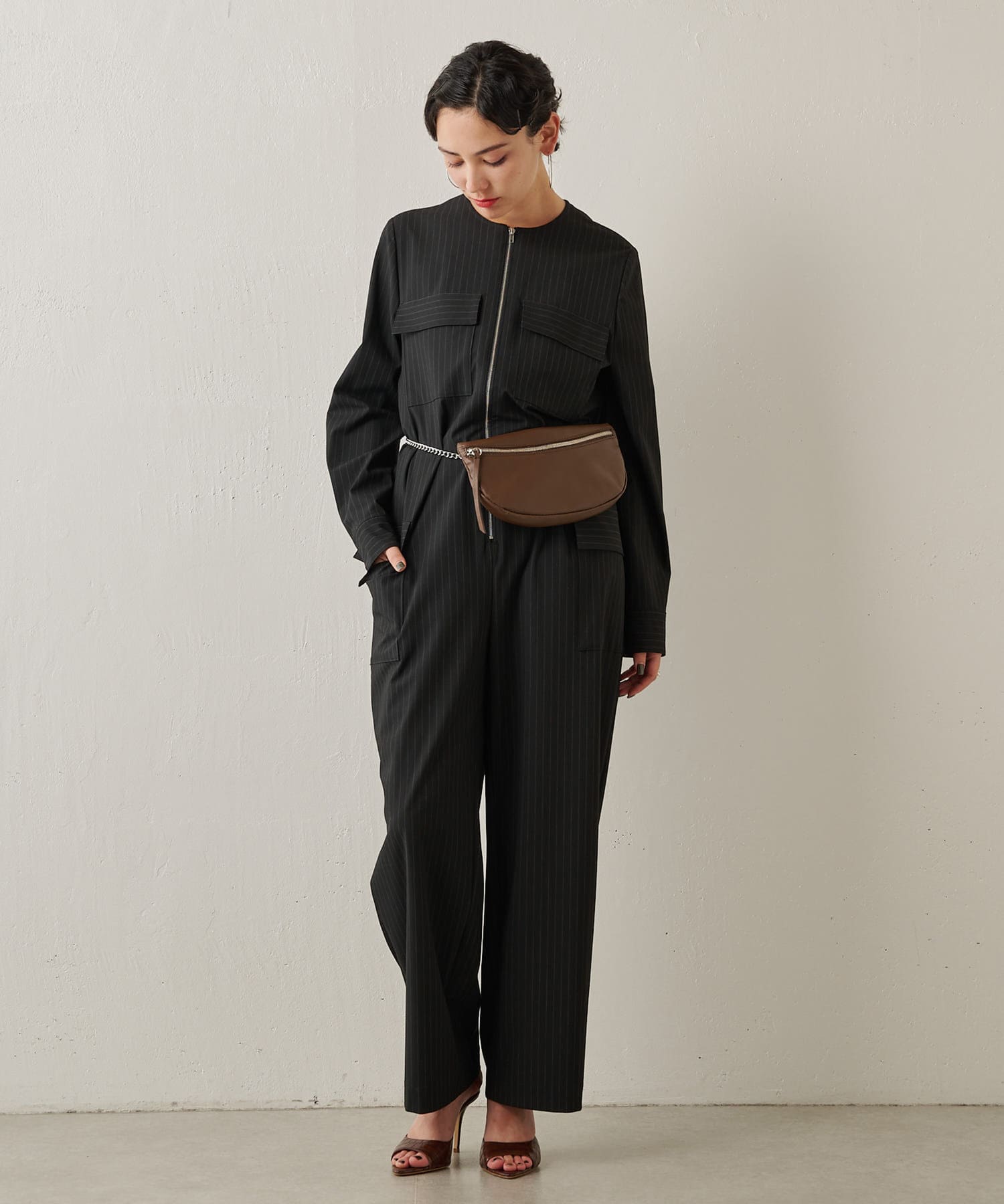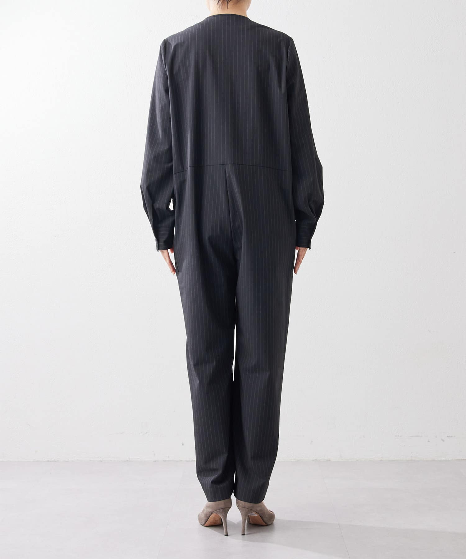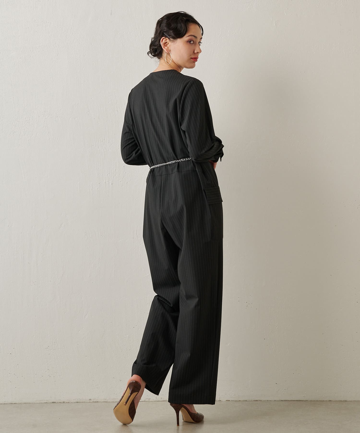 ■ピンストライプでハンサムな雰囲気に仕上げたジャンプスーツ。