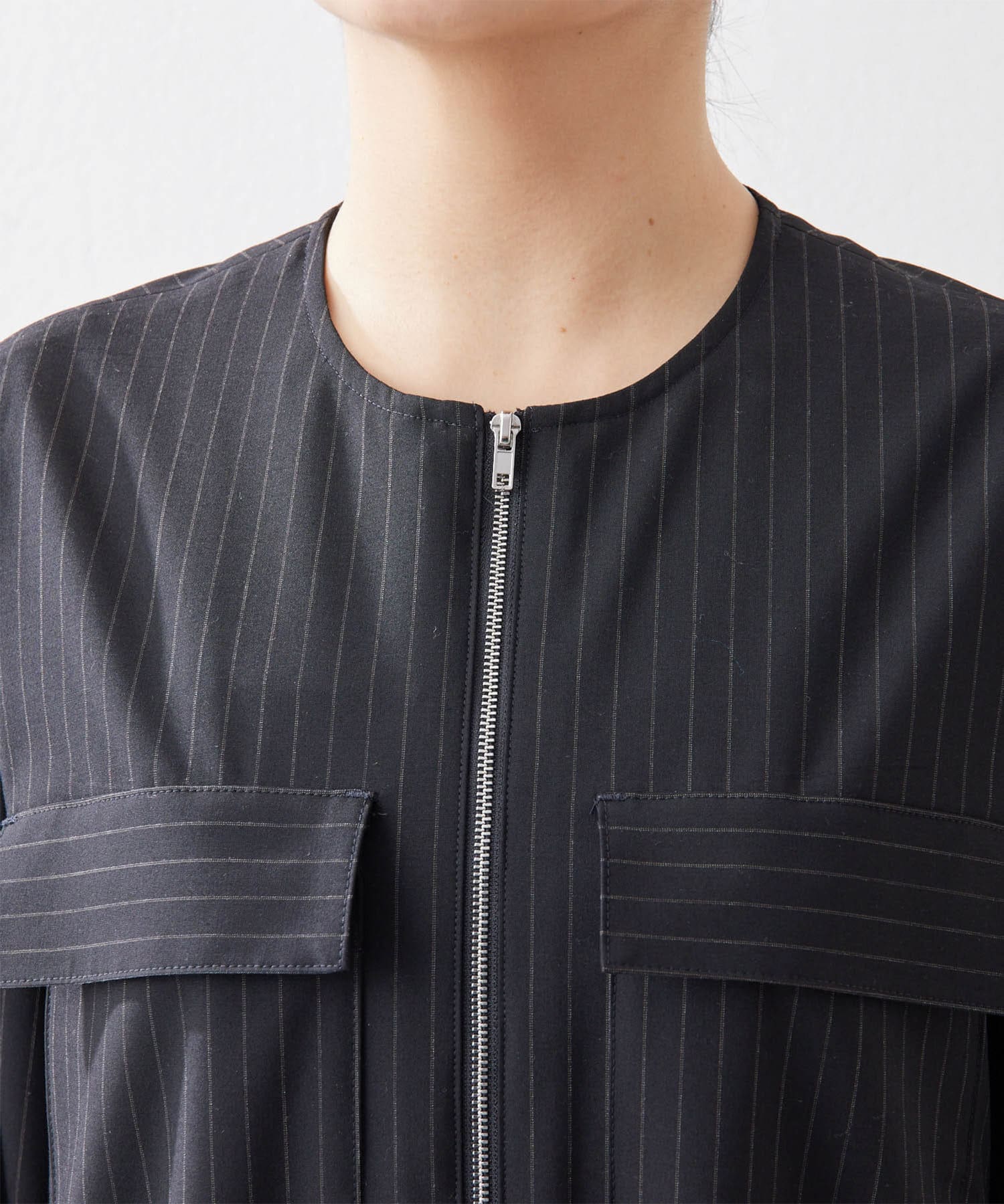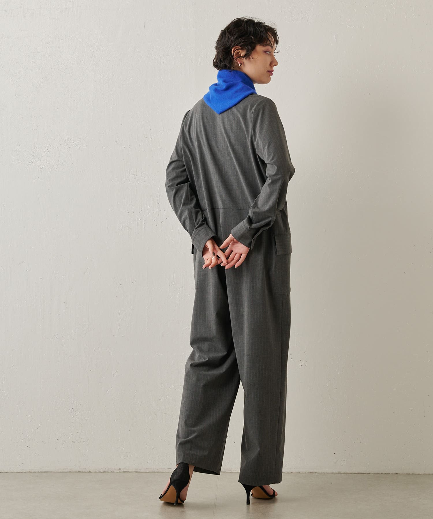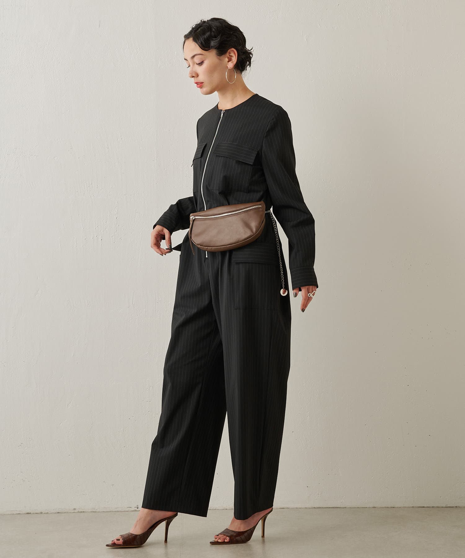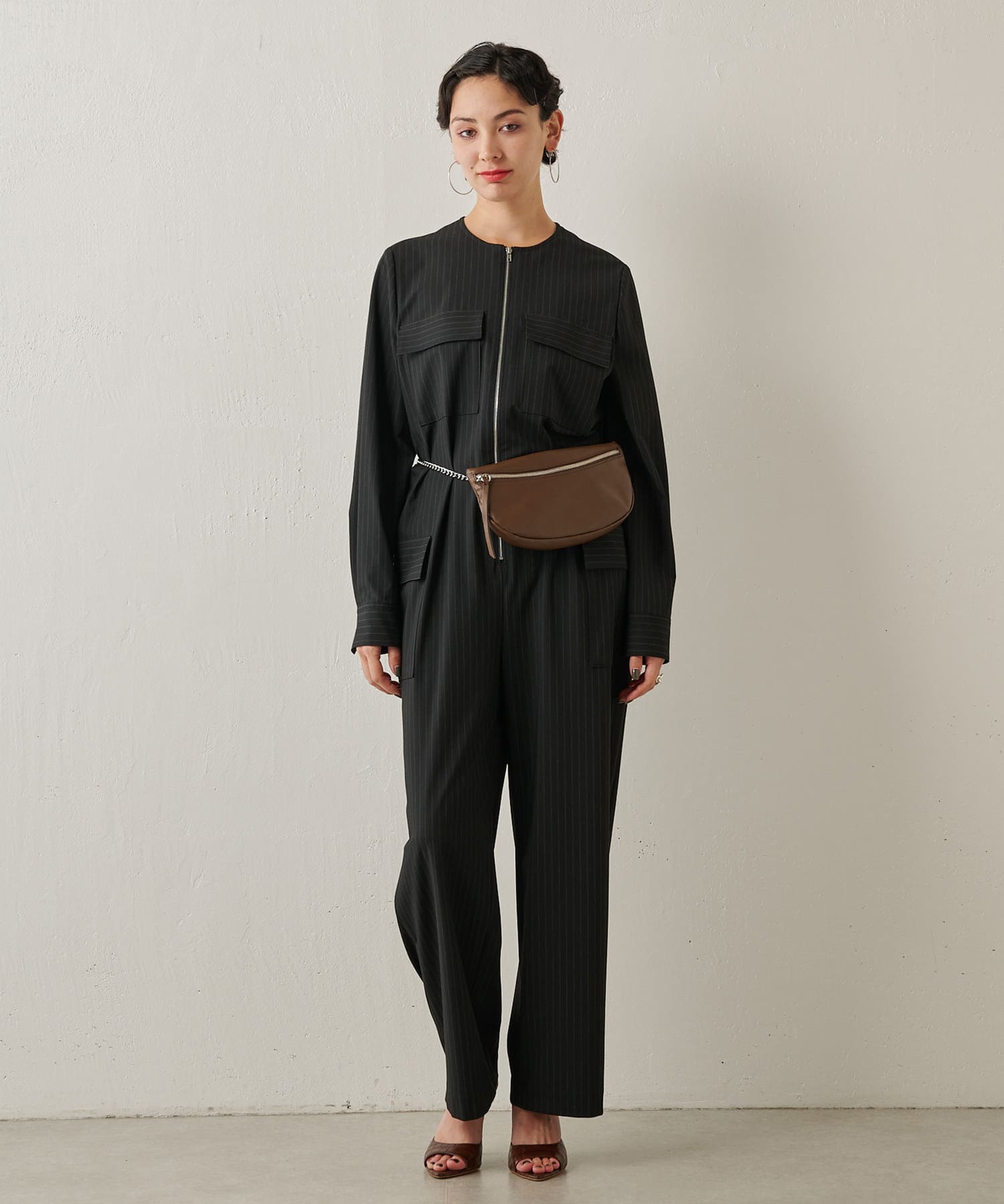 ■ピンストライプでハンサムな雰囲気に仕上げたジャンプスーツ。