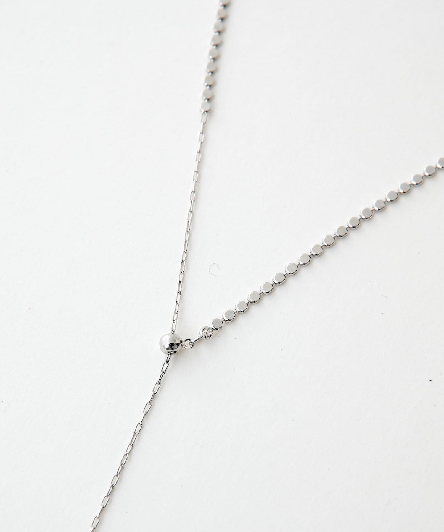 ■ドットチェーンと華奢なチェーンを組み合わせたラリエットネックレス。