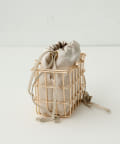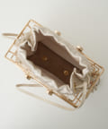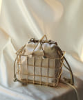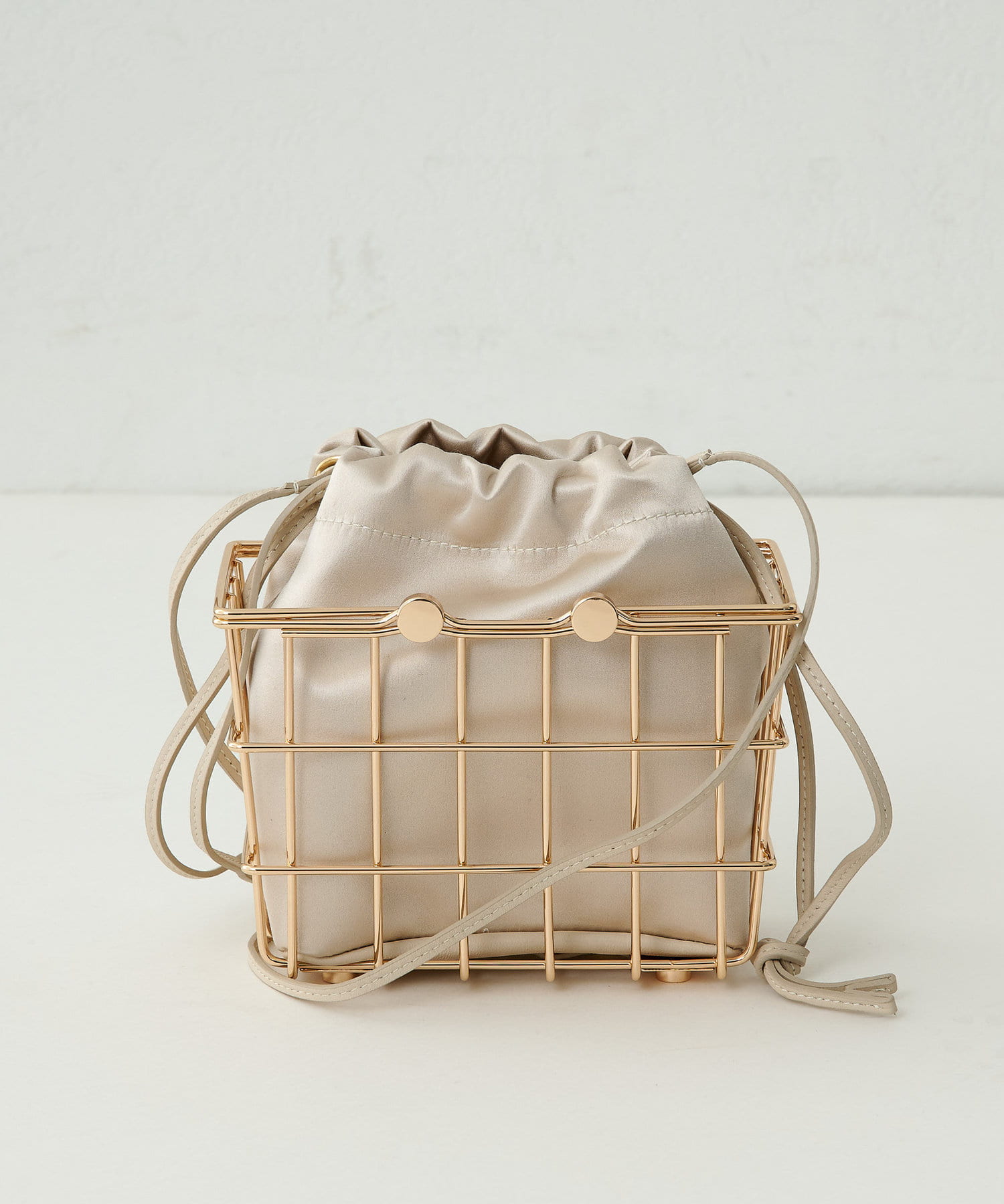 ■ゴールド金具のミニマーケットバッグに、サテン巾着をインバッグに組み合わせたモダンなシルエット。