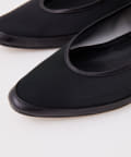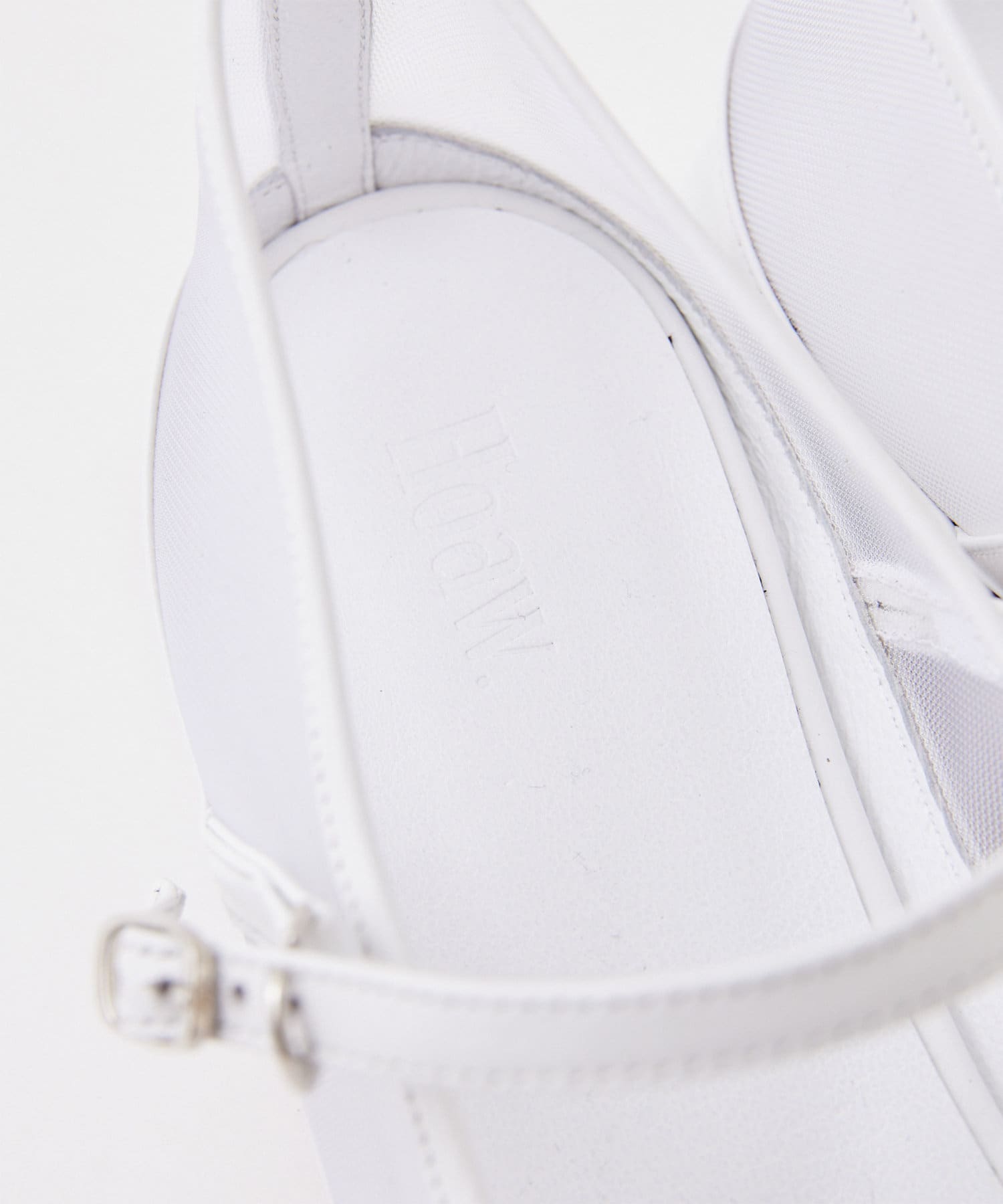 ■シアー素材とレザーのコンビネーションでモードな印象に仕上げた一足。