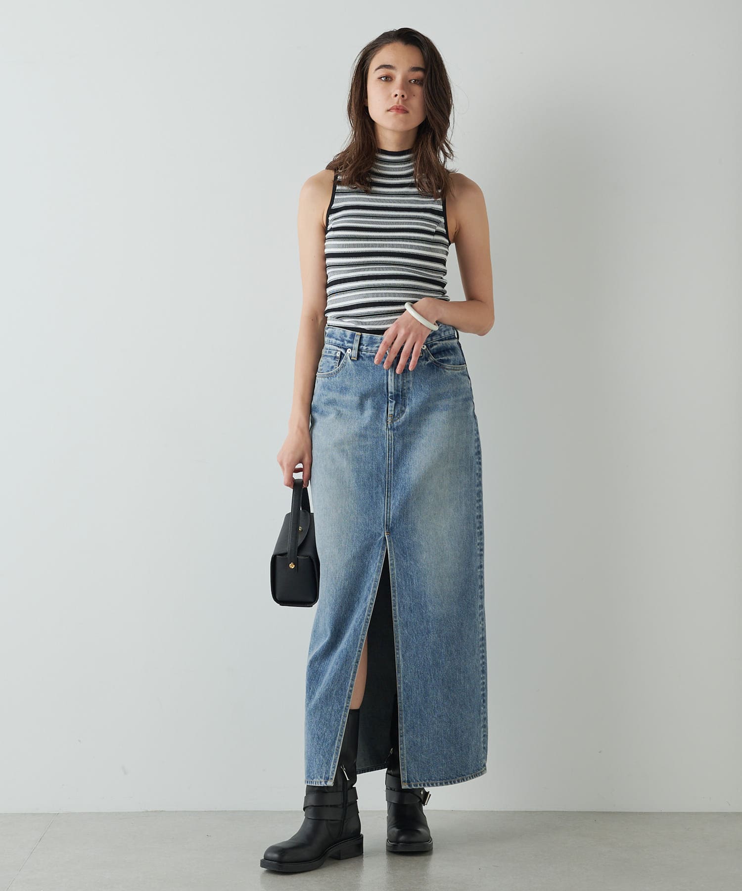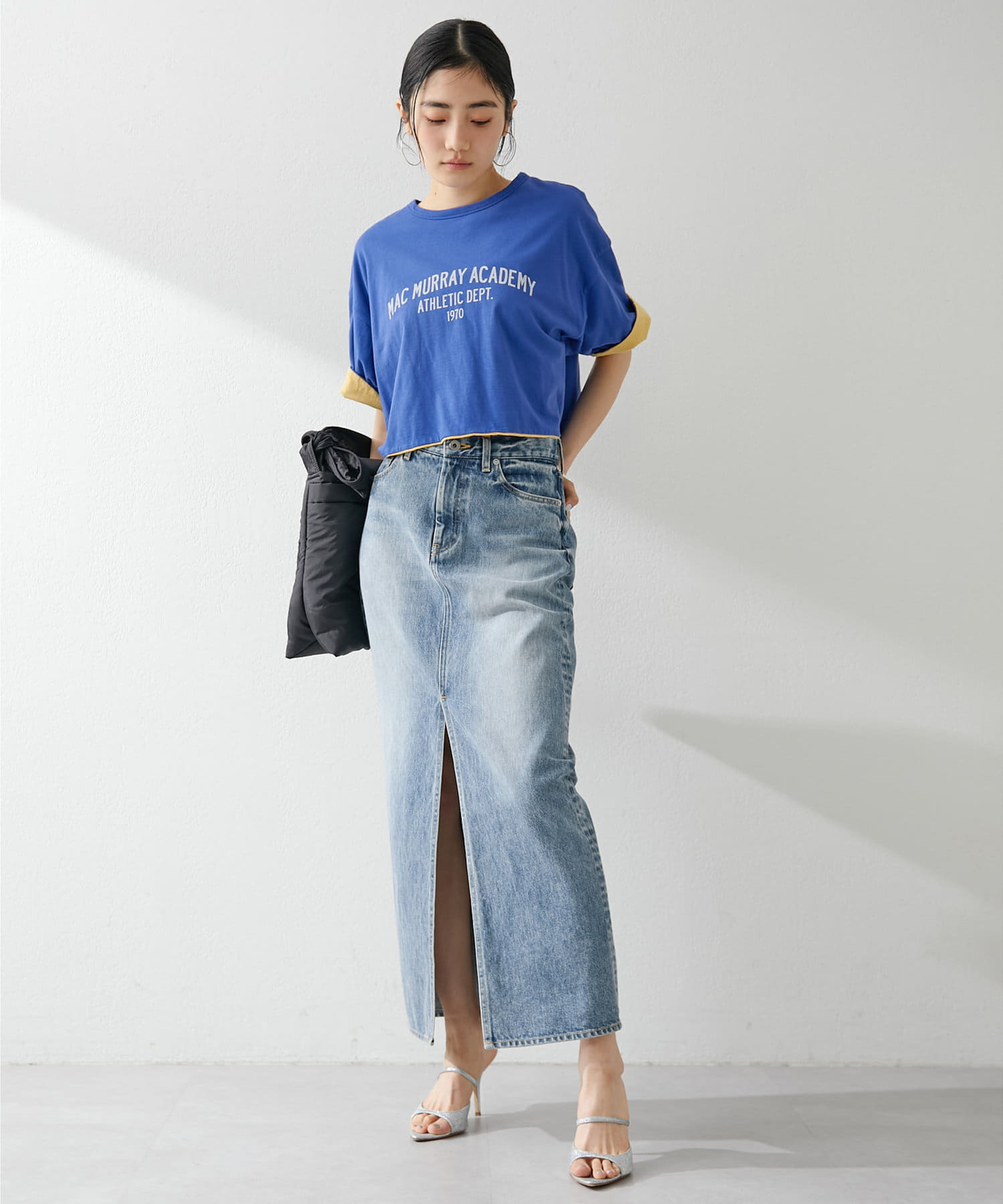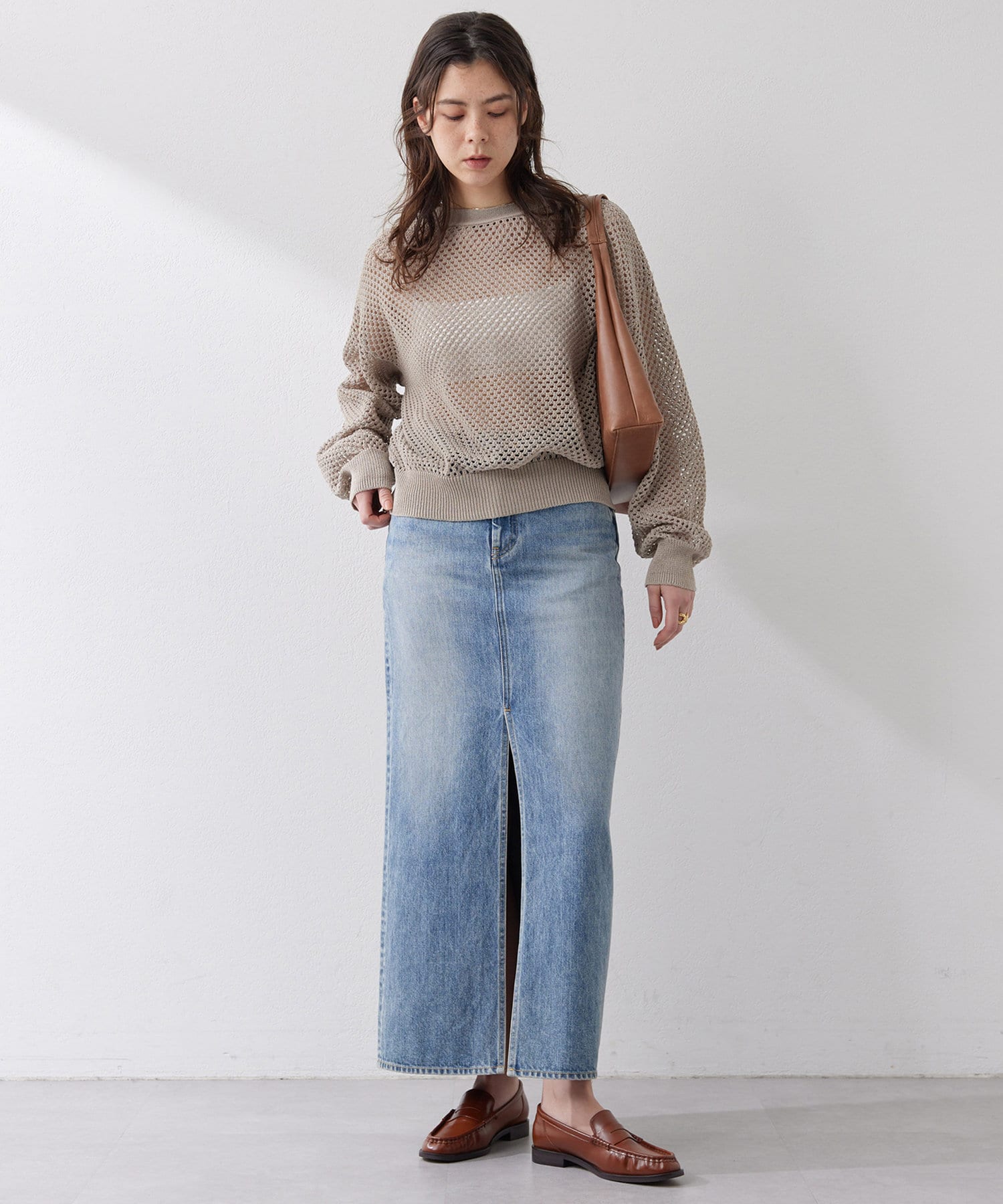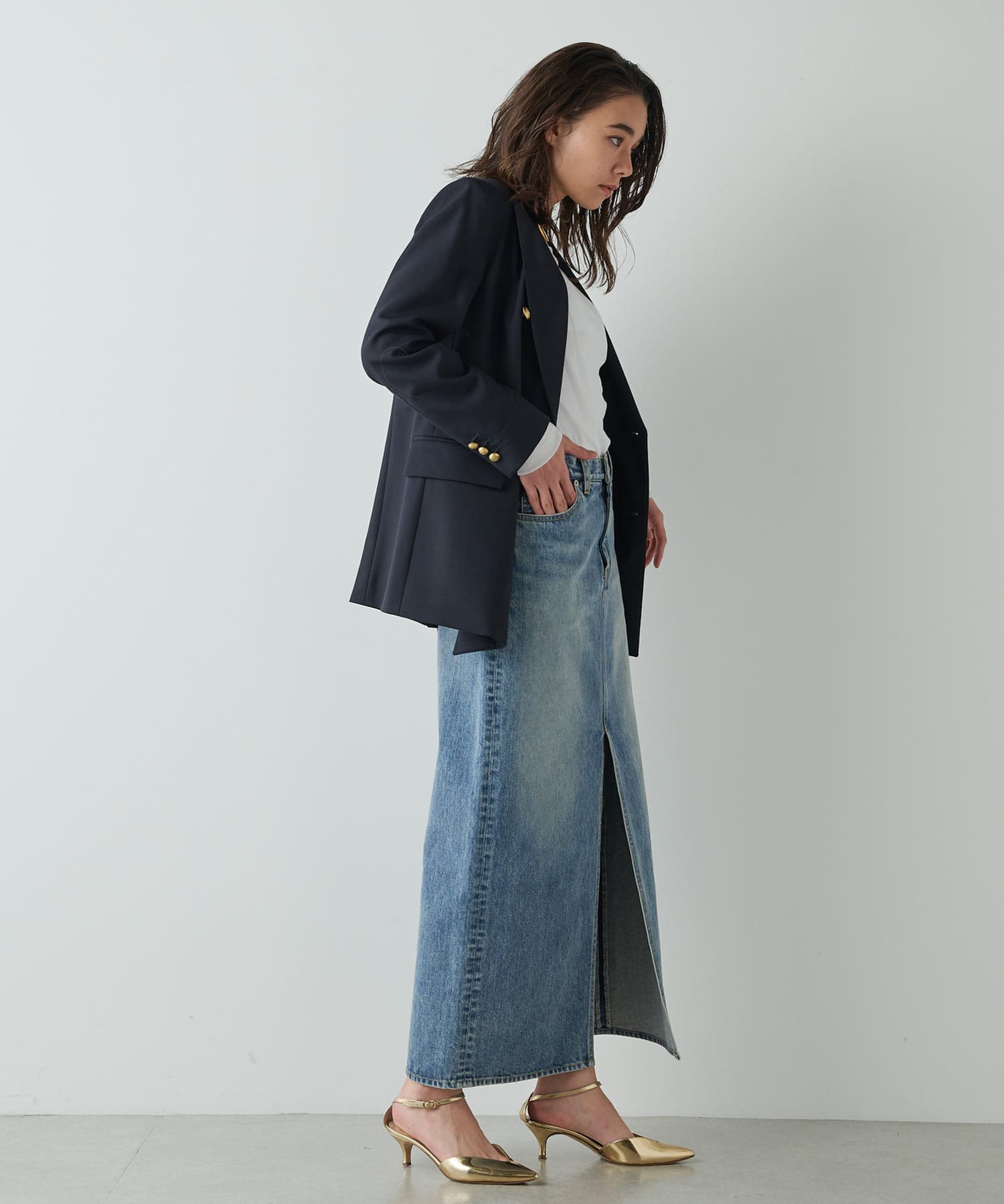 スッキリとした美シルエットのデニムスカートです。スリットが足捌き良く、抜け感を出してくれます。普段デニムパンツを履かれない方は、デニムスカートでコーデの幅を広げられるのも素敵ですね!