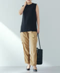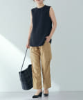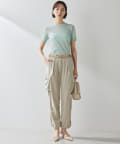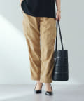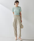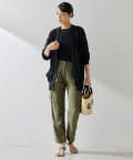 フロントタックが入っているので腰周りのシルエットをカバーしてくれるのが嬉しいポイントです!私の場合38でジャストサイズ、裾のボタンを絞ってますが、絞らなくてもきれいなシルエットで履ける丈感でした。軽くて柔らかく、肌触りも良いのでシーズンレスに快適に楽しめるアイテムですよ。