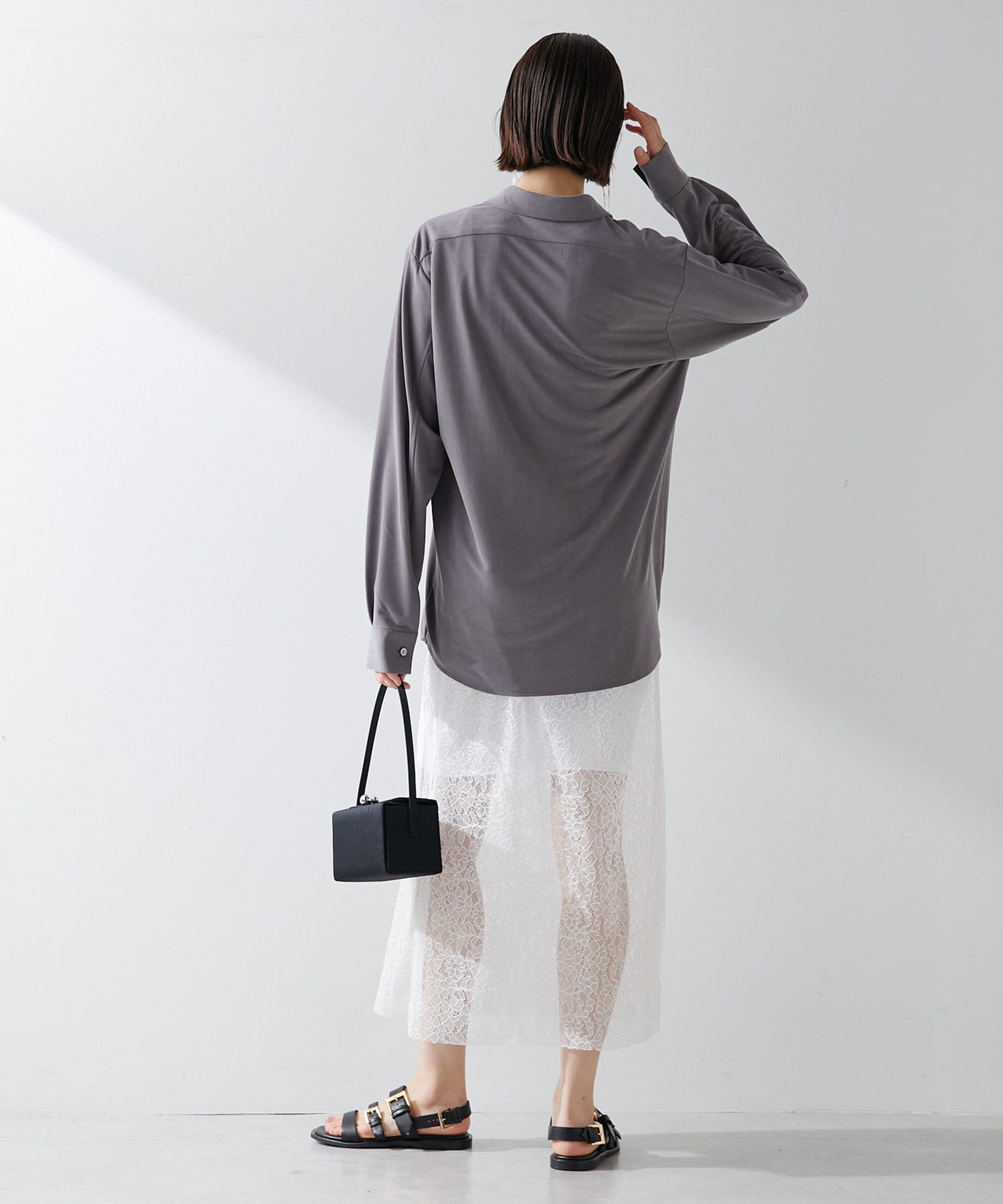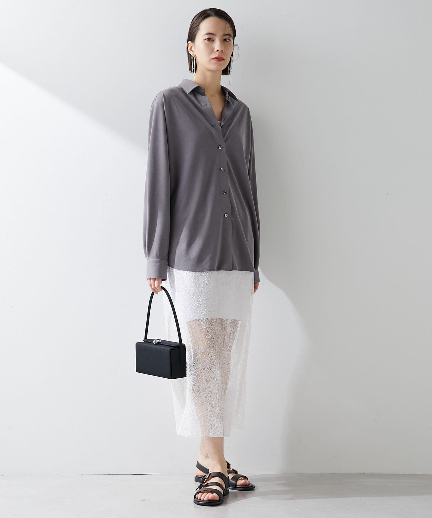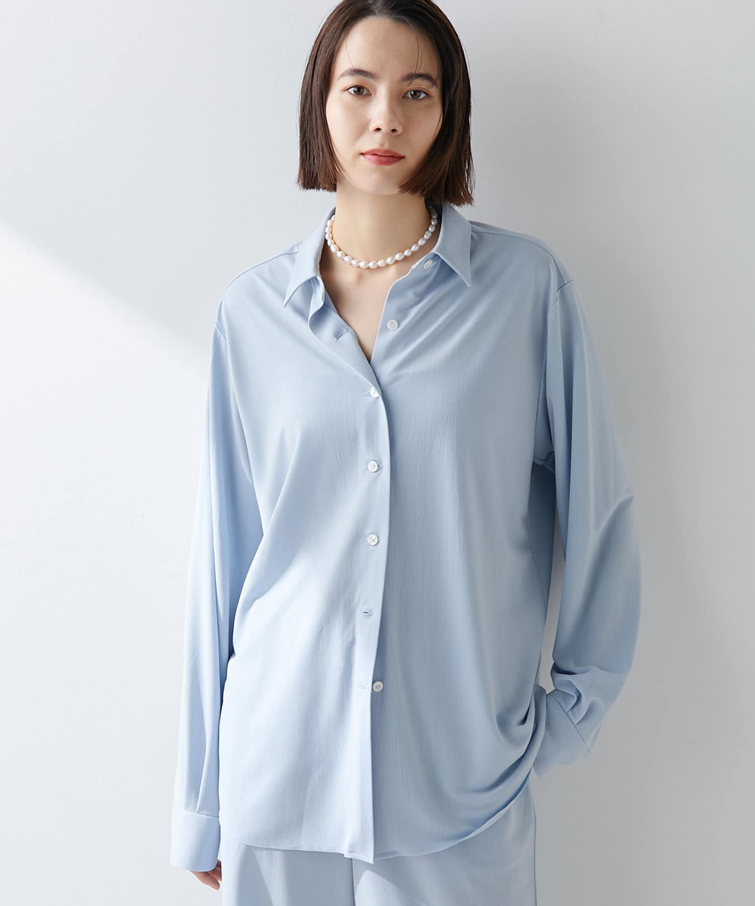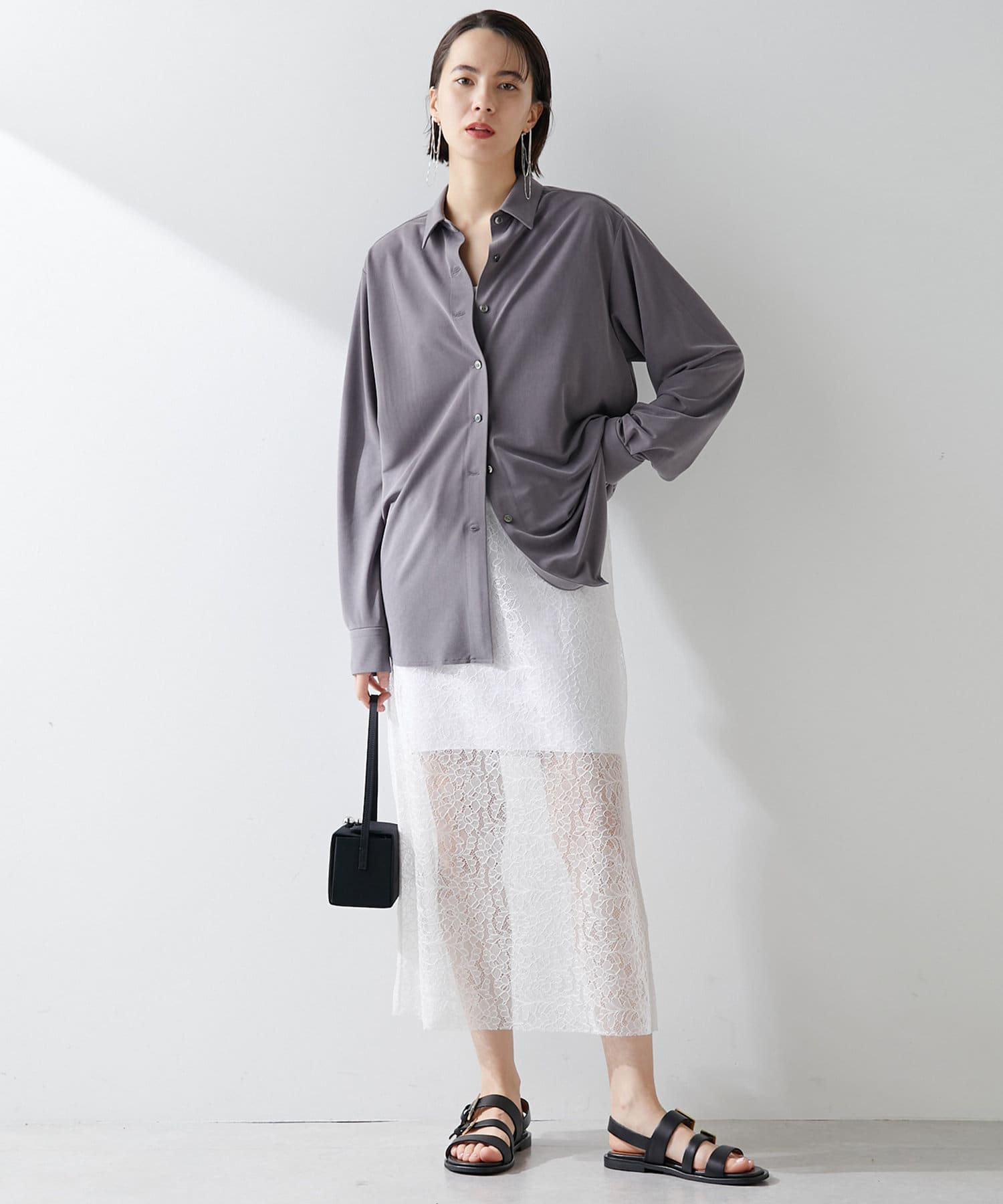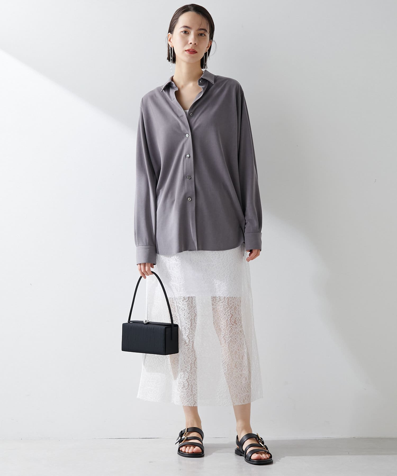 とろみがあり着るだけで様になるシャツです。ダボっとしすぎていないのでとろみがあってもだらしなく見えません。インせず合わせてもすっきりして今年らしい着こなしができます。デニムやチノパンなどのカジュアルアイテムとの合わせも、またワンランク上のお洒落さんになります◎
