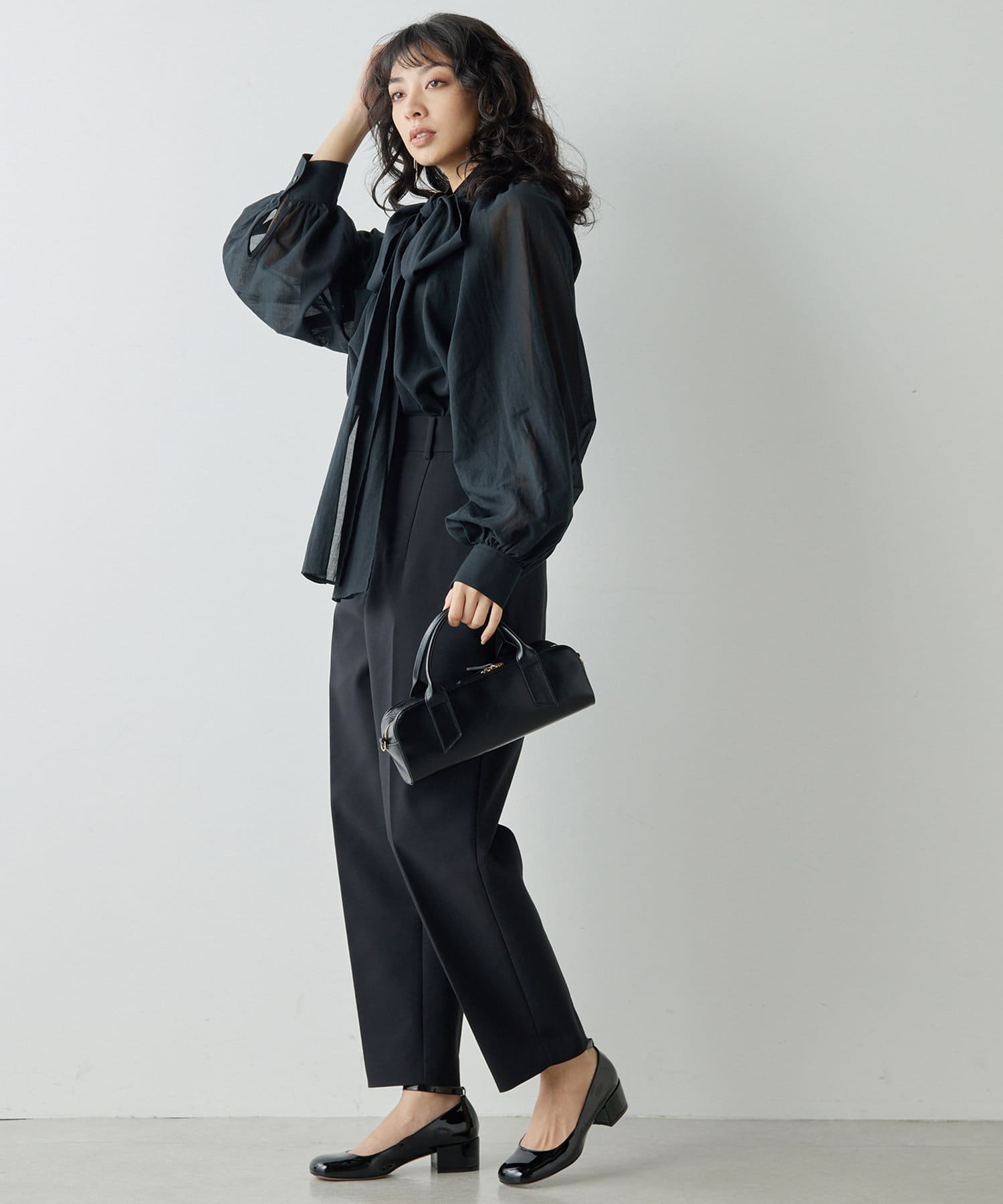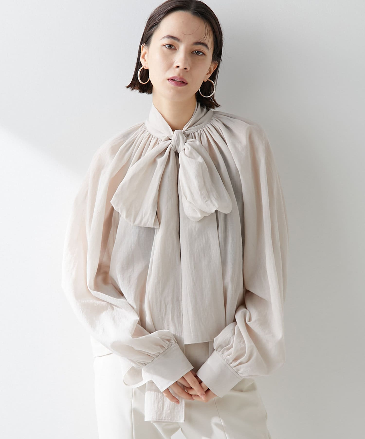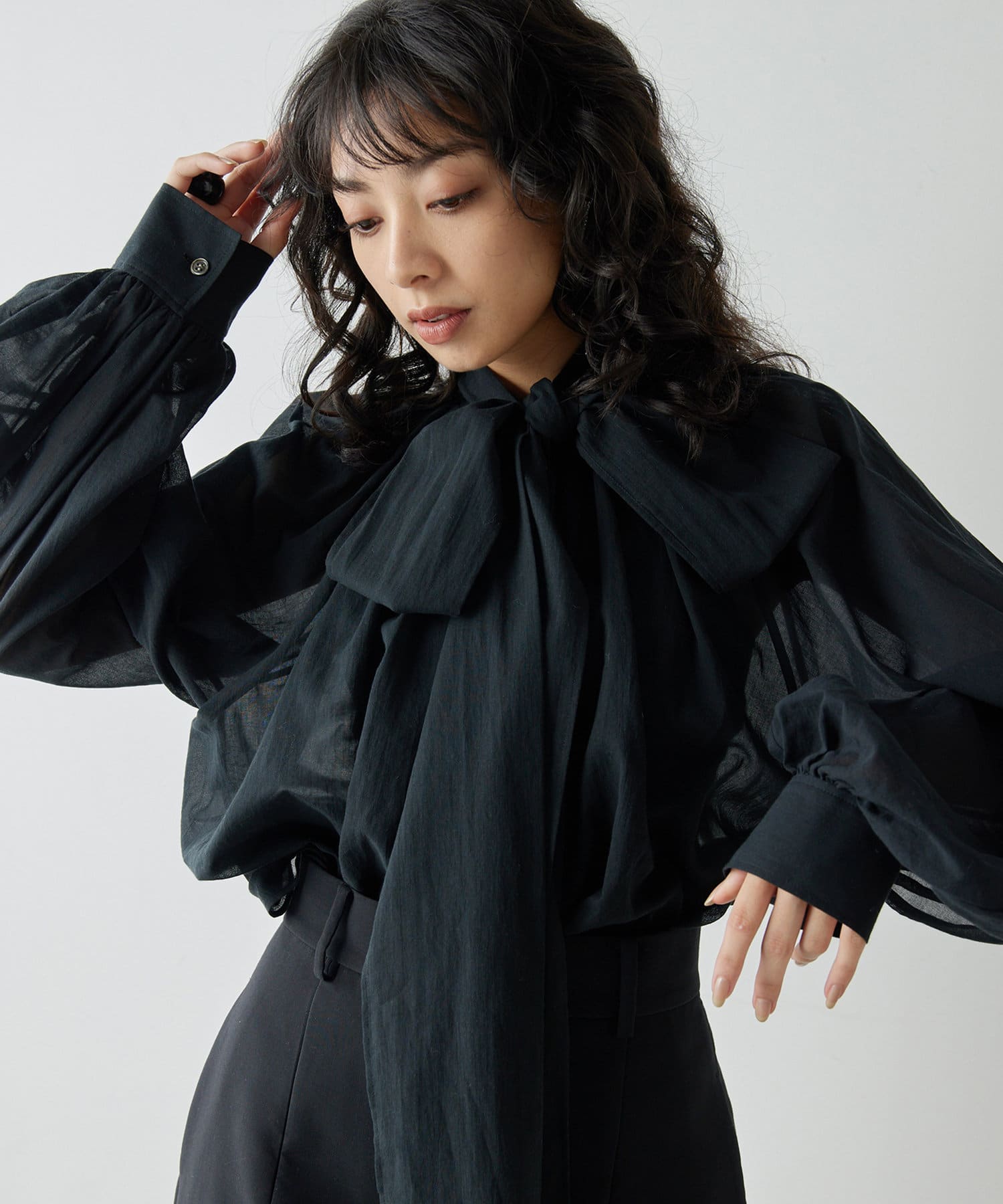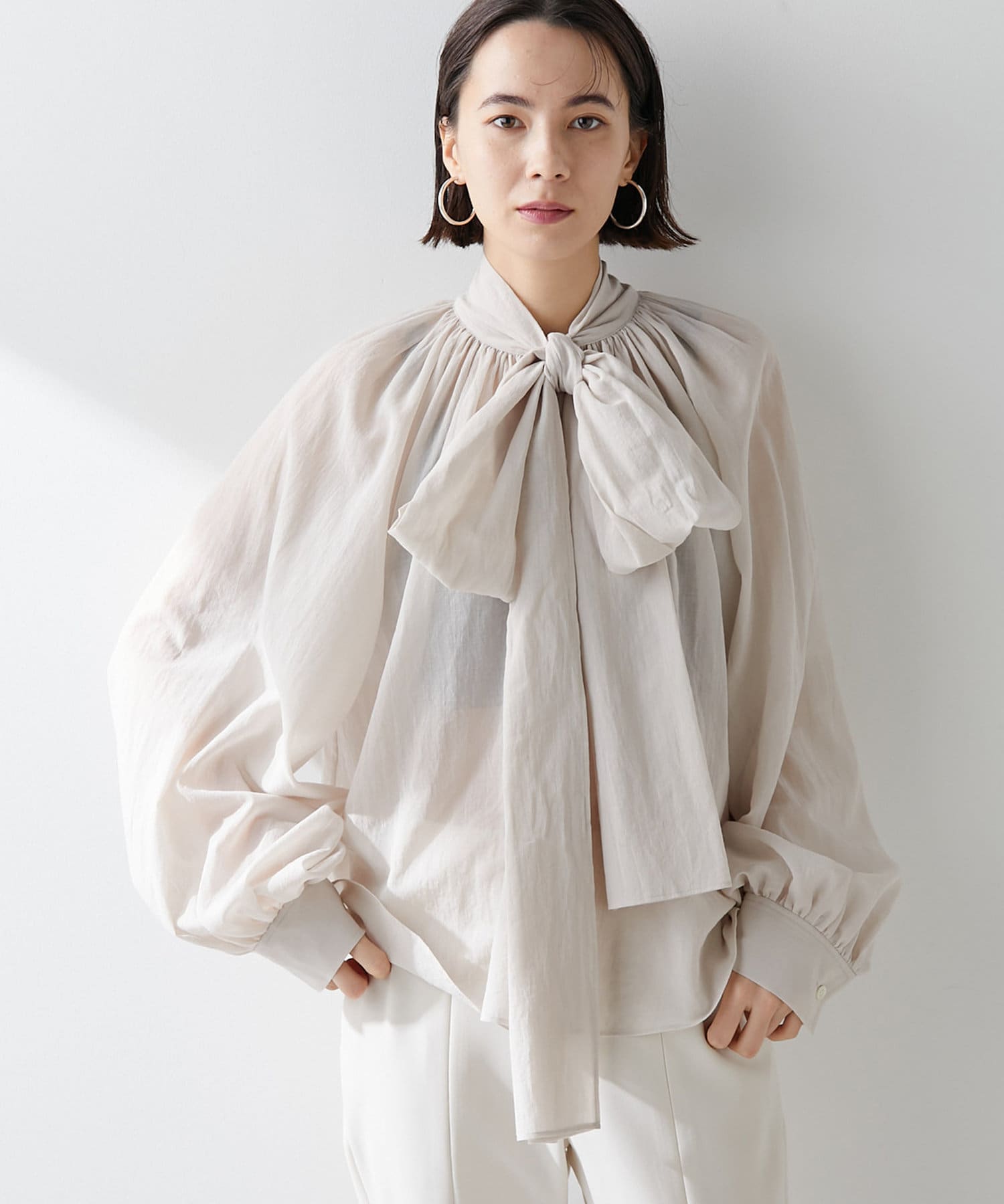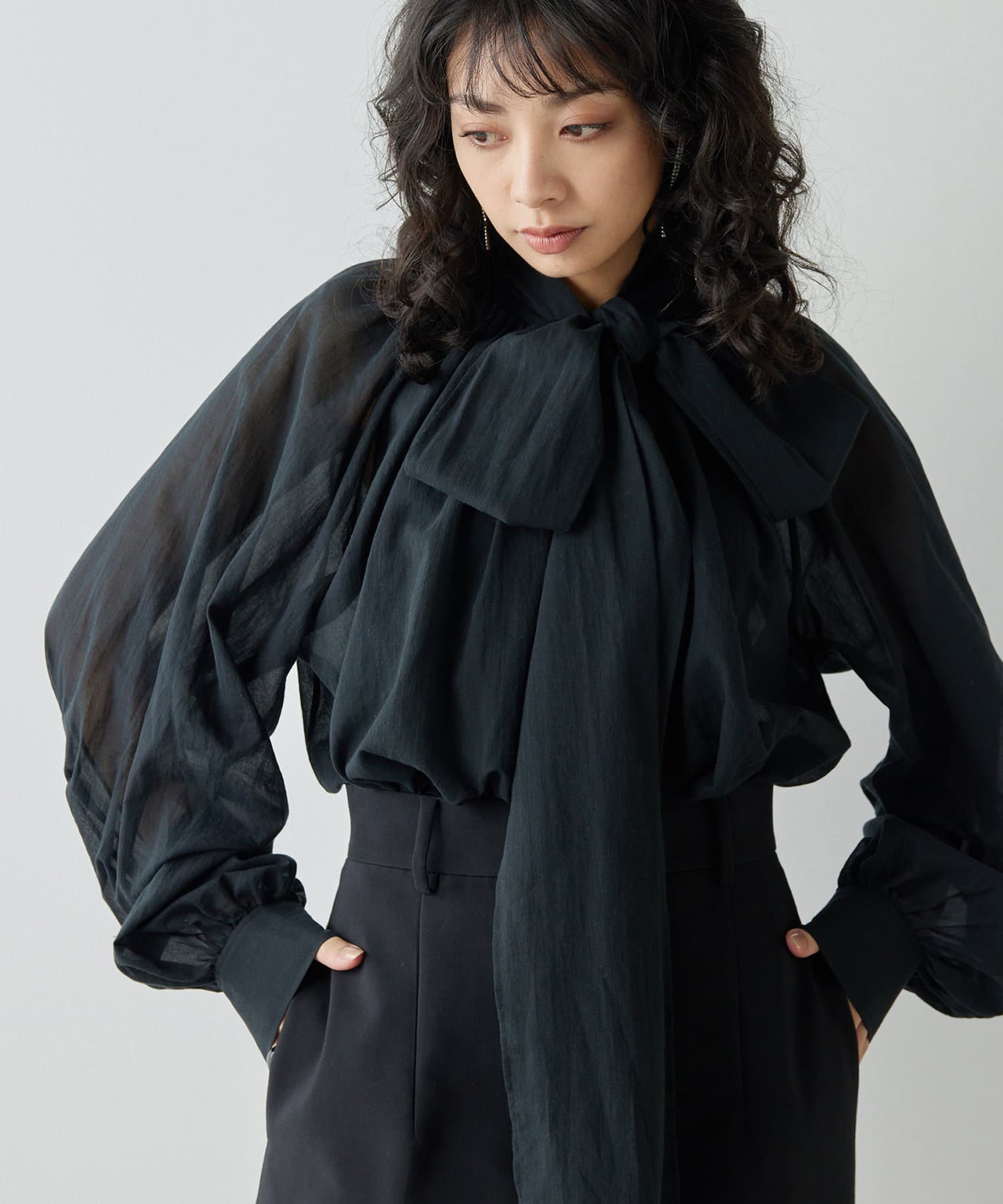 ■ほんのり透け感のある素材とボウタイのディテールが女性らしいブラウス。