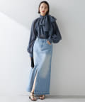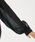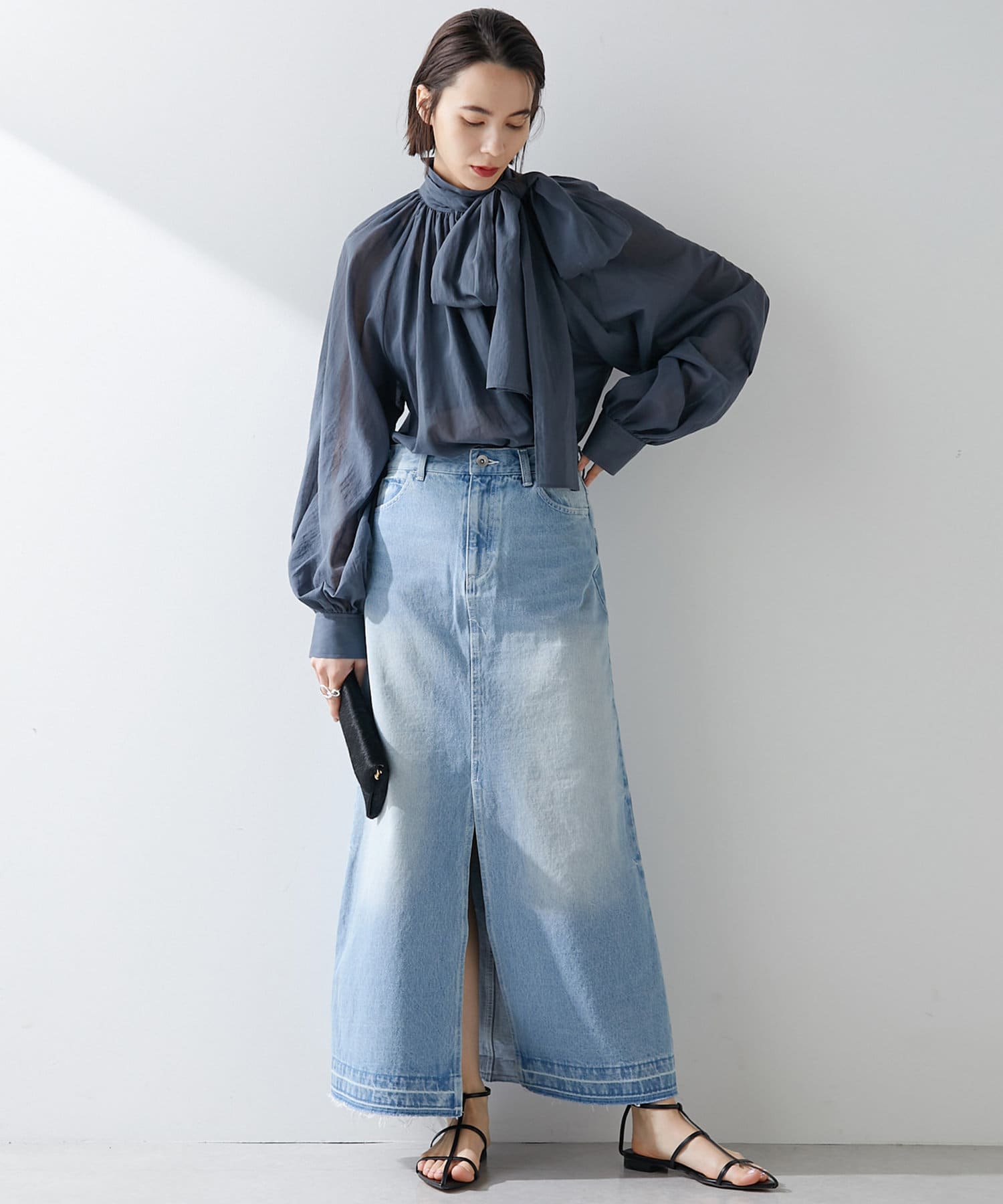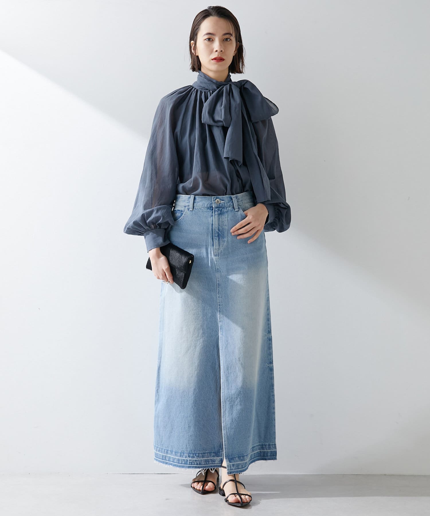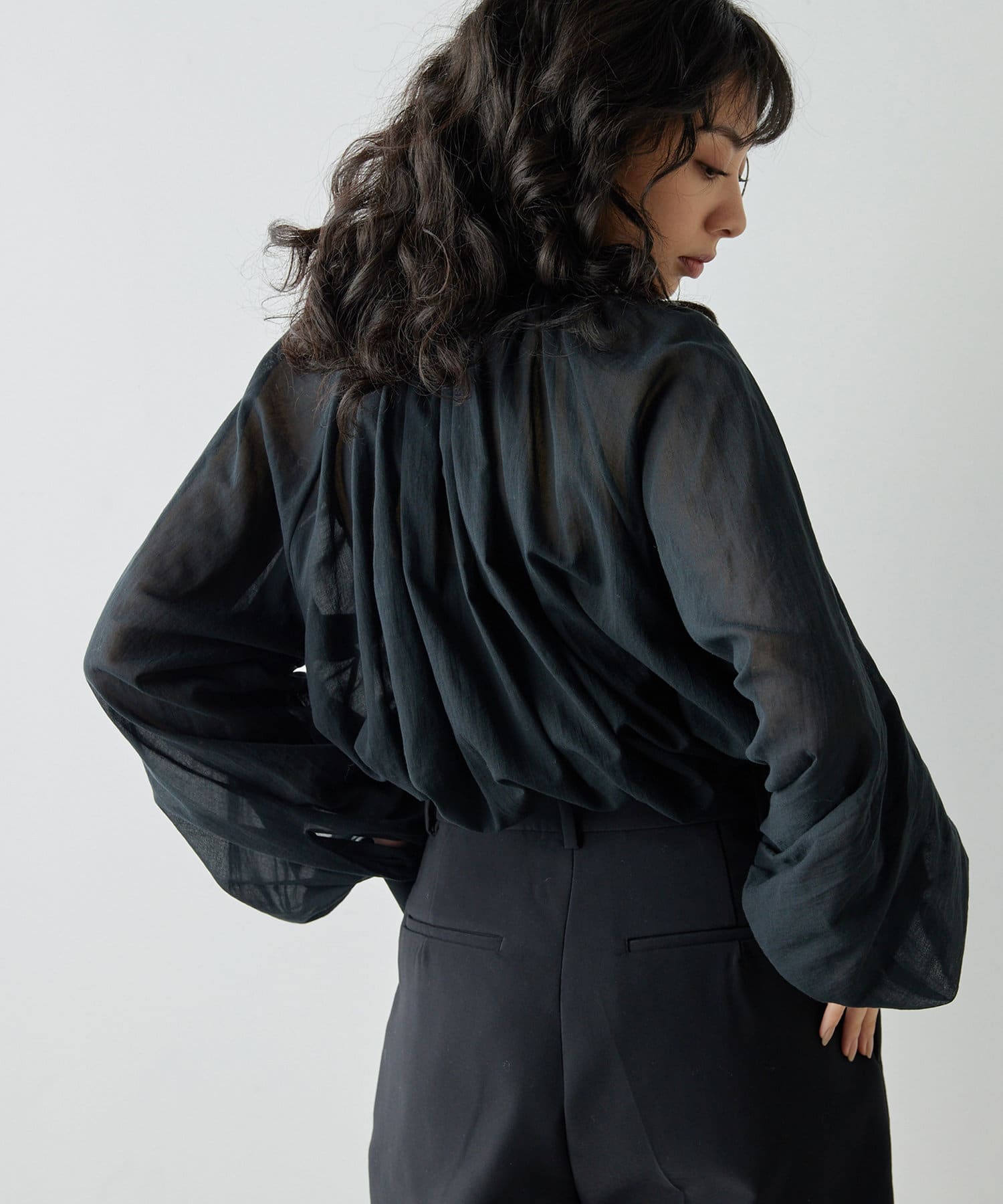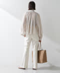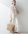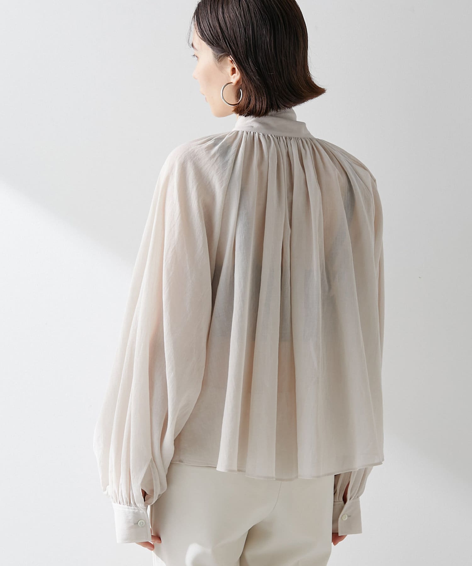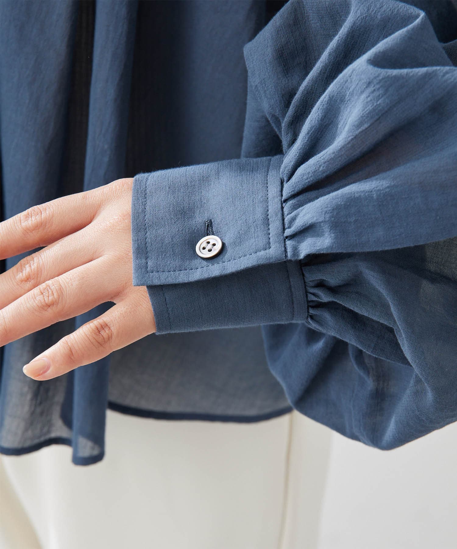 シアー感は透け過ぎないためいやらし過ぎずオフィスシーンにも活躍します。ガーゼのような素材感なのでシワも目立ちにくくラフに合わせていただけます。ふんわりと袖が雰囲気のある綺麗めコーデに。