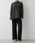 シアー感とスタイリッシュさが目を引くブラウス。抜け感があり、上品さとクールさの印象を与えるトップスです。オーガンジーなので一枚で着映えます。このデザイン性でご自宅でのお手入れが可能なのは嬉しいですよね!