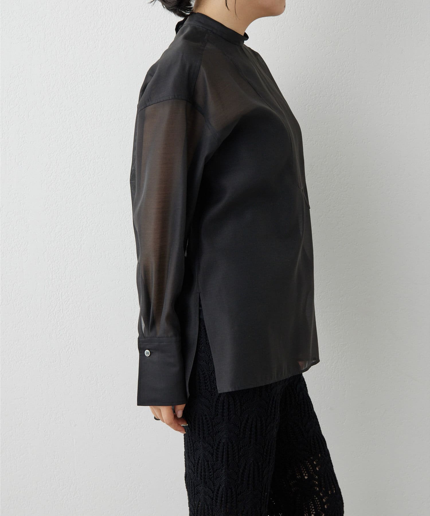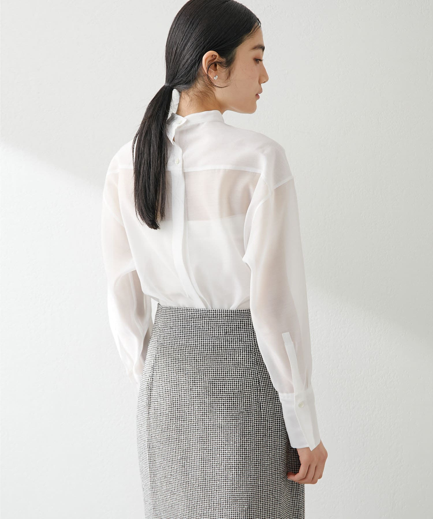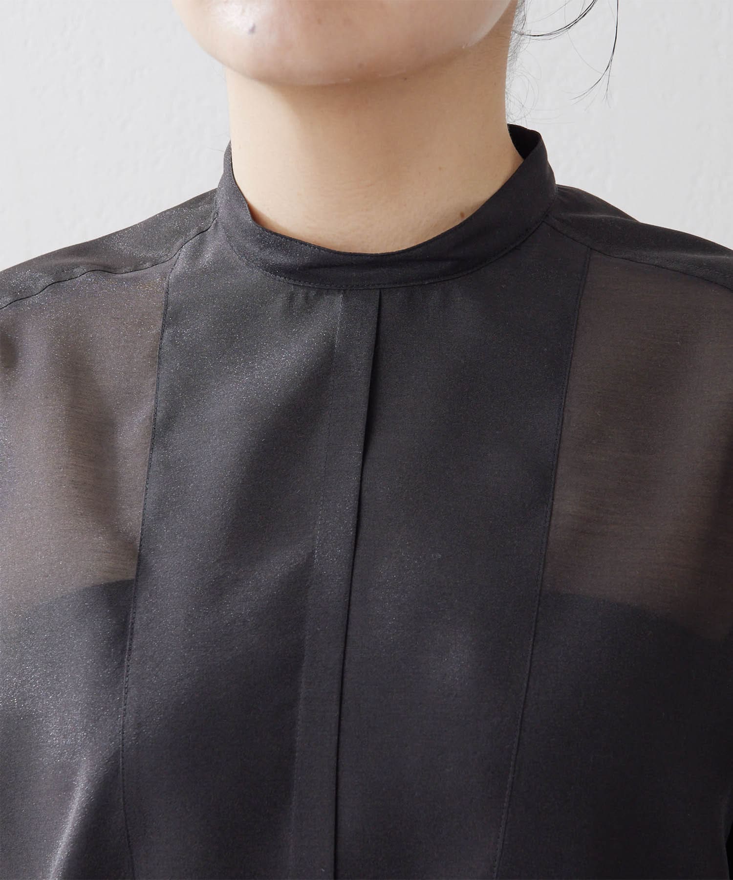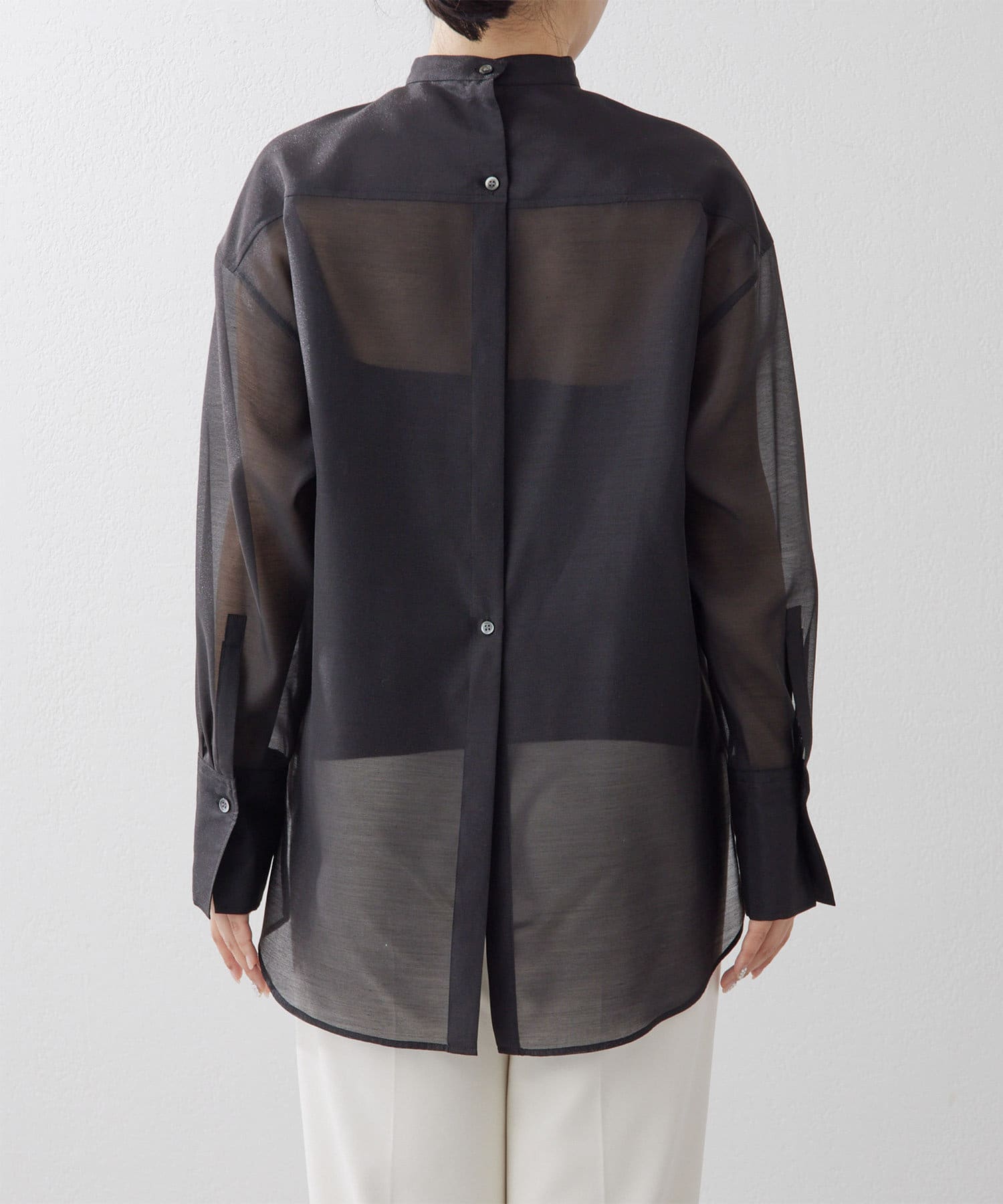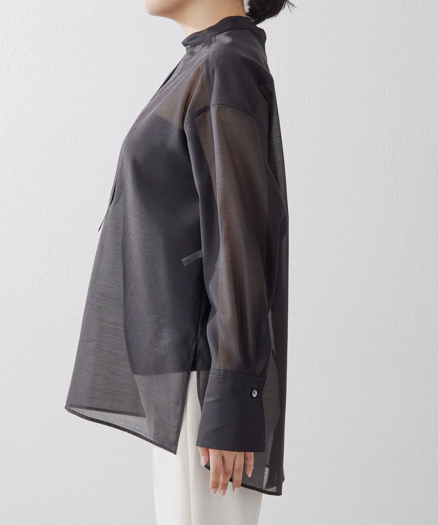 毎年人気のオーガンジーシャツ。程よい透け感が心地よく、春夏にピッタリの1枚。スタンドカラーできちんと感もあるので、オフィス使いにもおすすめです。