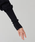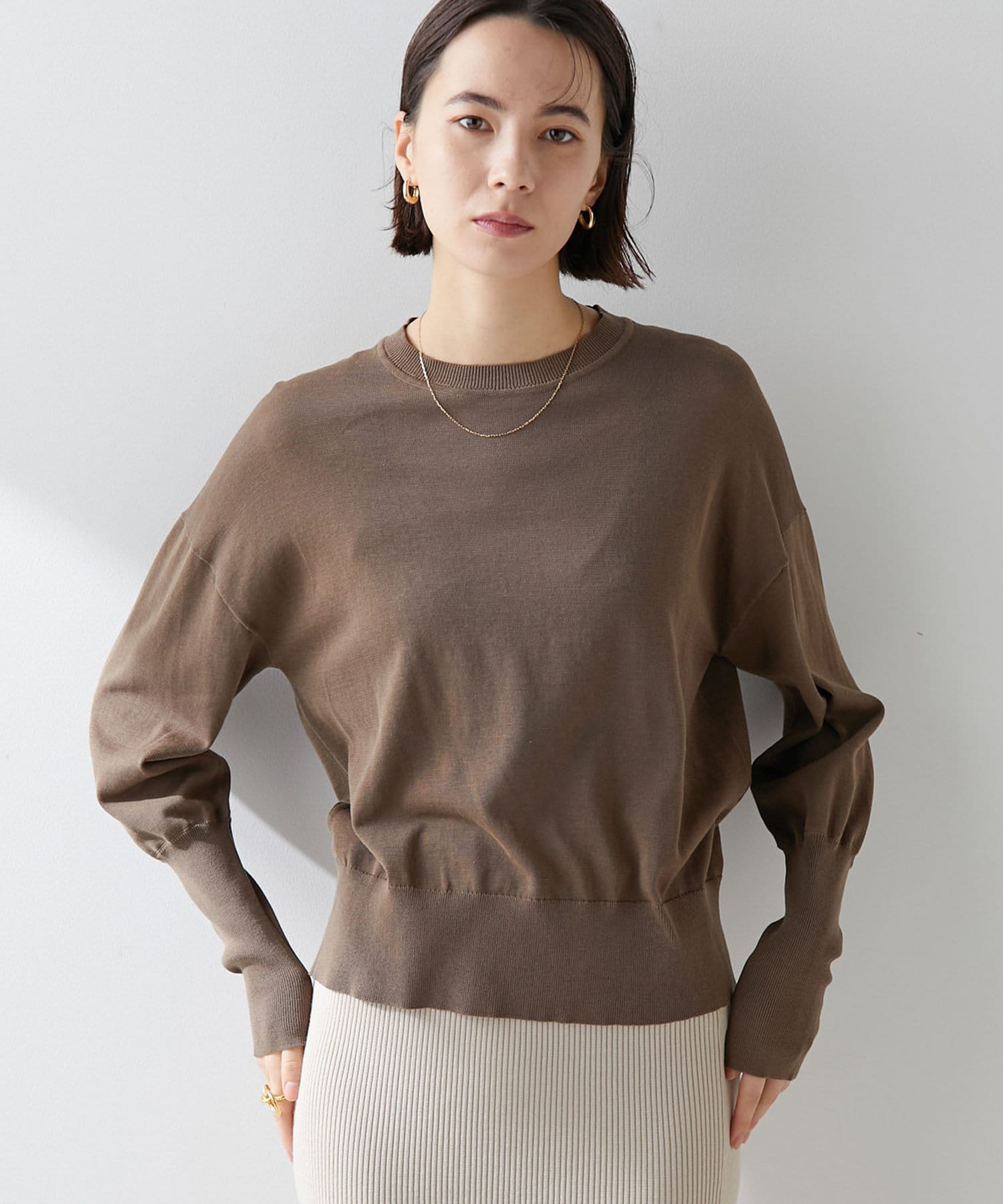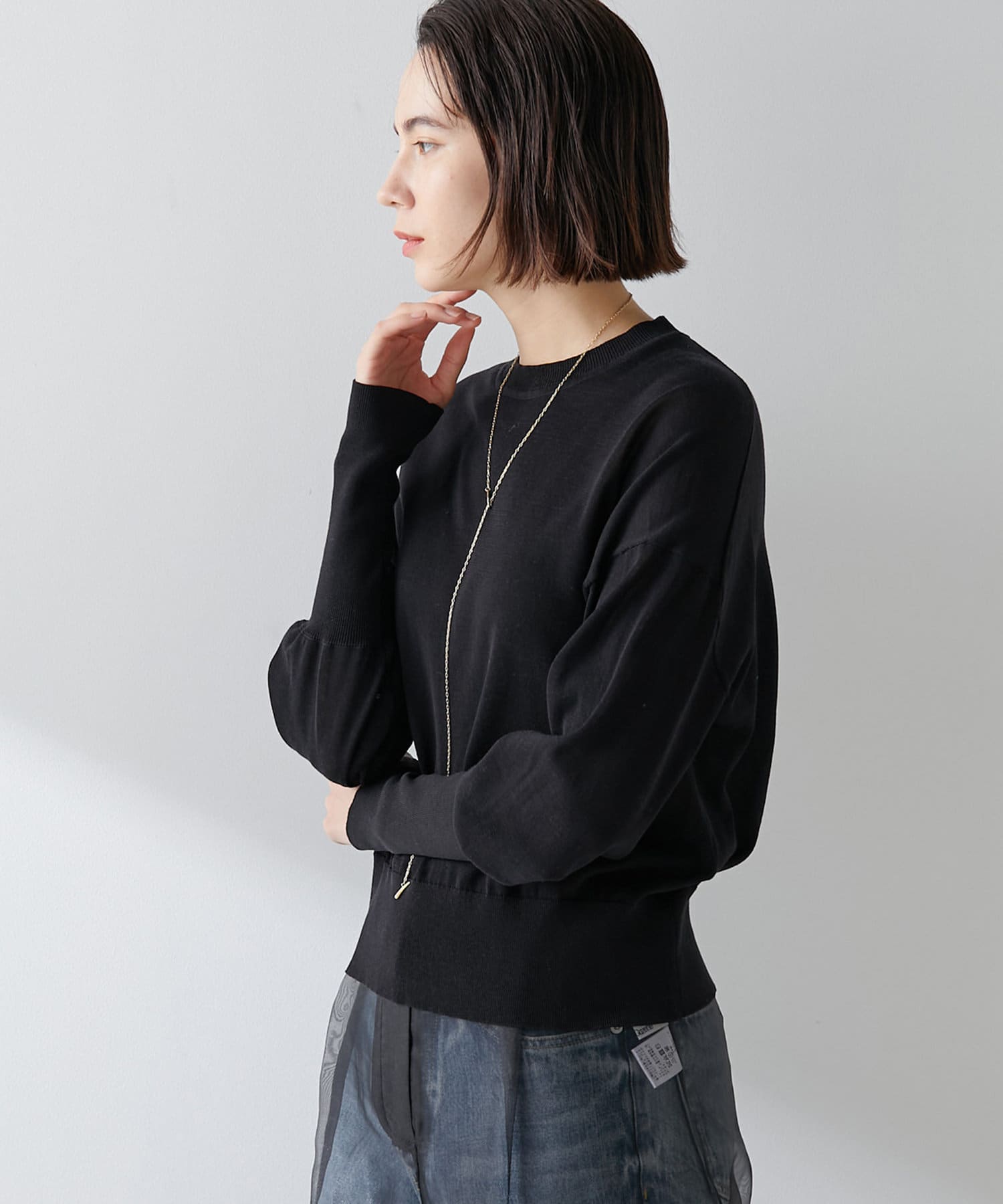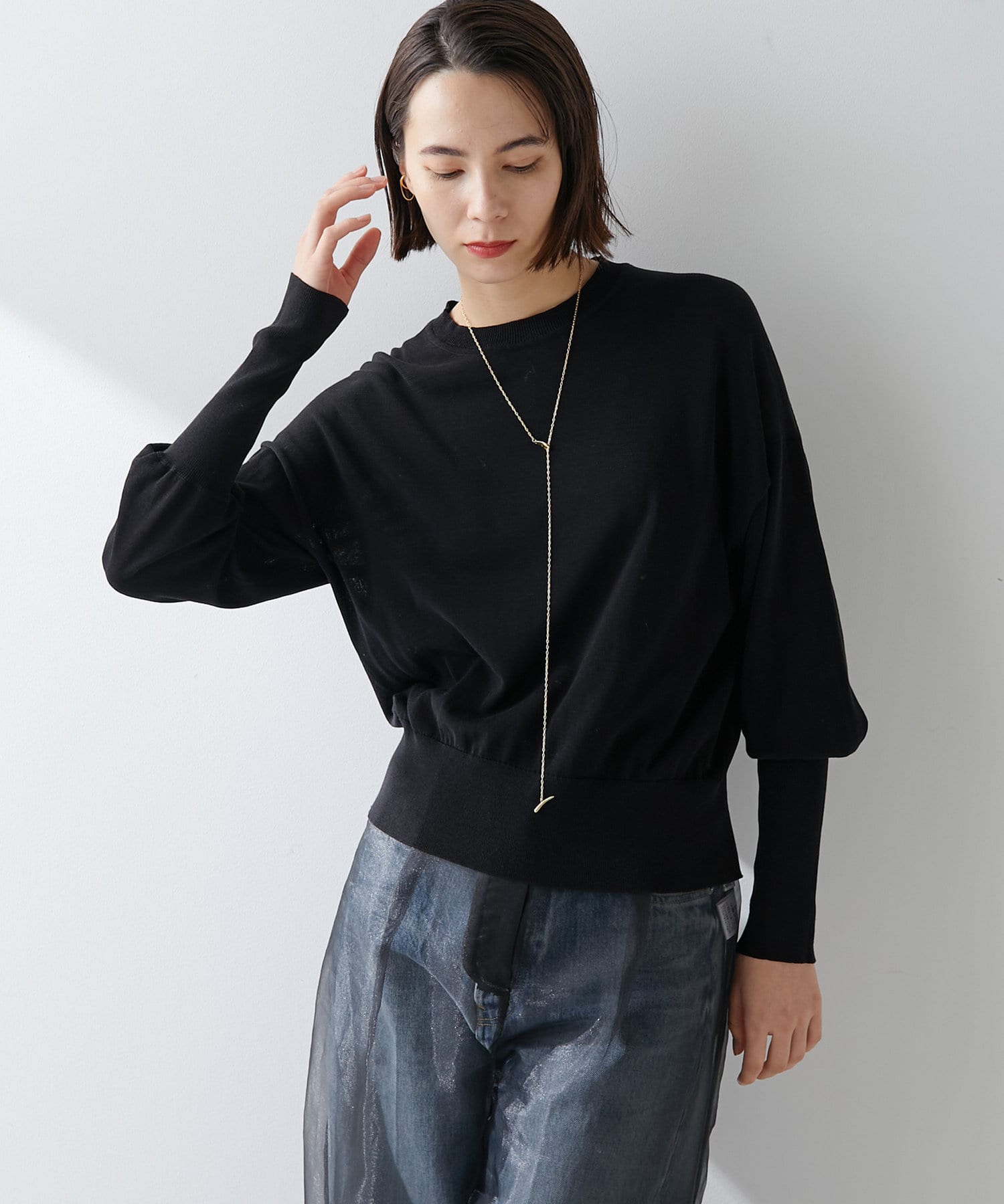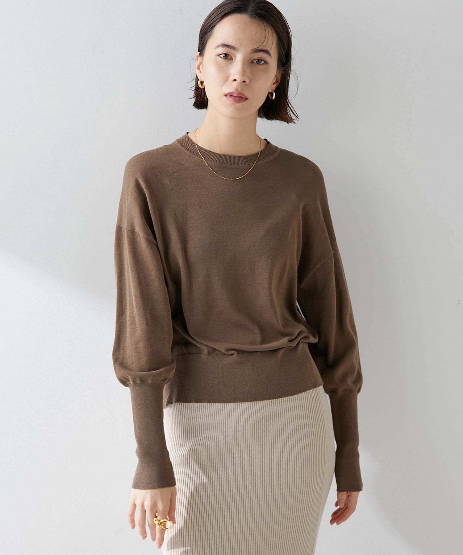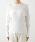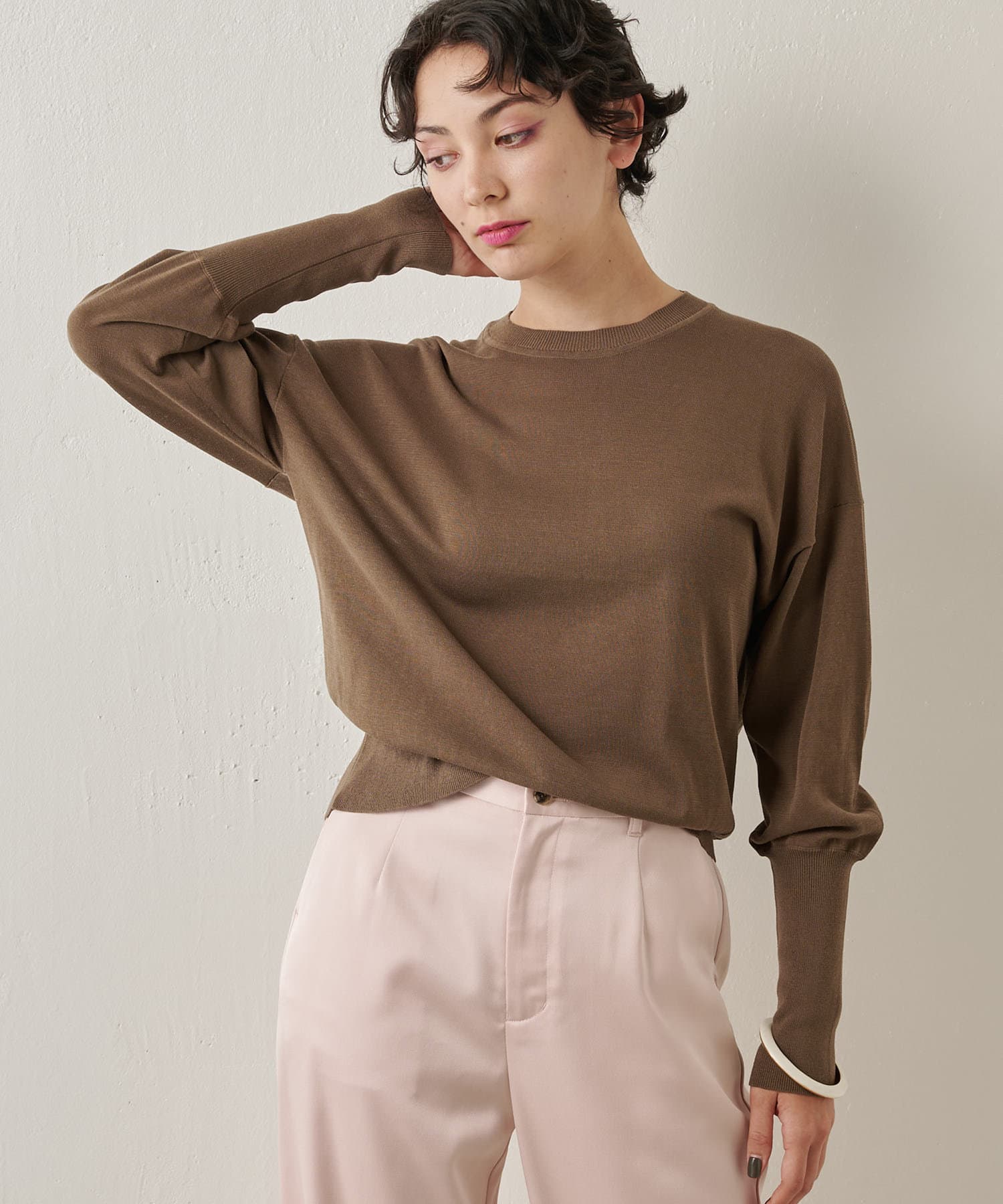 ■ミニマルな印象のクルーネックに、手首を華奢に見せる袖口の長めのリブがシルエットのポイントに。