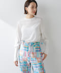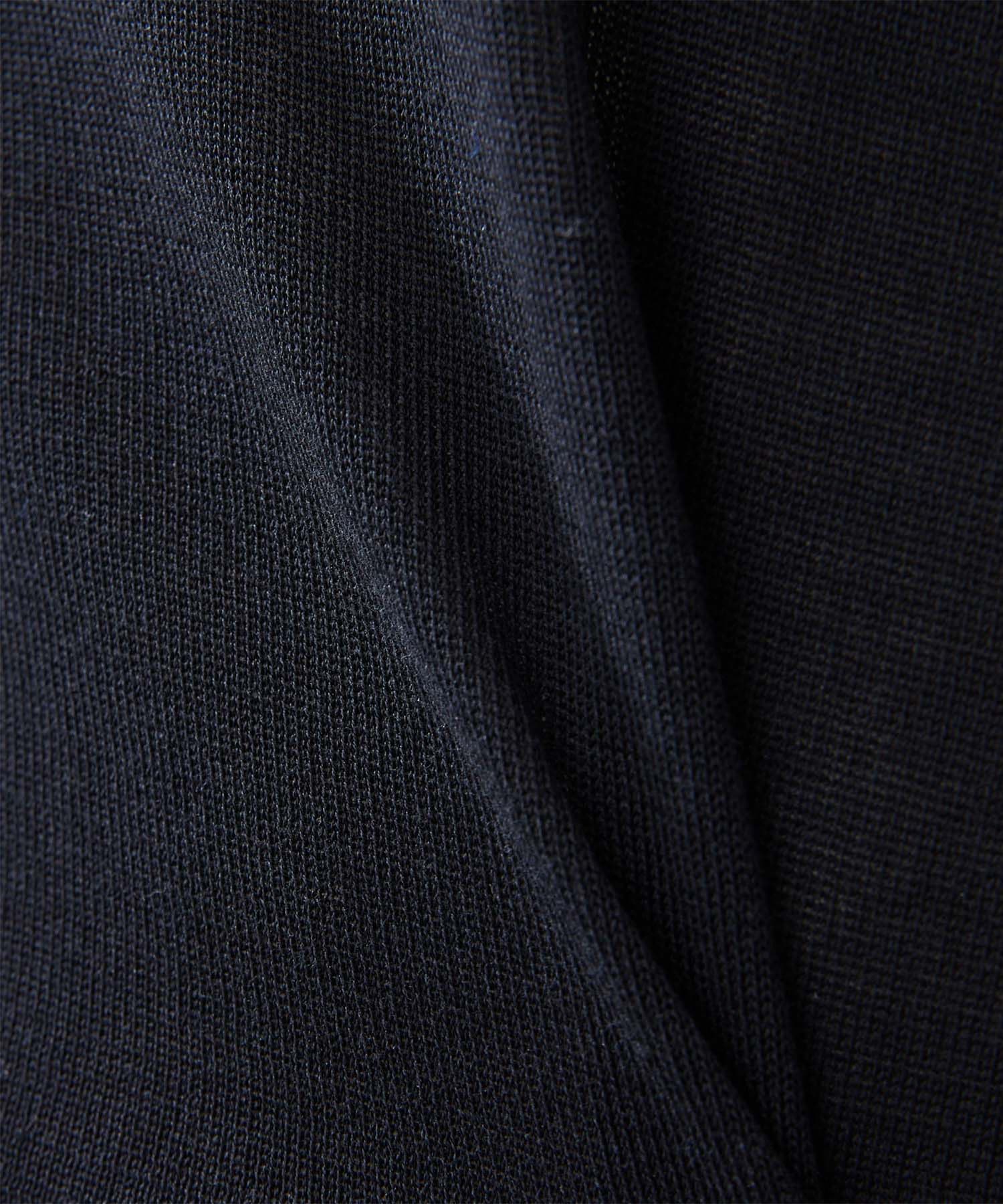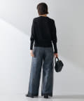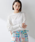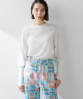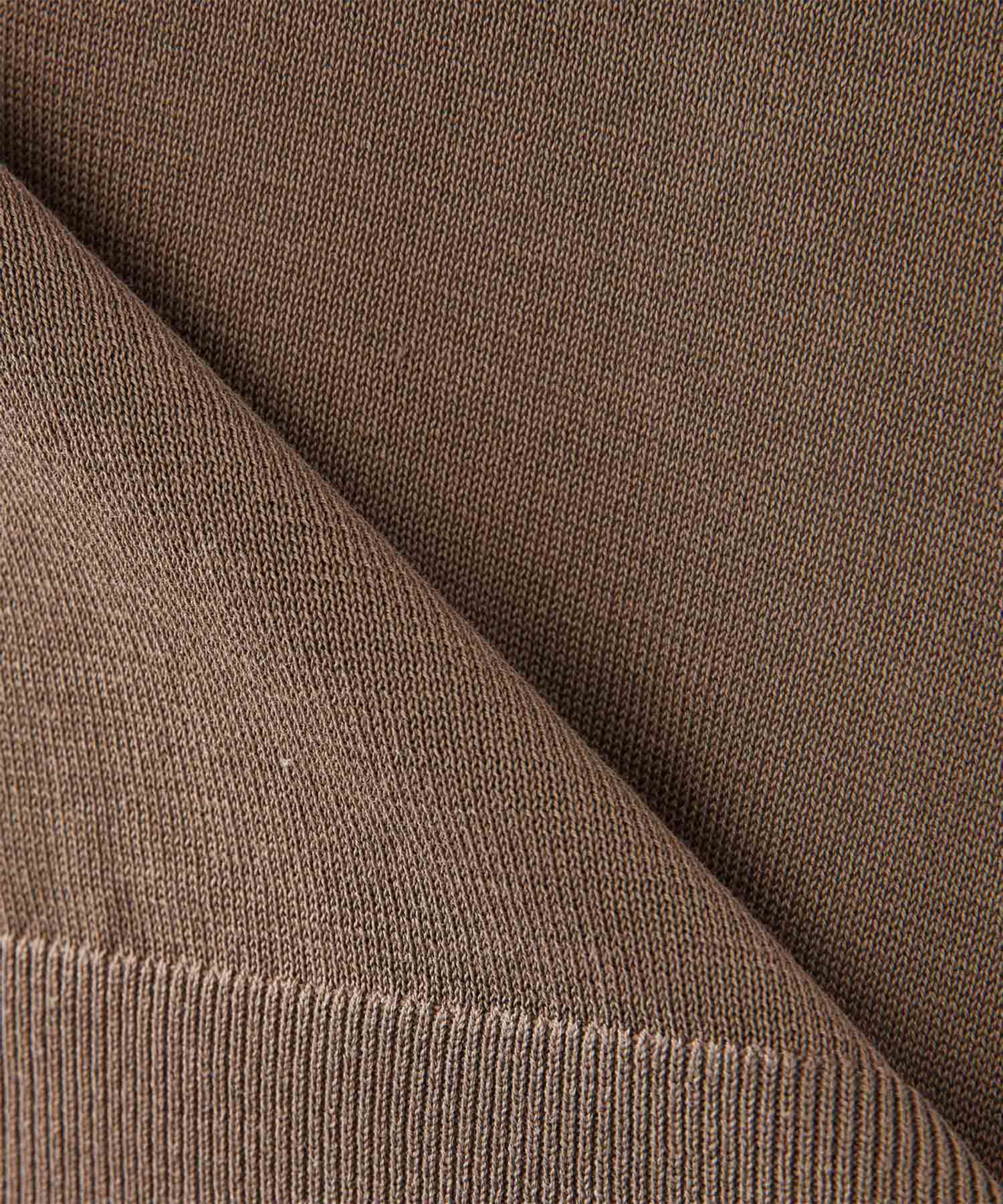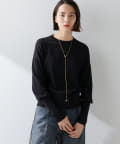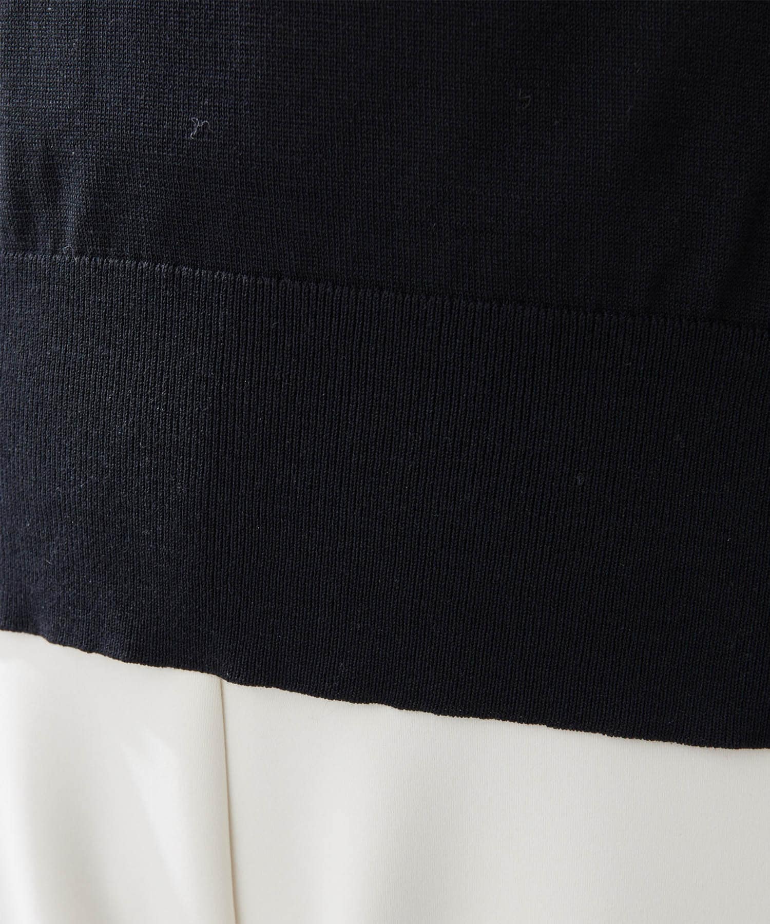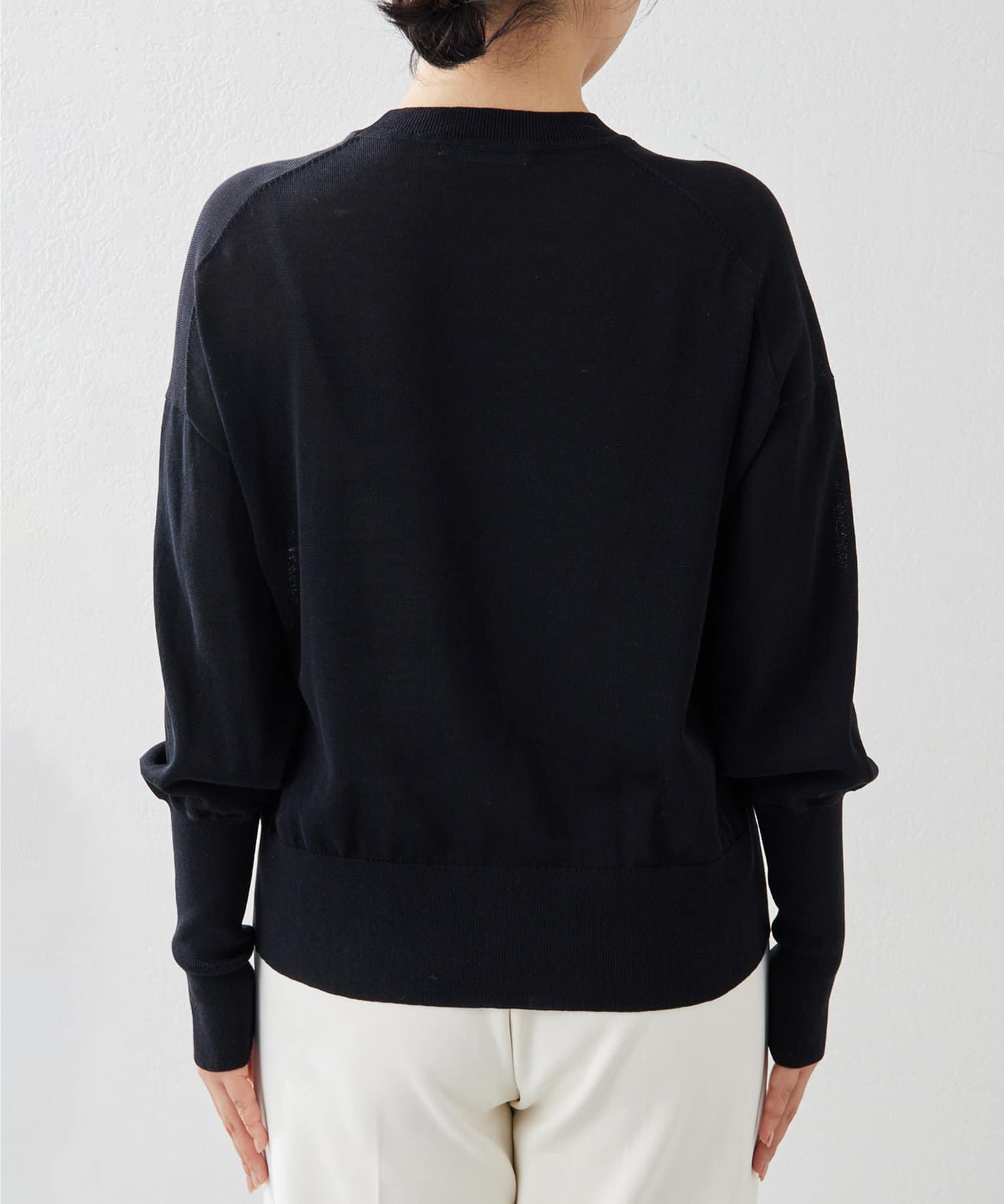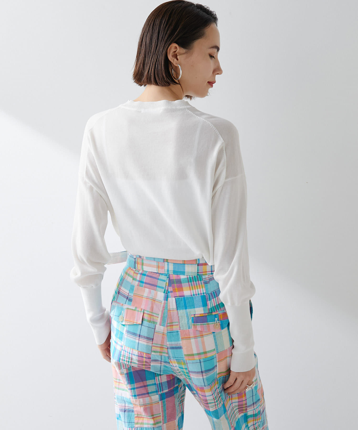 ■ミニマルな印象のクルーネックに、手首を華奢に見せる袖口の長めのリブがシルエットのポイントに。