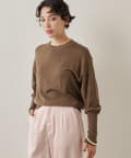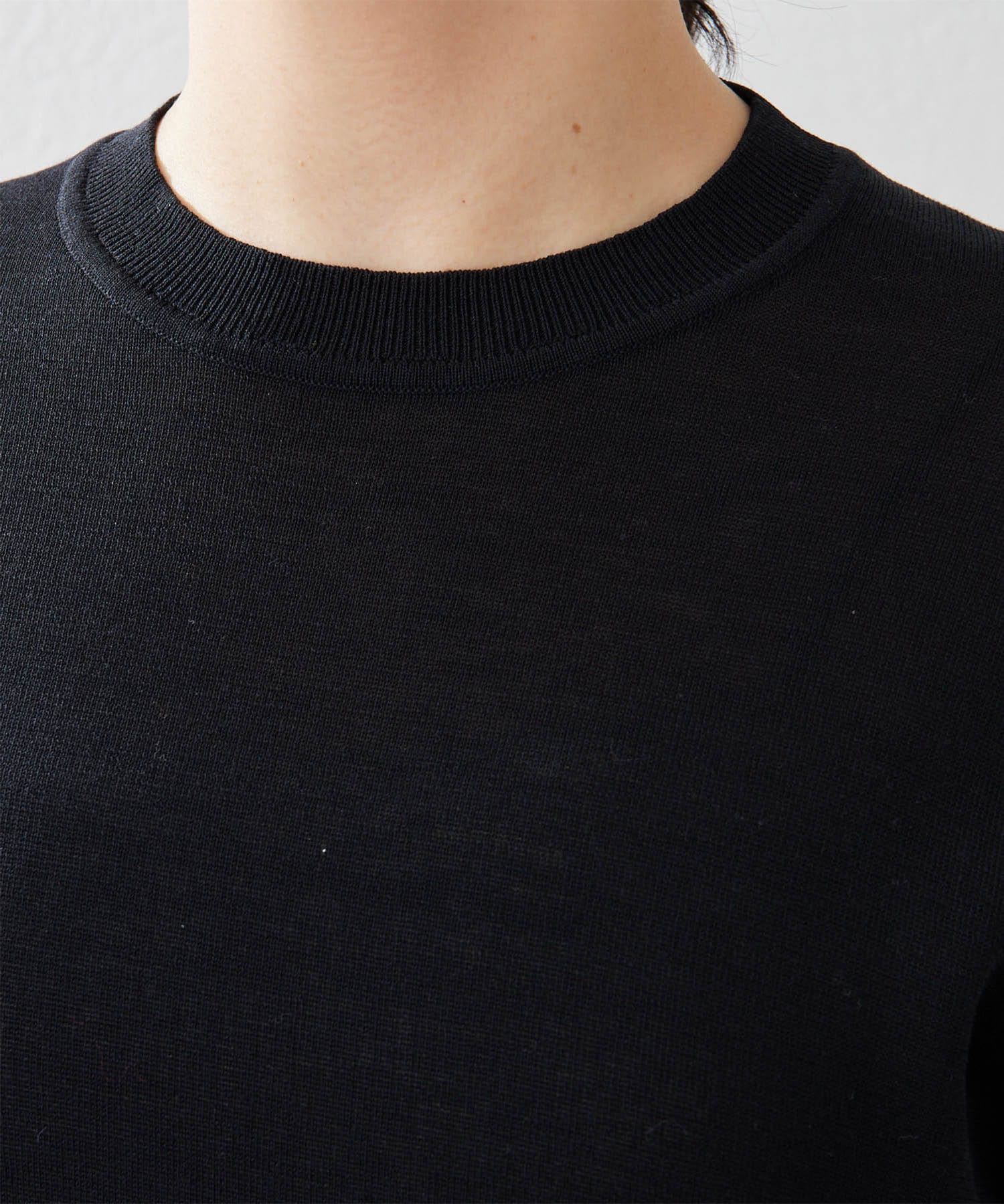 トレンドレスなコンパクトニット。少し透け感のあるニットで、羽織のインナー使いとして重宝します。クルーネックも首が苦しくないくらいの開き具合です。